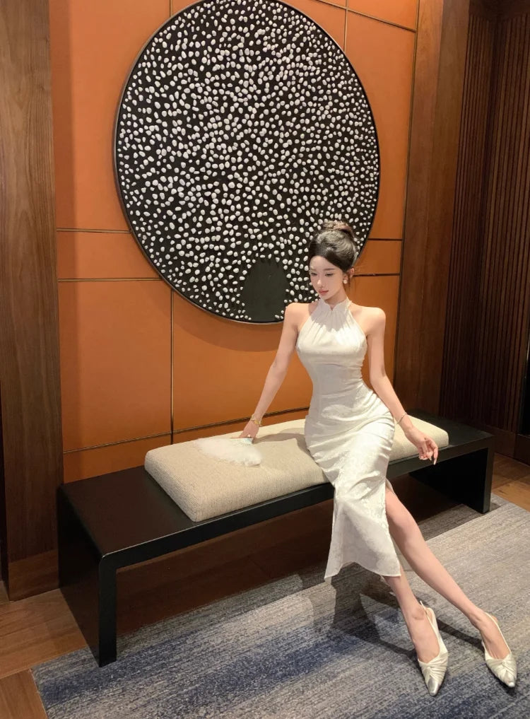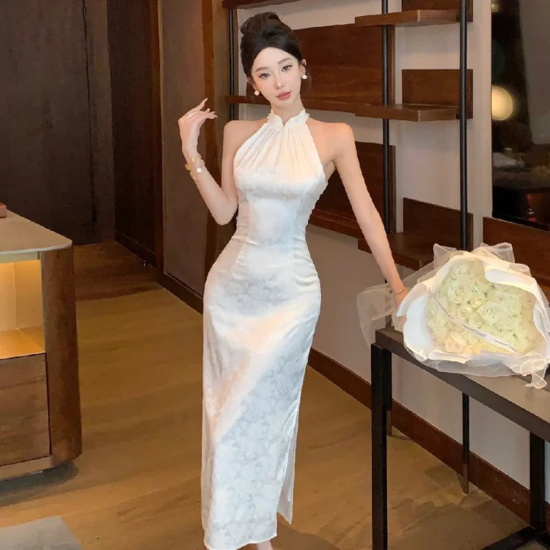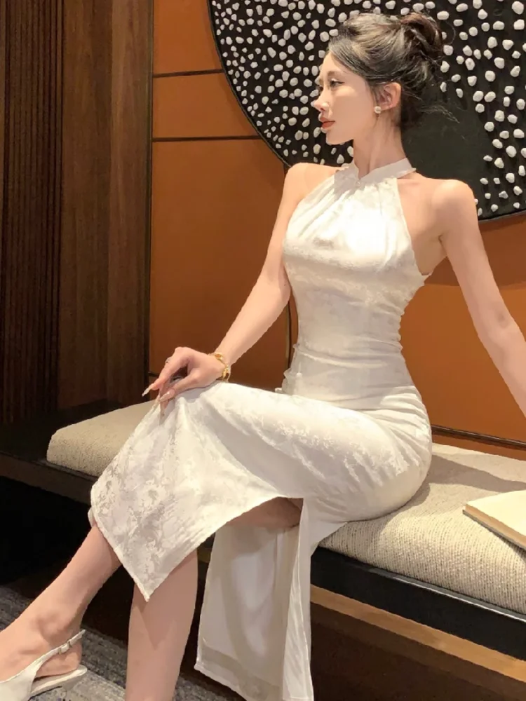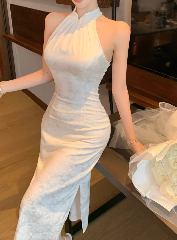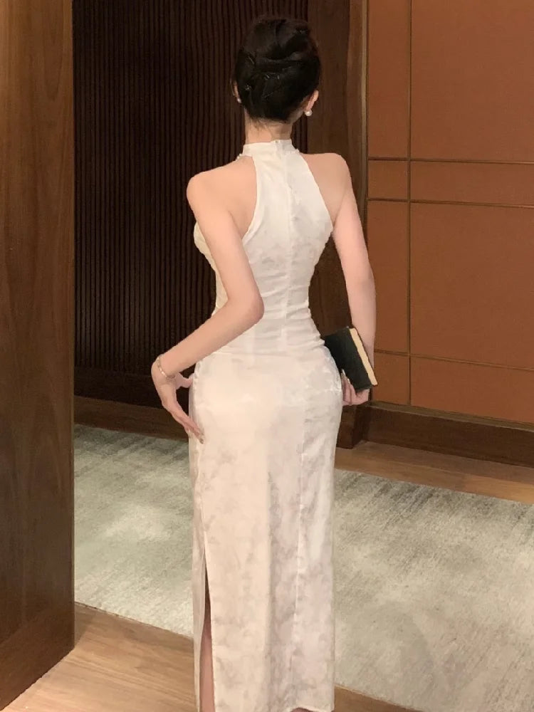 MQTIME - Woman Dress Vintage Sleeveless Stand Collar Elegant Slim Split Summer Fashion Temperament Ladies Party Dress Ladies