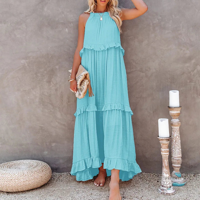 MQTIME  -  Women Boho Solid Color Dress Sleeveless Ruffled Maxi Vestidos Loose Fit Straight Hippie Dresses Layered Princess Robe