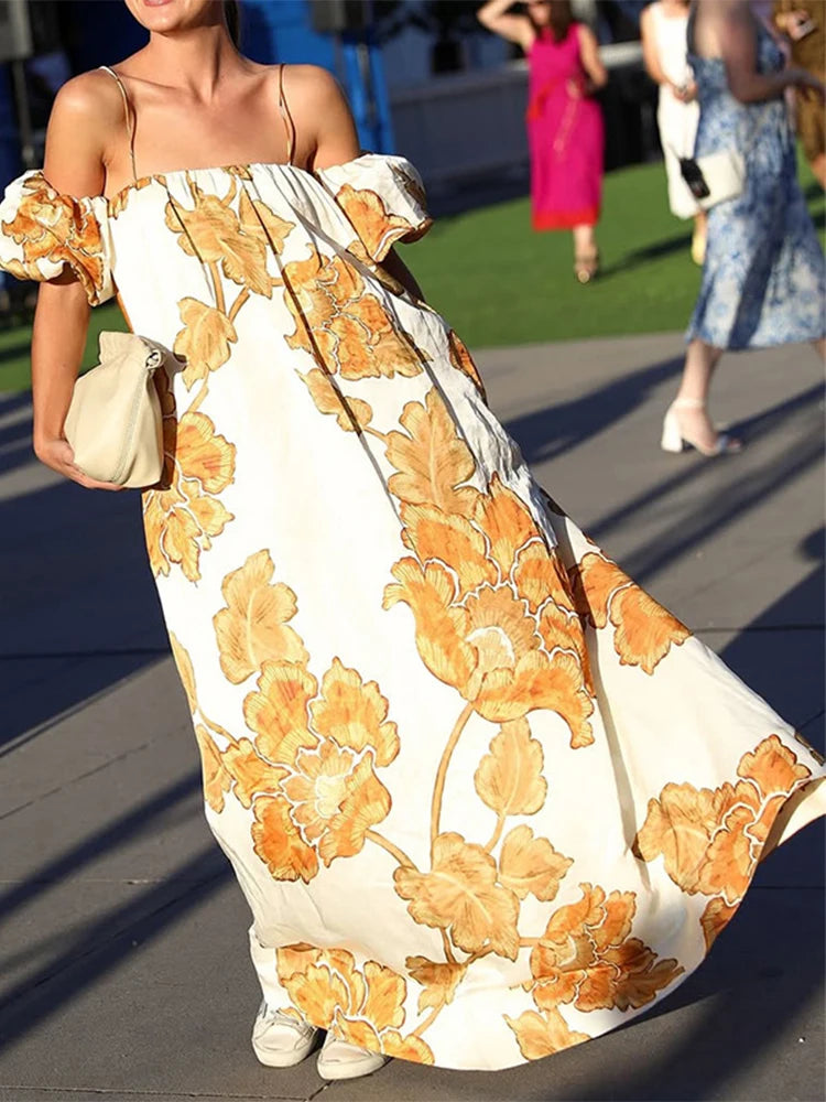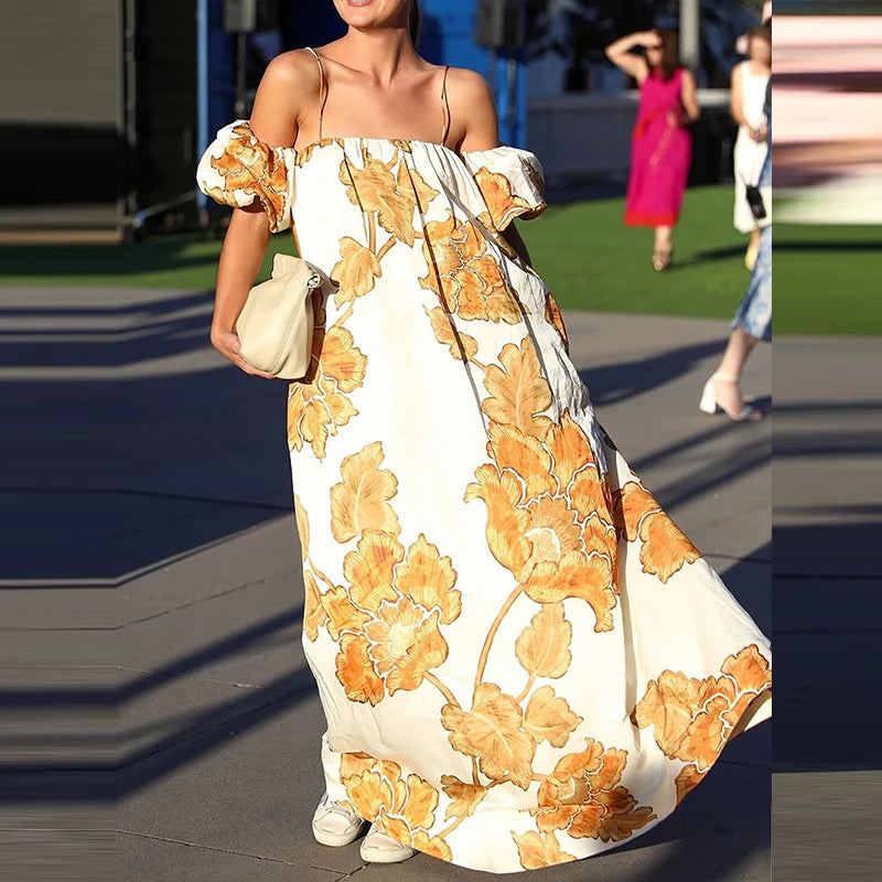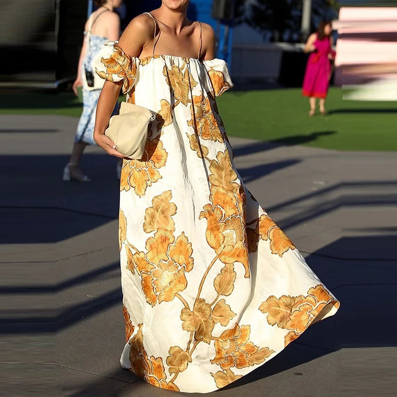 MQTIME - Women Elegant Patterns Print Loose Party Dress Fashion Hight Waist Suspender Dress Sexy Off Shoulder Short Sleeve Vacation Dress