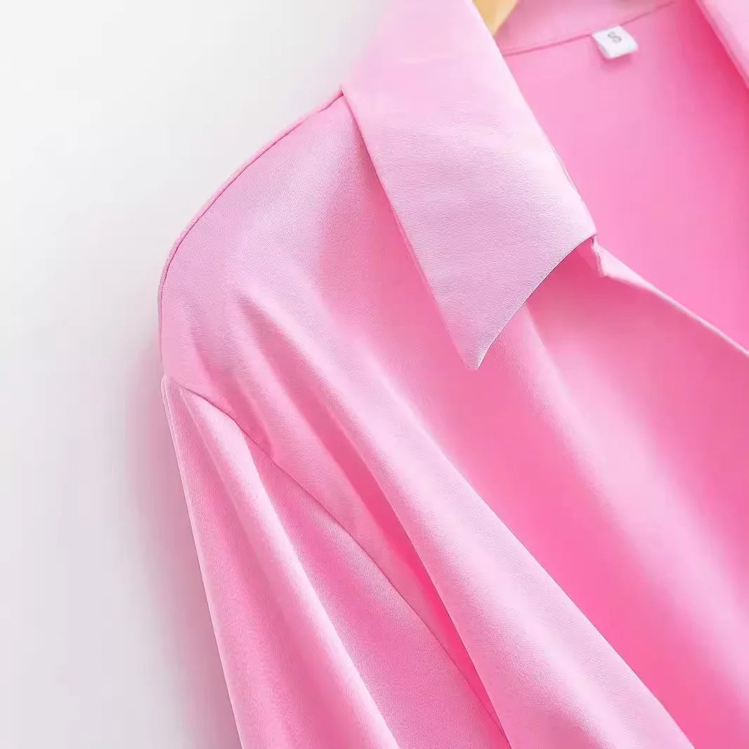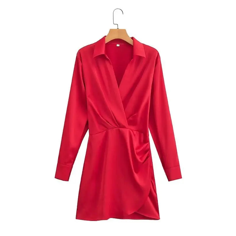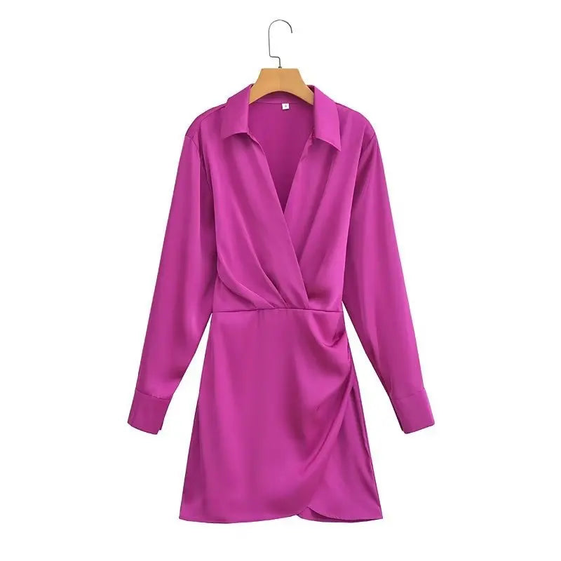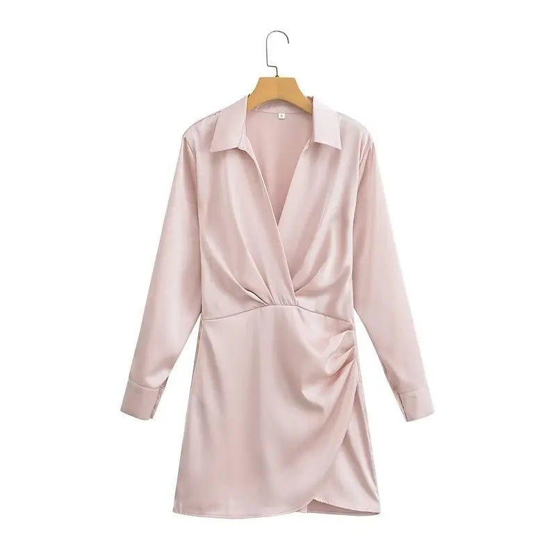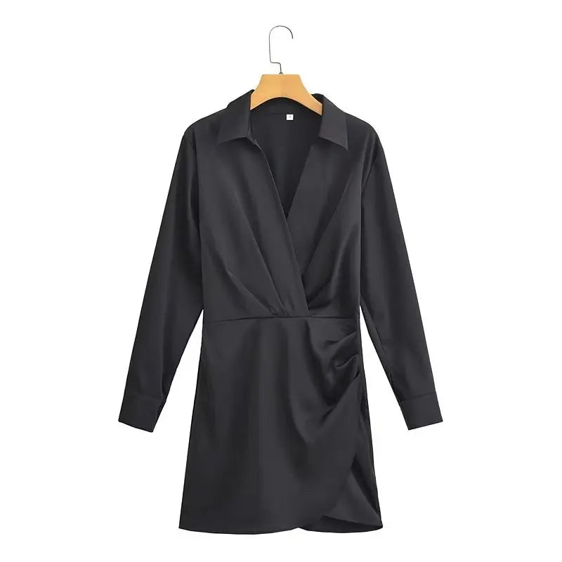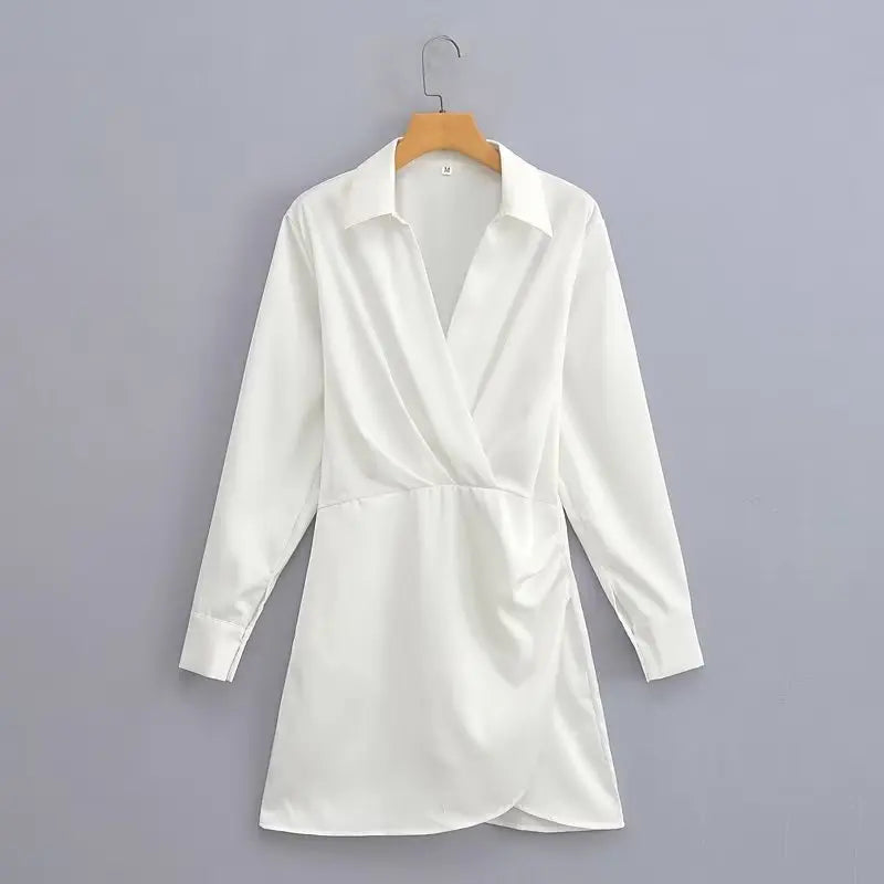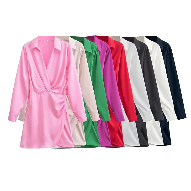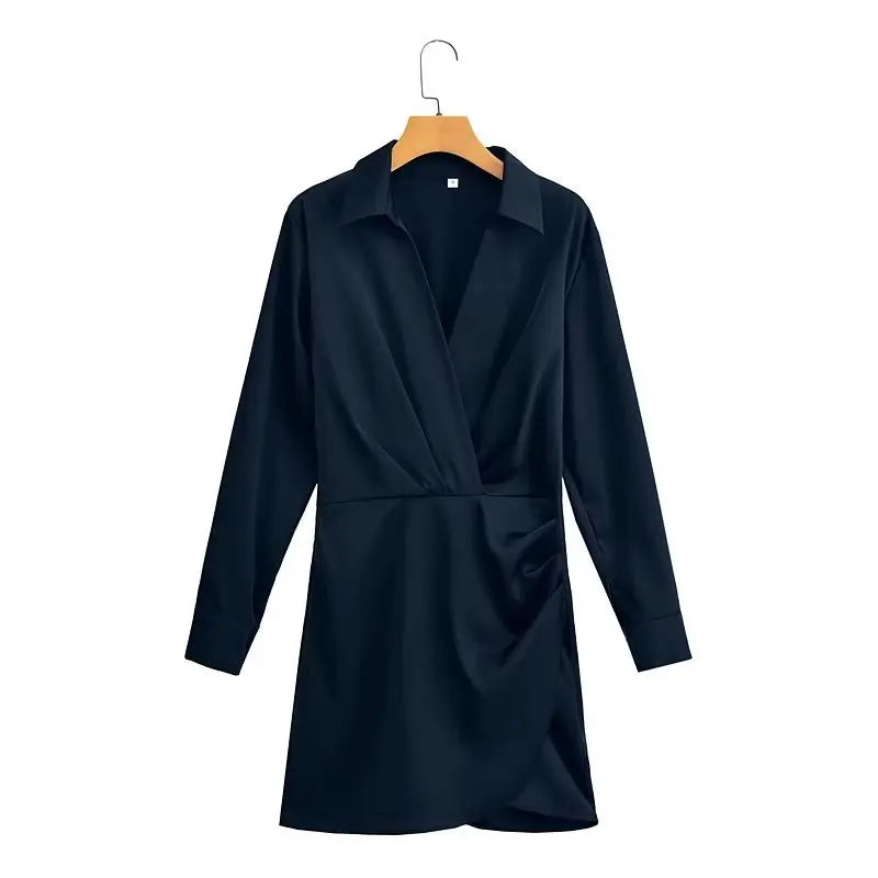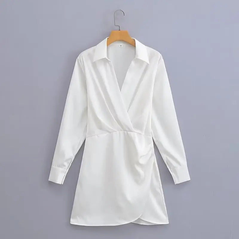 MQTIME - Women Long Sleeve Lapel Dress Solid Color Summer Fashion Streetwear Female Pleated Dresses Office Lady Elegant Shirt Dress