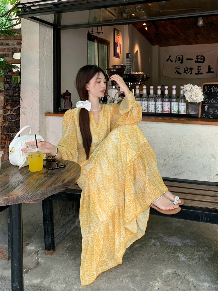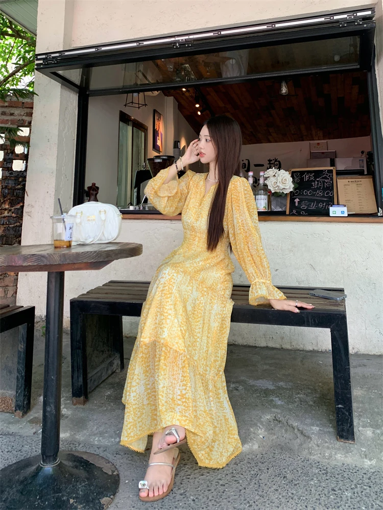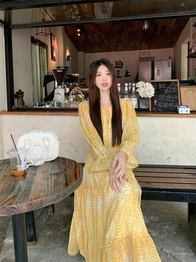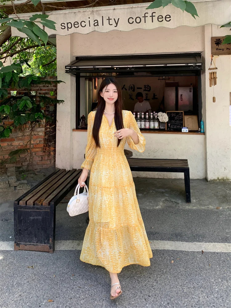MQTIME - Women Print Yellow Mid-calf Dress Deep V Ruffles Flared Sleeve Spring Autumn Female Elastic High Waist Robe