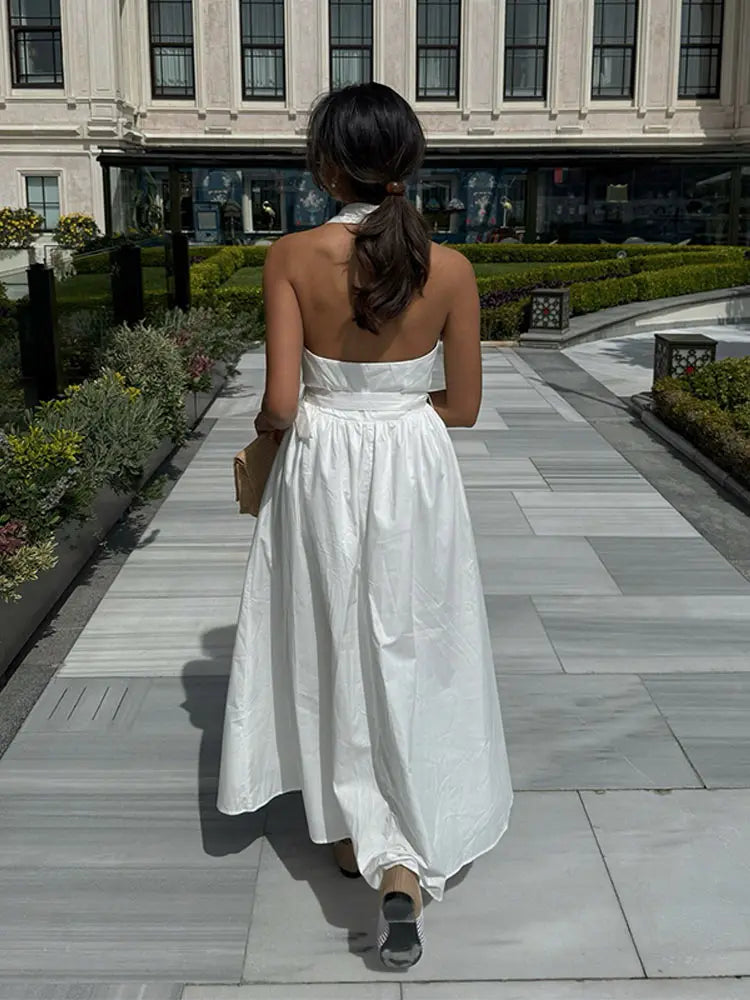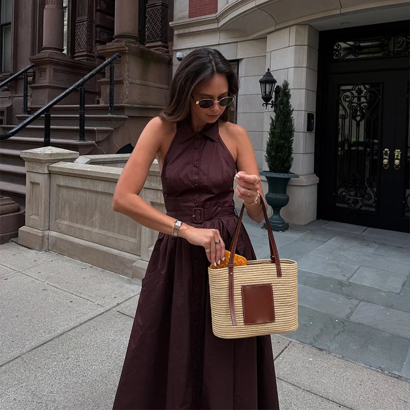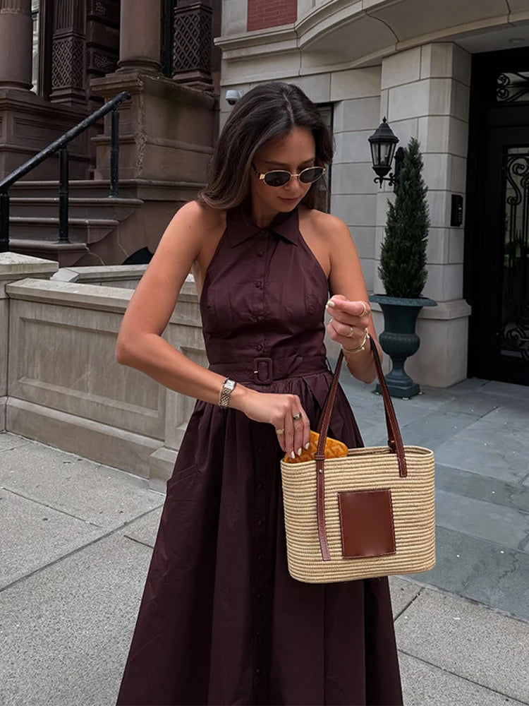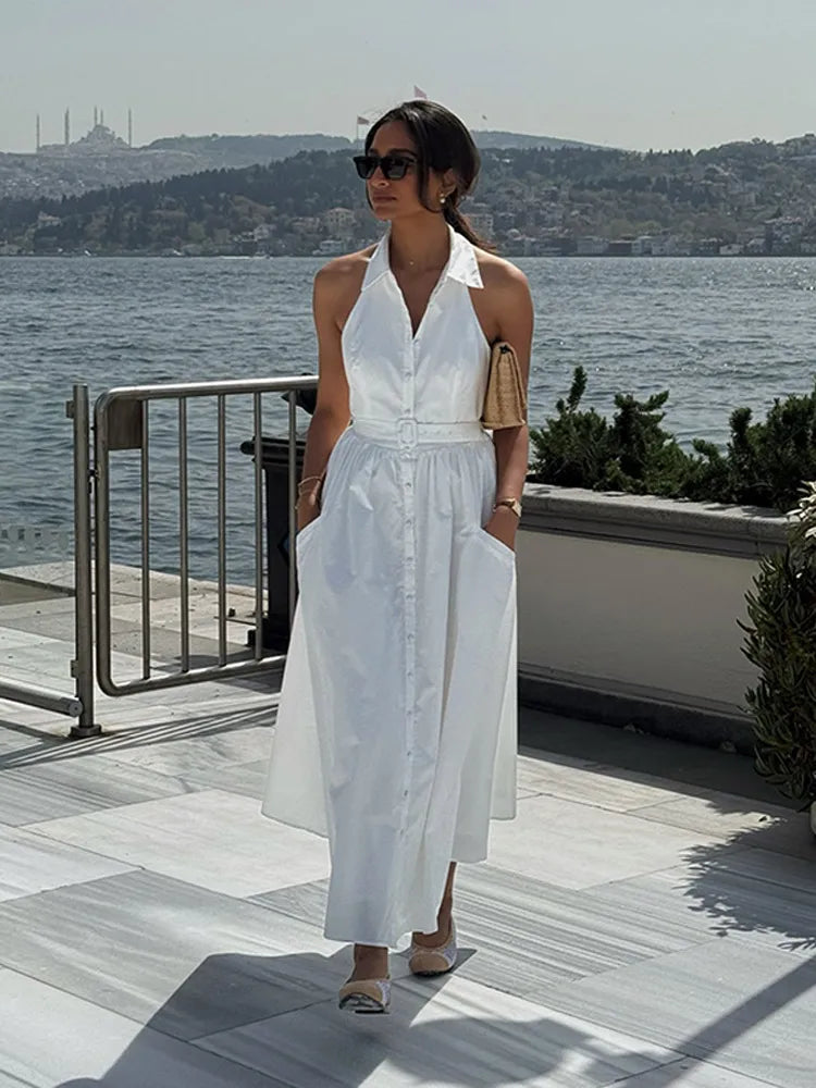 MQTIME - Women Shirt Belt A-line Dressess Casual Laple Single Breasted Pockets Waist Cinching Maxi Dress Summer Lady Evening Party Gowns