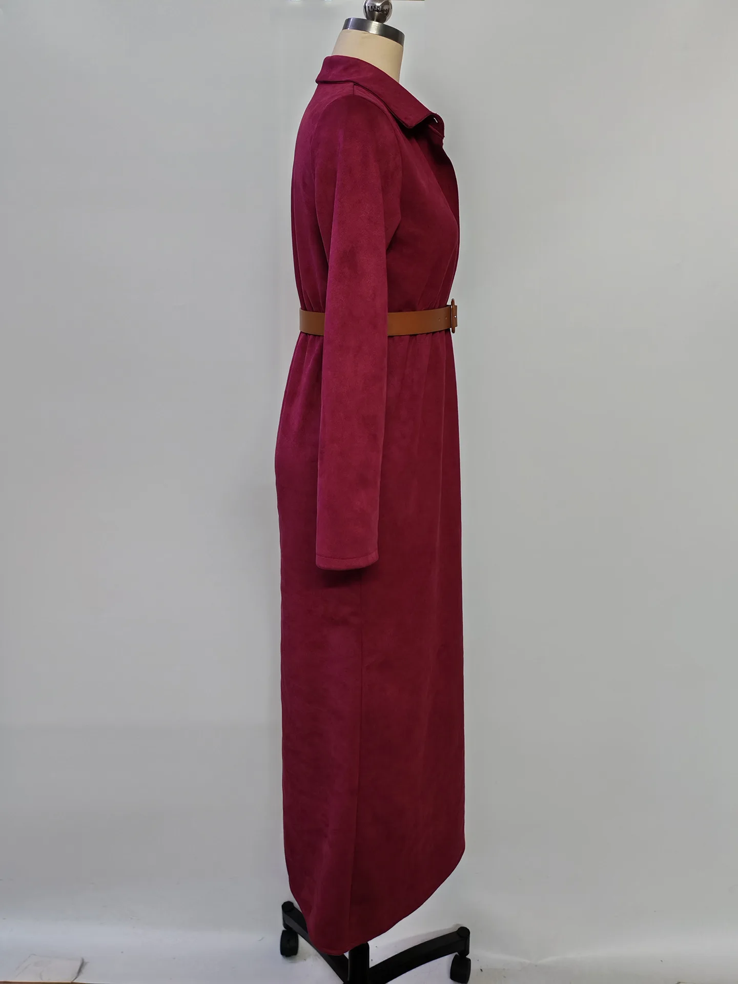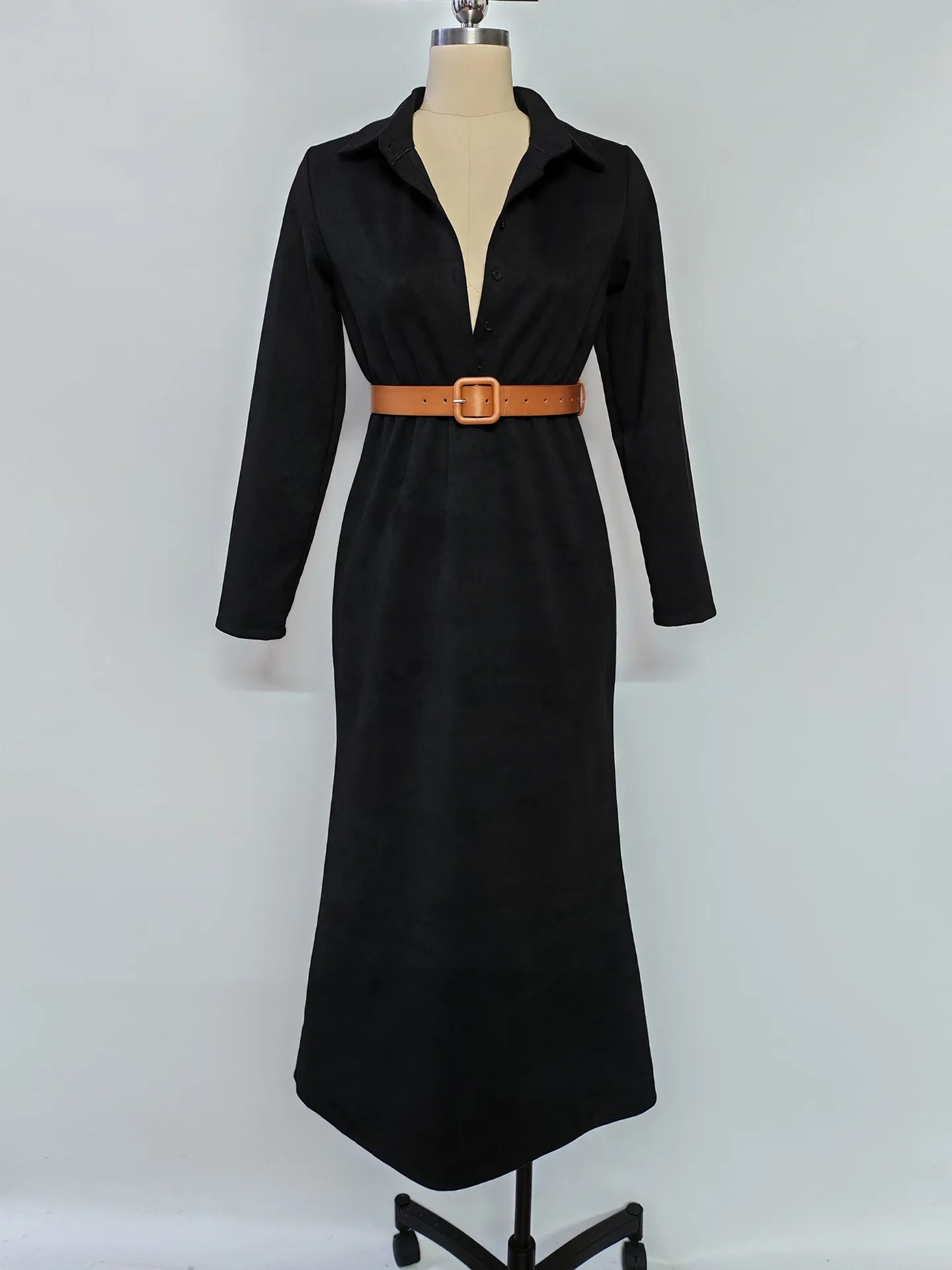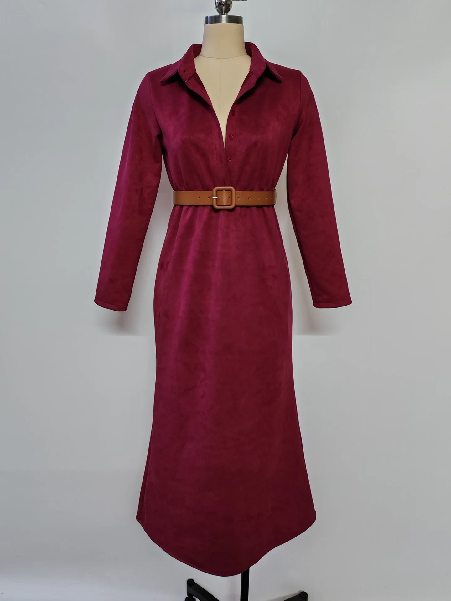 MQTIME - Women Turn-Down Collar Slim Party Dresses 2025 Spring Autumn Long Sleeve Chic Maxi Dress Suede Temperament Ladies Robes Vestidos
