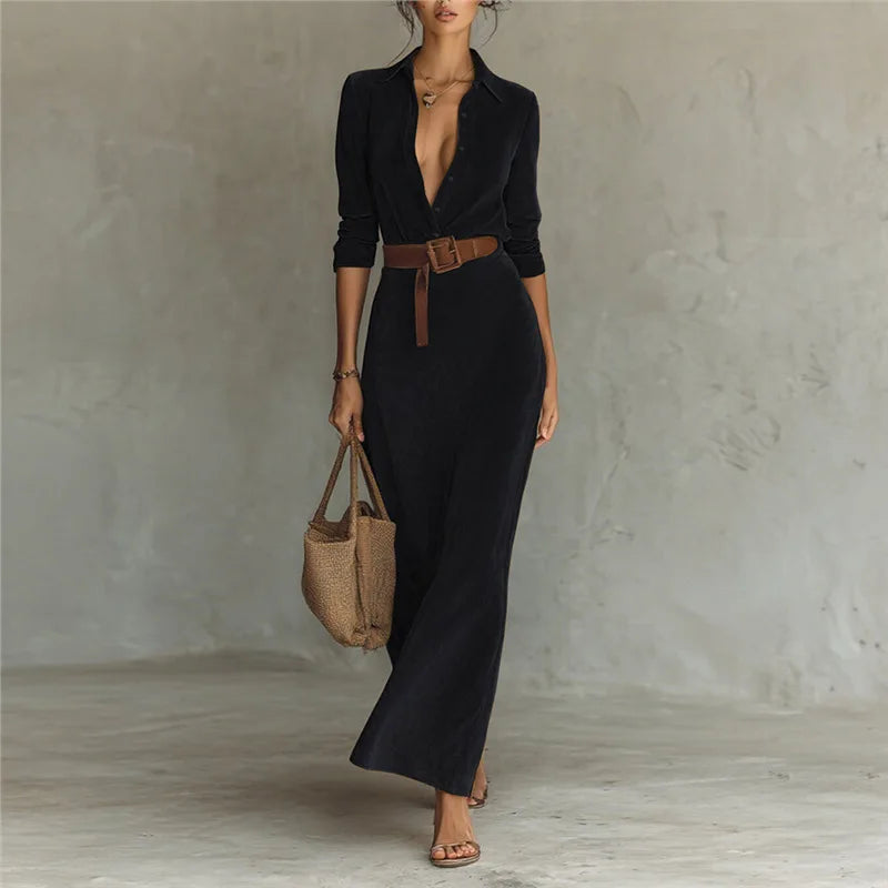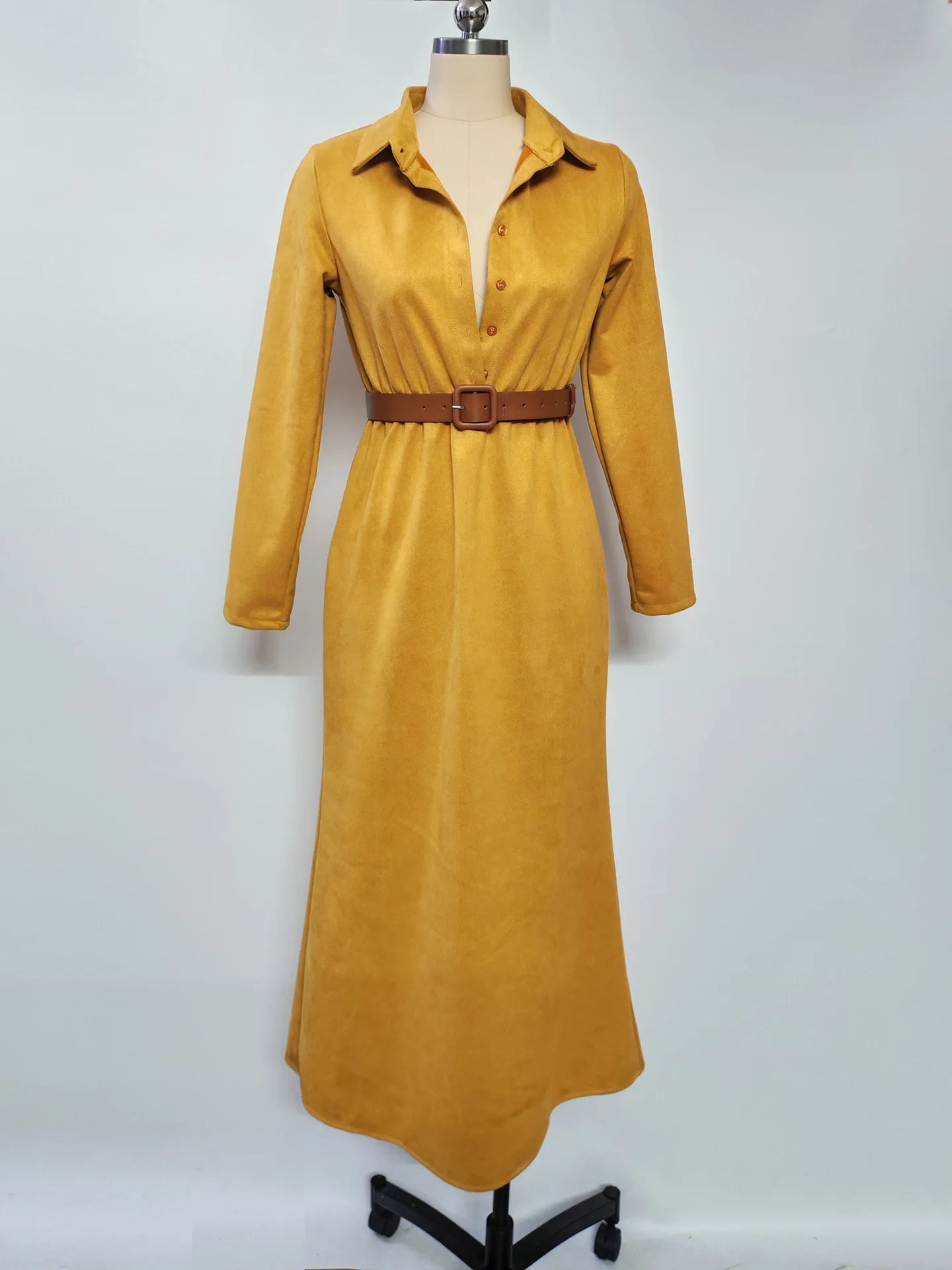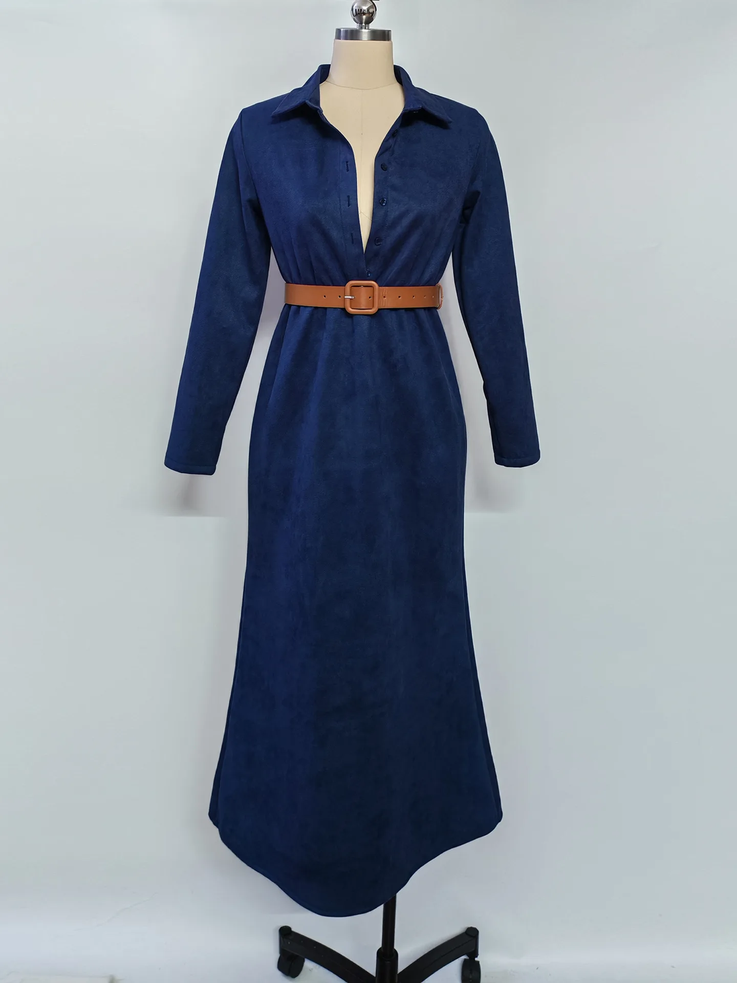 MQTIME - Women Turn-Down Collar Slim Party Dresses 2025 Spring Autumn Long Sleeve Chic Maxi Dress Suede Temperament Ladies Robes Vestidos