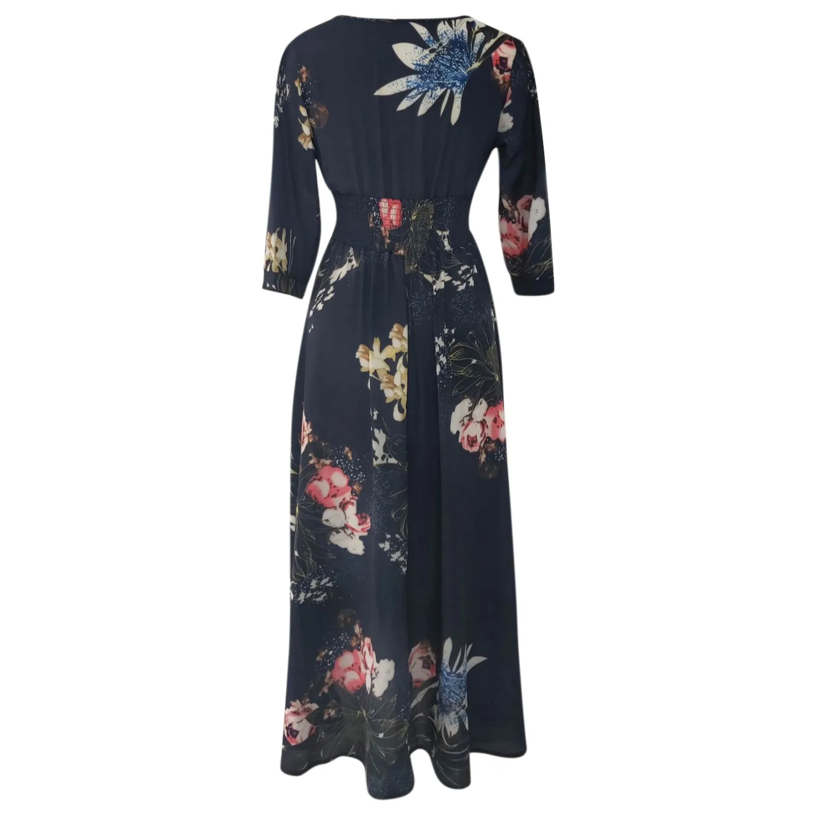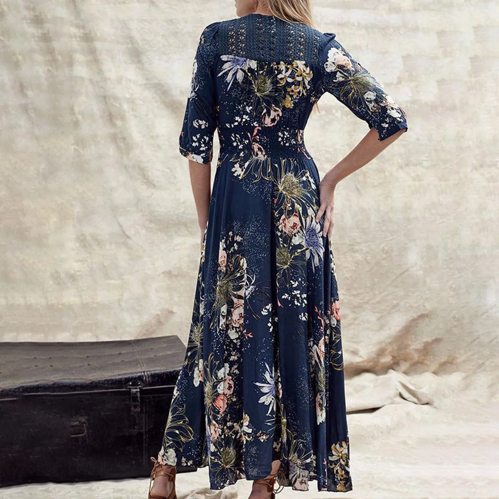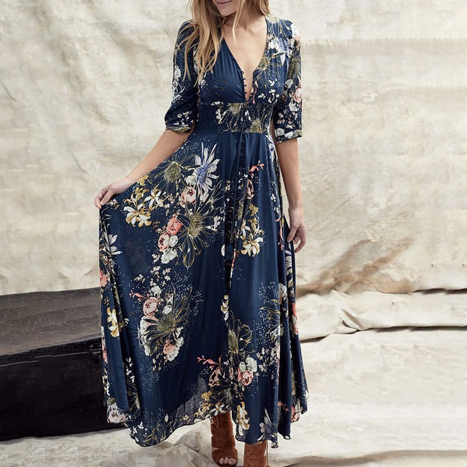 MQTIME  -  Women's Bohemian Button Down Floral Dress Summer Half Sleeve V Neck Midi Casual Dresses Beach Large Swing Women Boho Dress