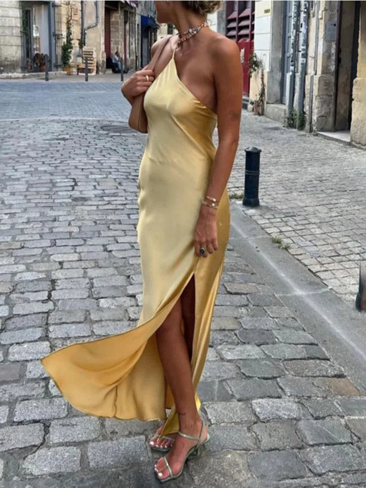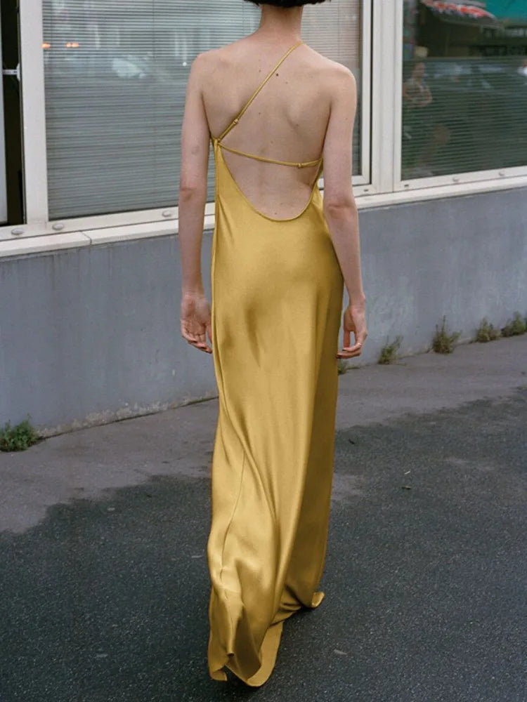 MQTIME - Women's Solid Color Satin Dress One-shoulder Asymmetrical Backless Sexy Evening Dresses Side-slit Party Gowns