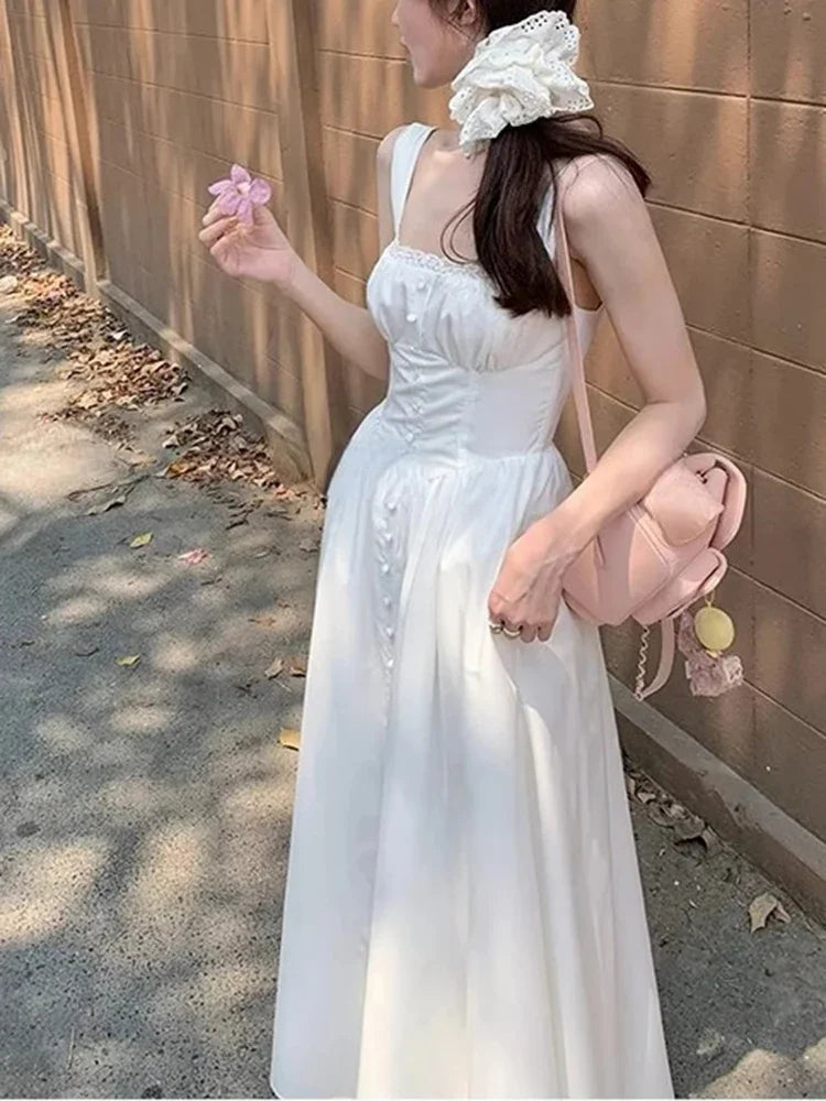 MQTIME - Y2K Beach Party Lace Splicing Slim Fit Women A-line Long Dress Casual Sweet Women's Fragmented Flower Hanging Strap Dress Summer