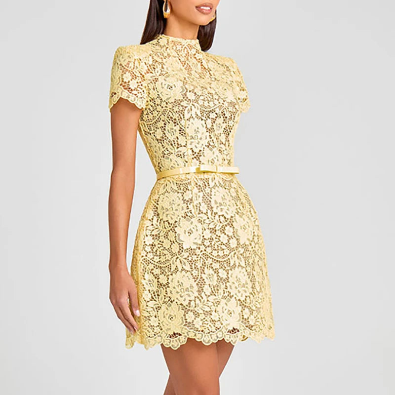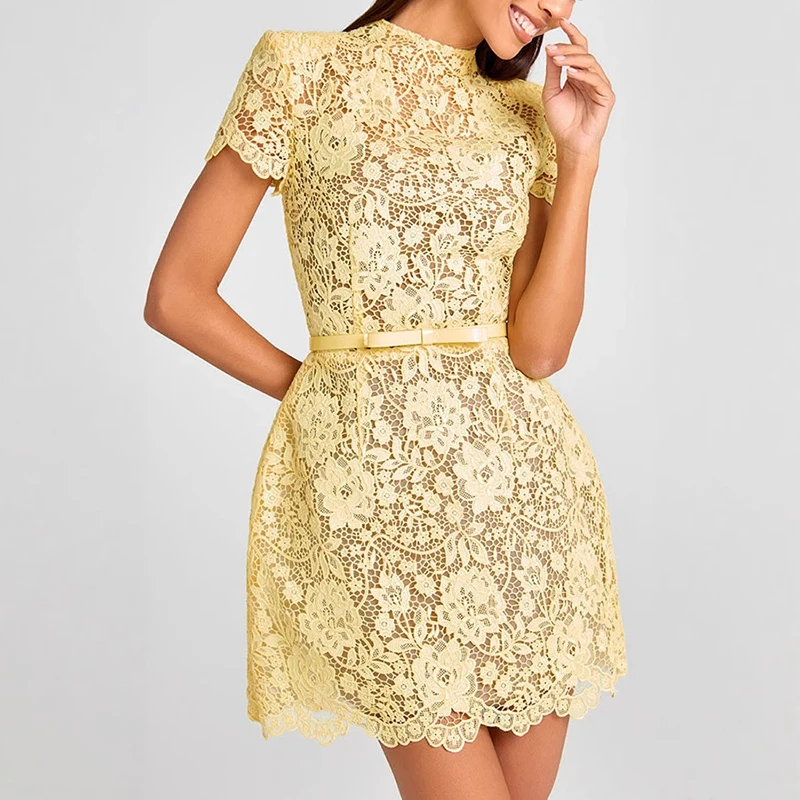 MQTIME - Yellow Bow Tie Up Banquet Dresses Fashion Perspective Lace Women's Party Dress New Elegant O Neck Short Sleeved High Waist Dress