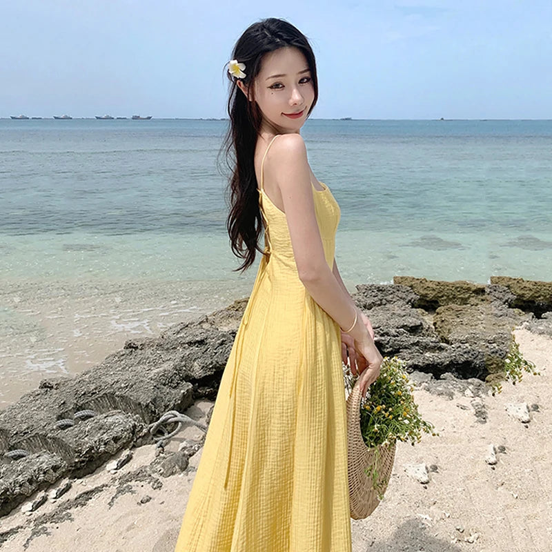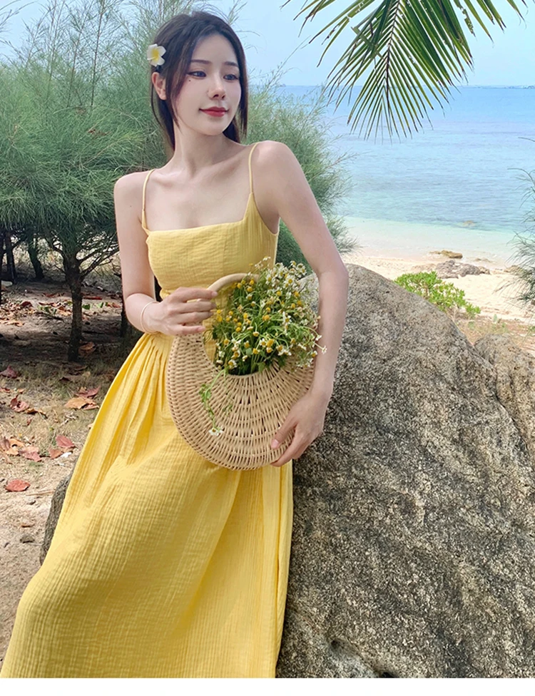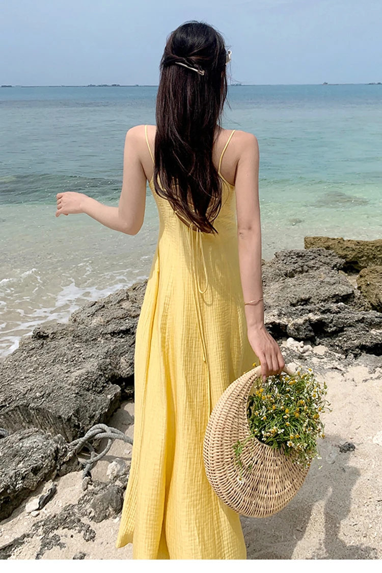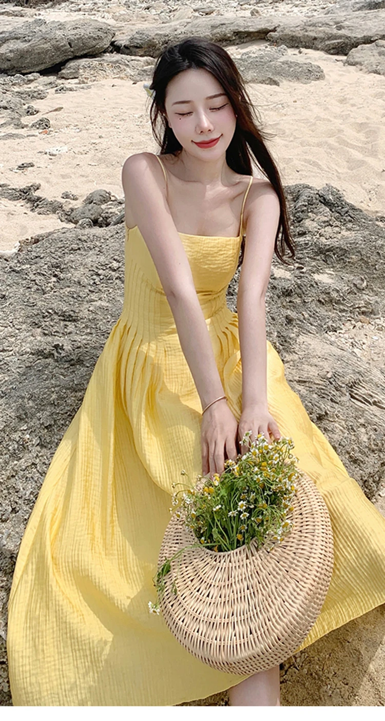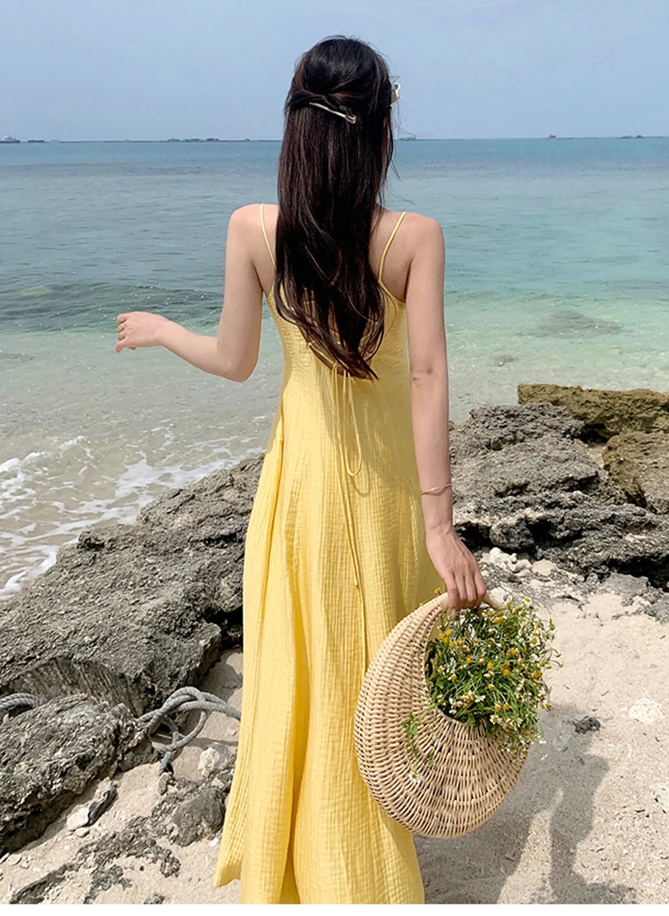 MQTIME - Yellow Elegant Slim Backless Pleated Slip Long Dresses Women High Waist Sleeveless Backless Sexy Birthday Party Dress Summer New