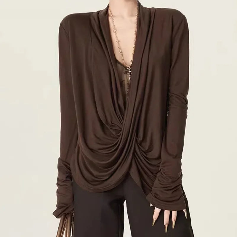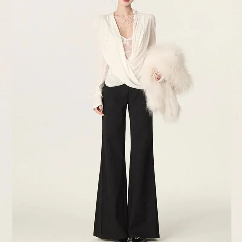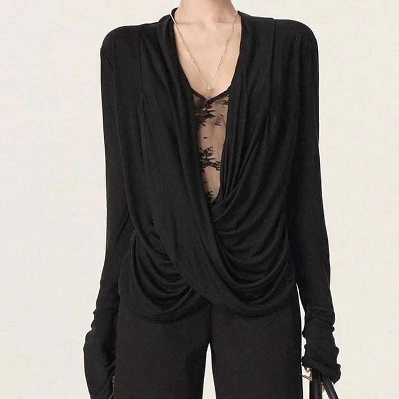 MQTIME - New Hot Sale Of The Season Lace Insertion Cross Neck Design Sensual Early Autumn Top Fake Two-Piece Splice Strategy Women's T-sh