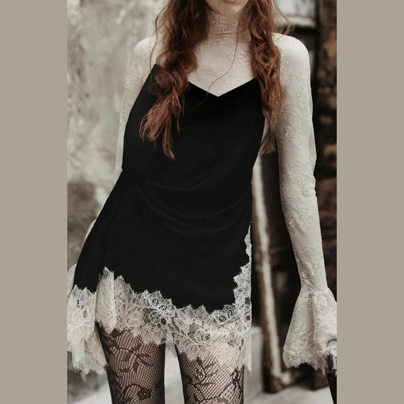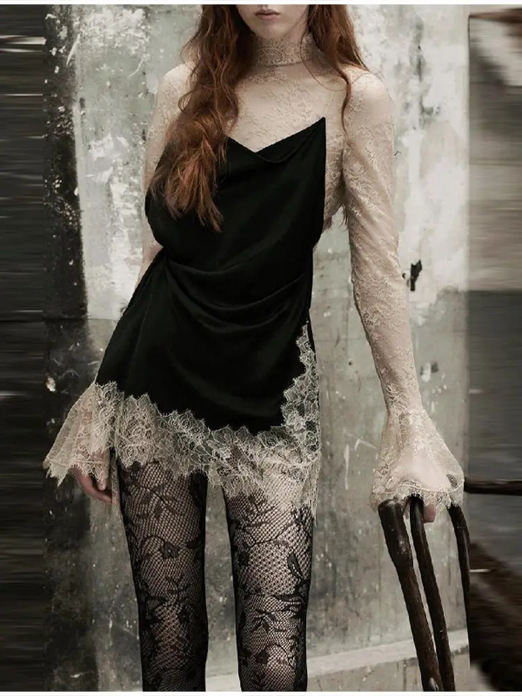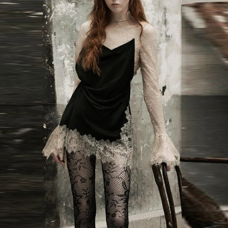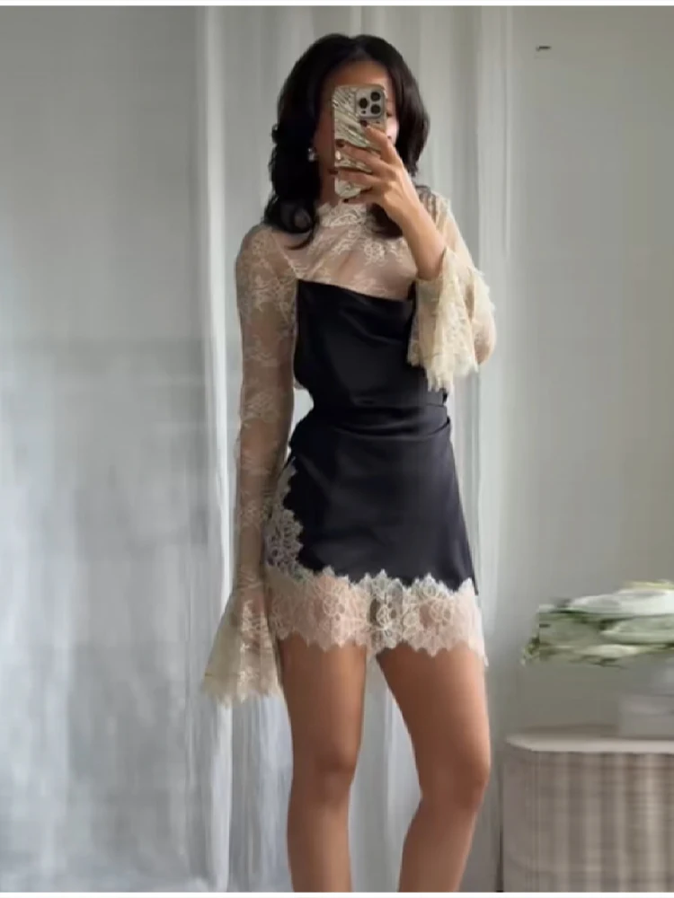 MQTIME - Cute Elegant Party Dress Lace Satin Paneled Sexy Hot Waist-cinching Date Lady Dresses Retro Figure-flattering Women Clothing