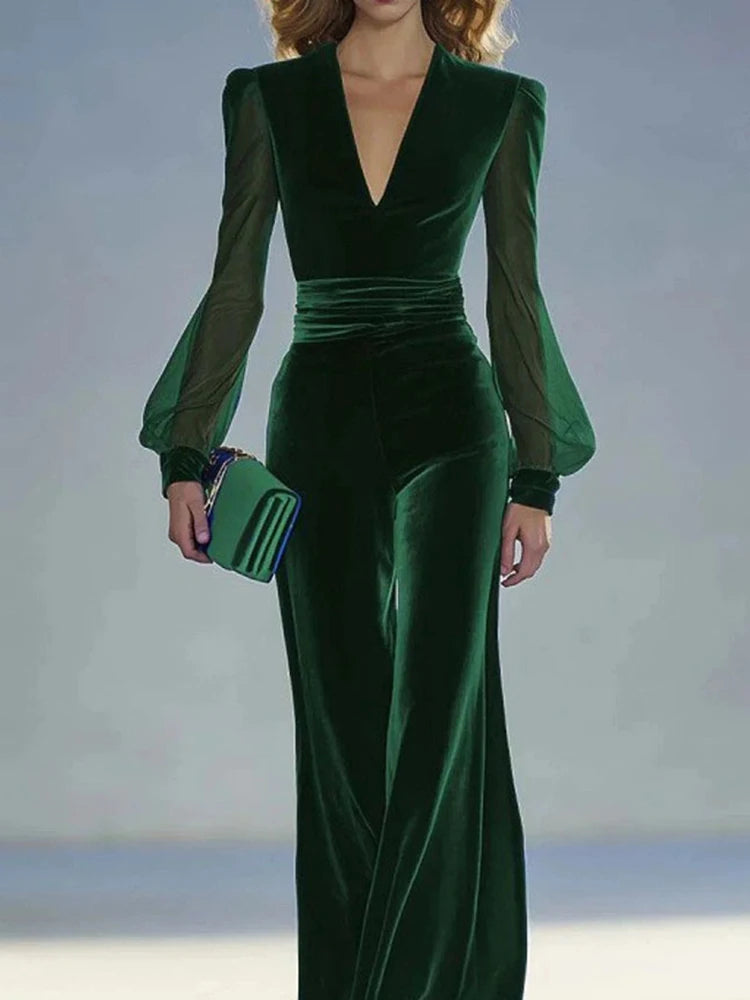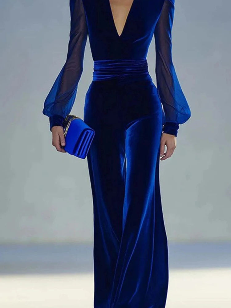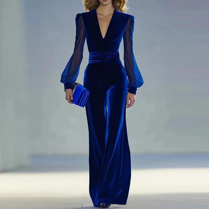 MQTIME - Fashion V-neck Velvet Wide Leg Jumpsuits Elegant High Waist See-through Sleeve Party Playsuits Temperament Lady Casual Rompers