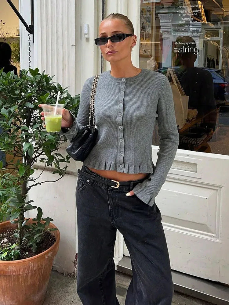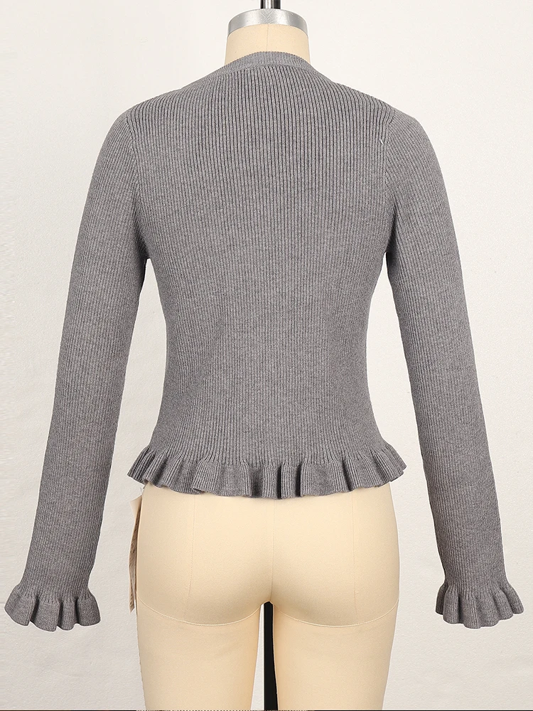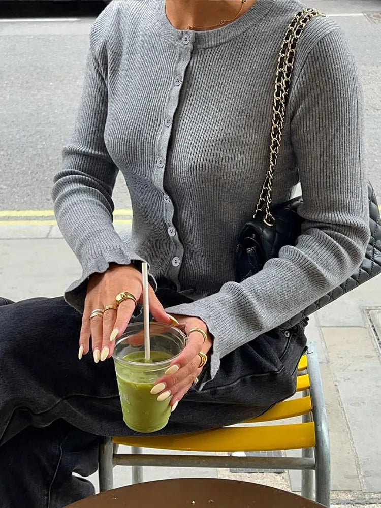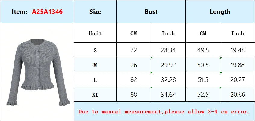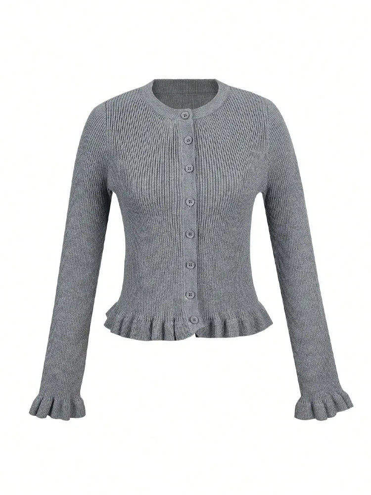 MQTIME - New Korean Round Neck Button Knitted Cardigan Long Sleeve Lace Top Coat Simple Elegant Autumn Women's Clothing Grey Soft Sweater