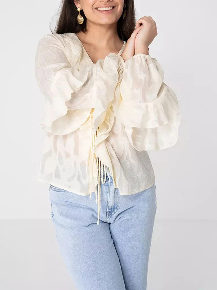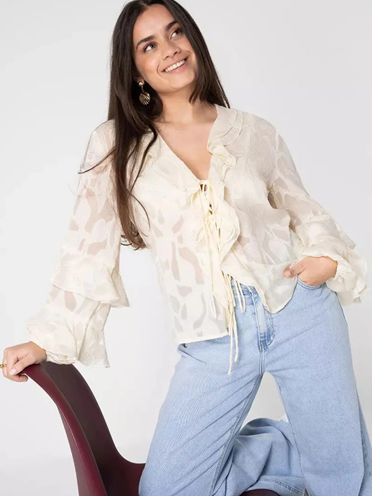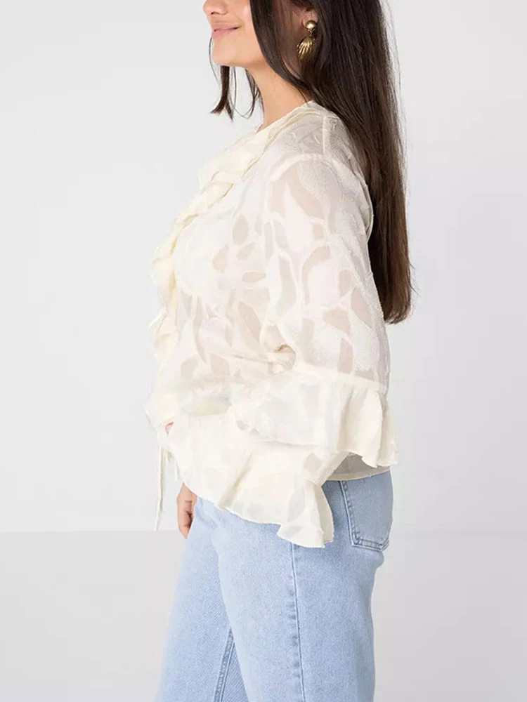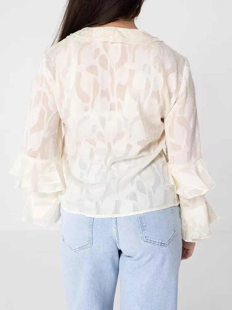 MQTIME - New See-Through French ruffle lace Leaf Pattern Flared Sleeve Cardigan Sexy Elegant Beige Slim Woman Clothes Blouse Party Tops