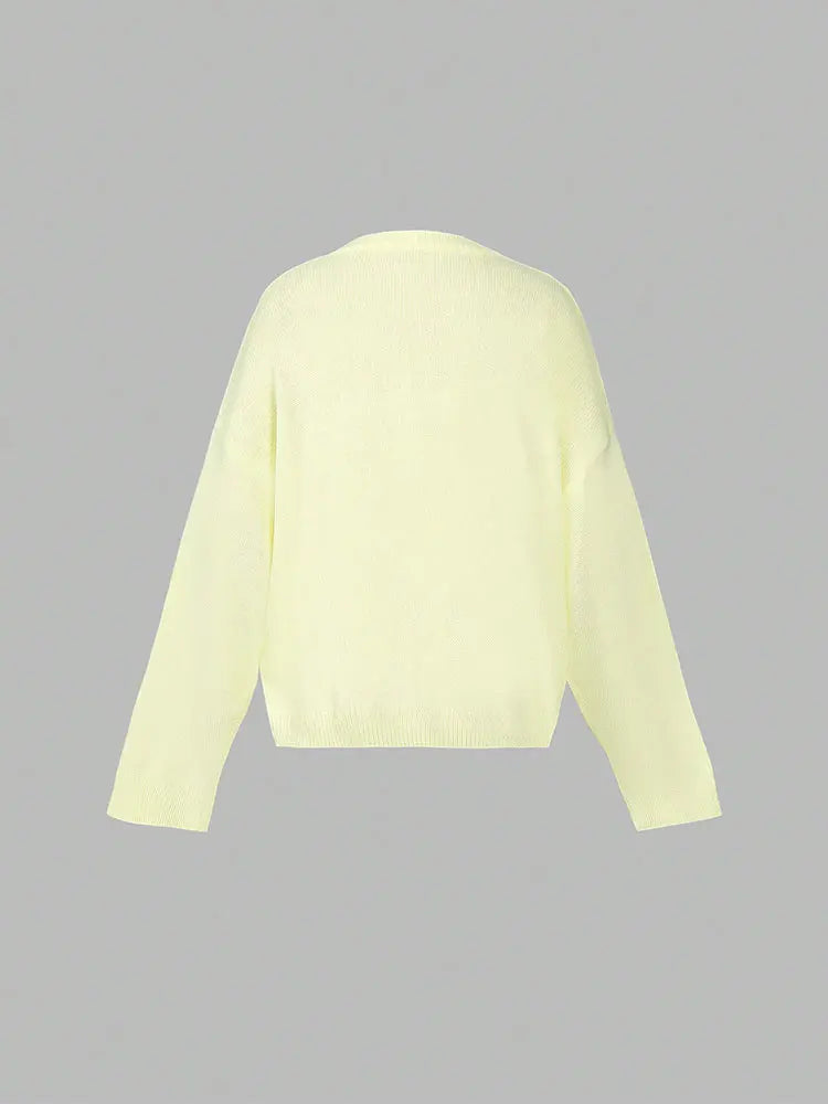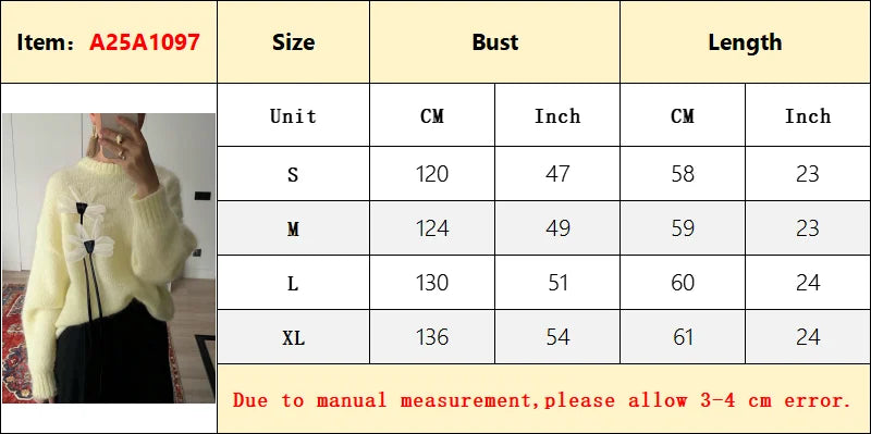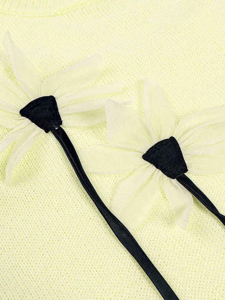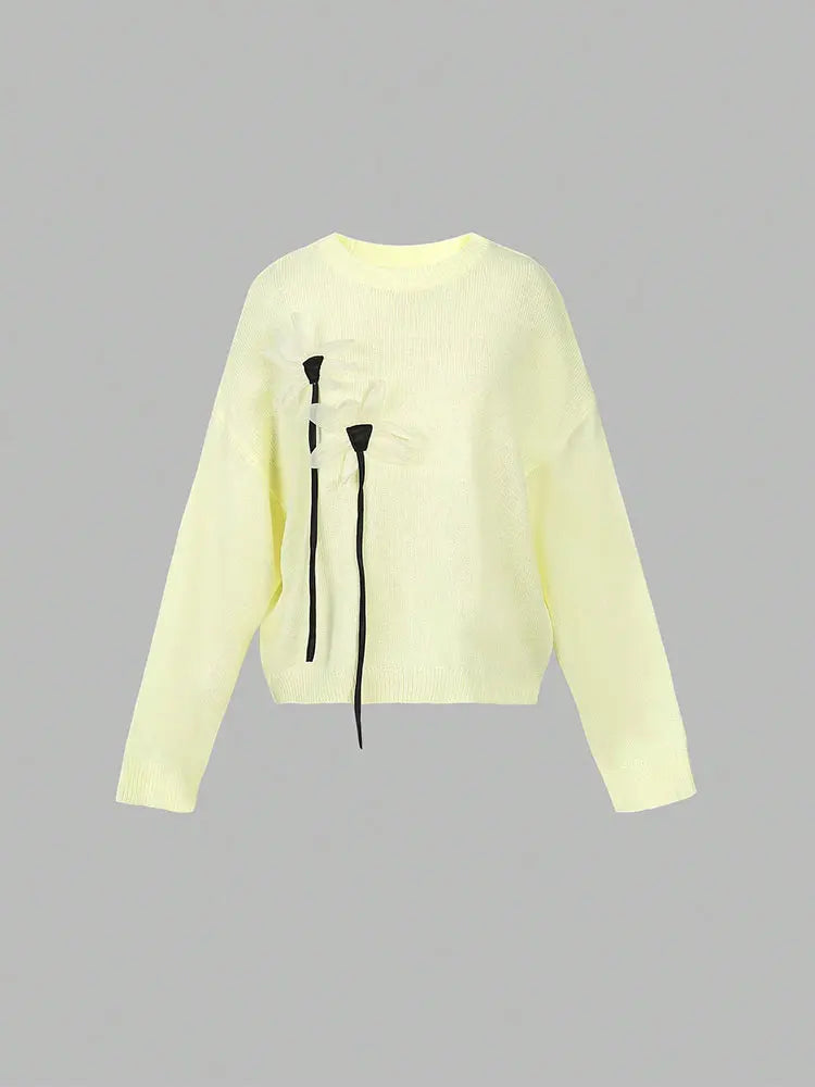 MQTIME - New Elegant Three Dimensional Flowers Long Sleeved Sweater Loose Soft Yellow Warm Pullover Top Round Neck Simple Knitwear Female