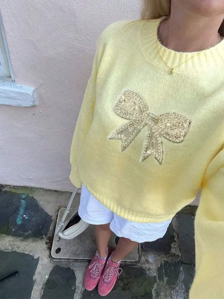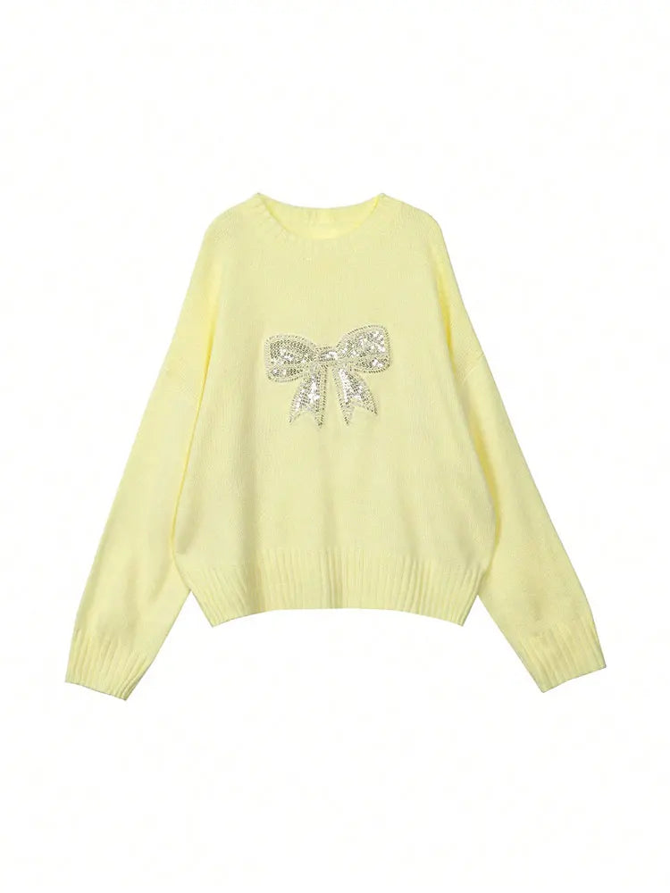 MQTIME - New Embroidered Lace Bow Sequins Pullover Sweater Loose Slim Women's Top Fashion Long Sleeve Soft Yellow Blouse Casual Commuting