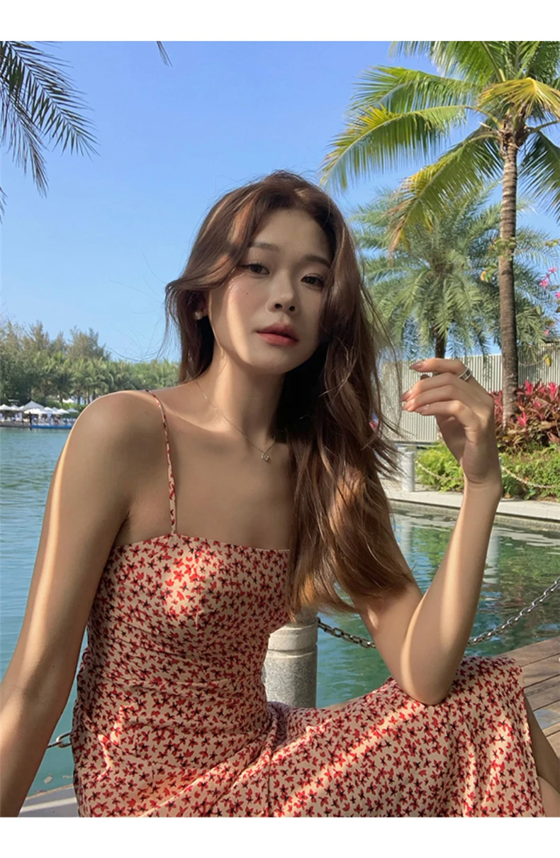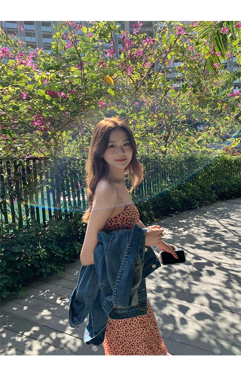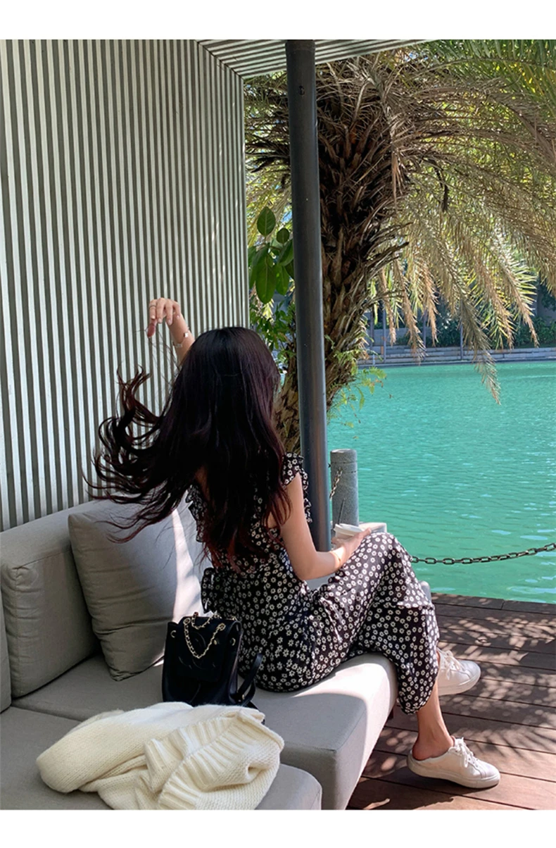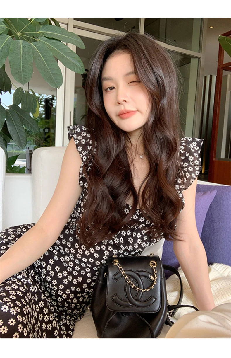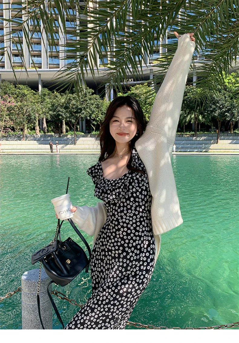 MQTIME - Black floral small flying sleeve suspender dress summer new sexy temperament with waist and buttocks, spicy girl long dress