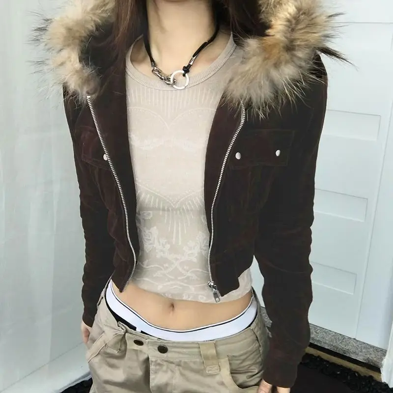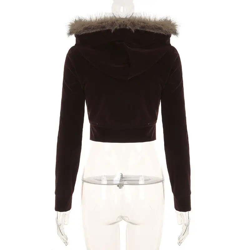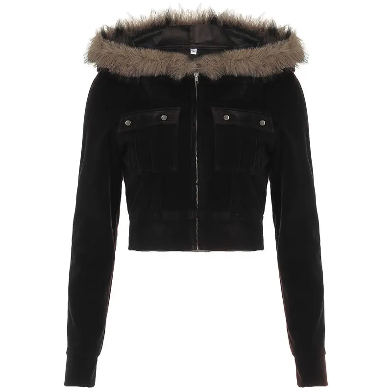 MQTIME - Cropped Trendy Velvet Pocket Cargo Jacket, High-waisted Skinny Hottie Fur Hooded Sweatshirt
