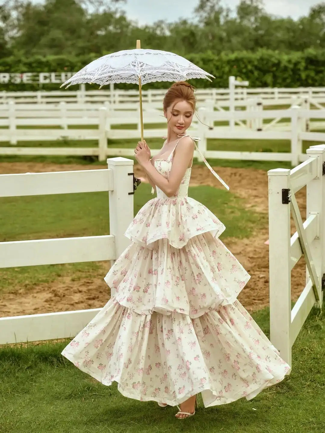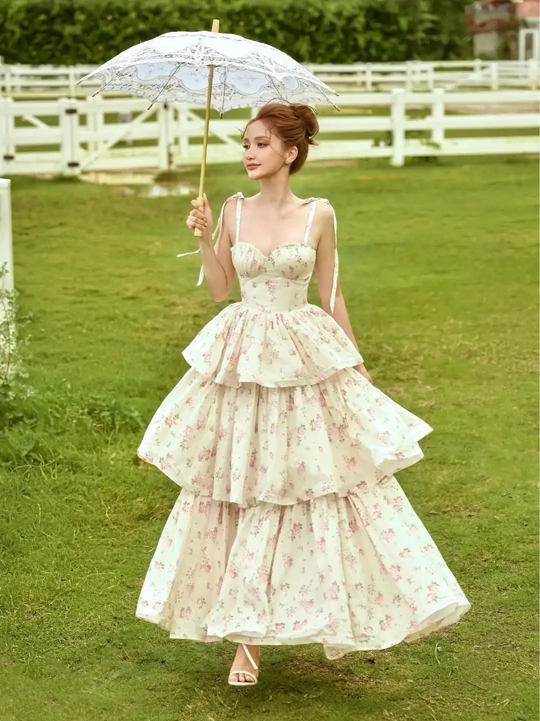 MQTIME - Hot Sale Floral Sexy Tube Top Cake Dress Tie Front Multi-Layered Ruffle Ditsy Floral Pattern Fairy Gorgeous Evening Dress