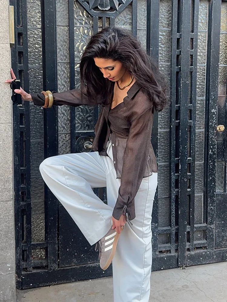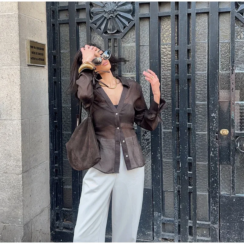 MQTIME - Sexy Women See-Through Shirt V-neck Long Sleeve Single Breasted Blouse 2025 Summer Autumn Fashion Street Office Lady Shirts