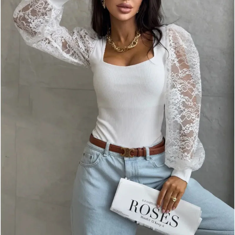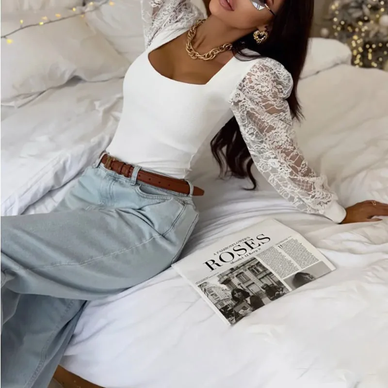 MQTIME  -  Summer Sexy Lace Long Sleeve Bodysuits Autumn New Solid Knitted Spliced Jumpsuits Elegant Lady Slim V-neck See-through Rompers