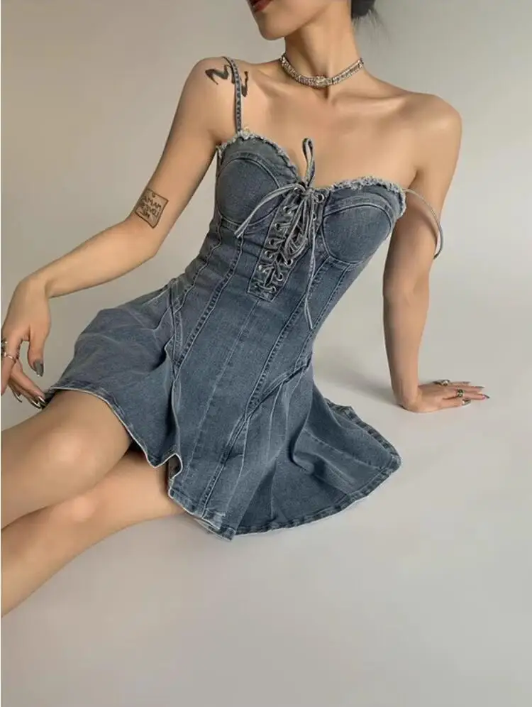 MQTIME - Thin waist, long legs, sexy, sweet and spicy style denim camisole dress, tie up strapless A-line skirt, summer spicy girl