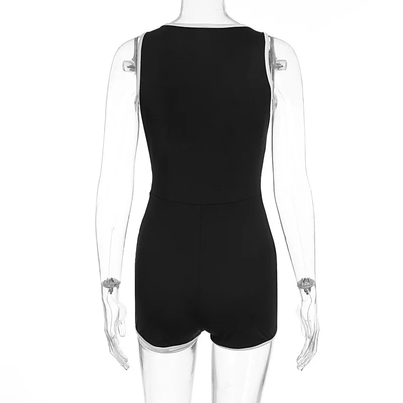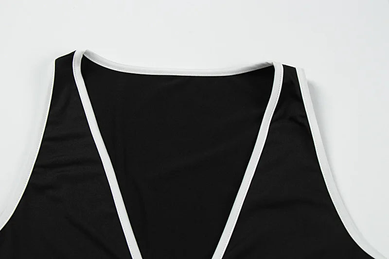 MQTIME - Women Sexy Playsuits Going Out Sleeveless Deep V-neck Combinaison Femme Summer Black Bodycon Contrast color Basic Rompers