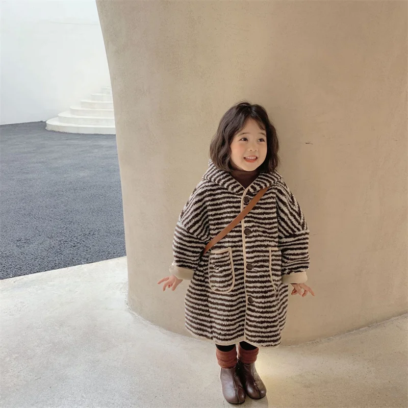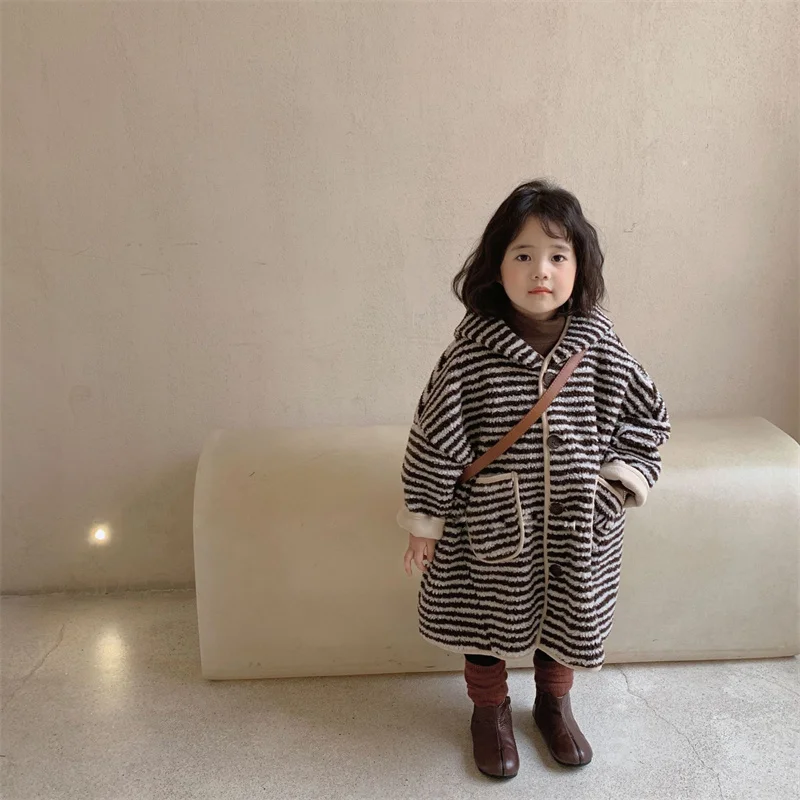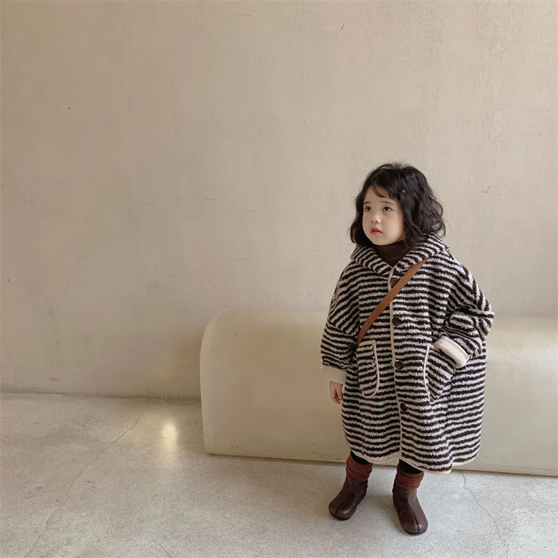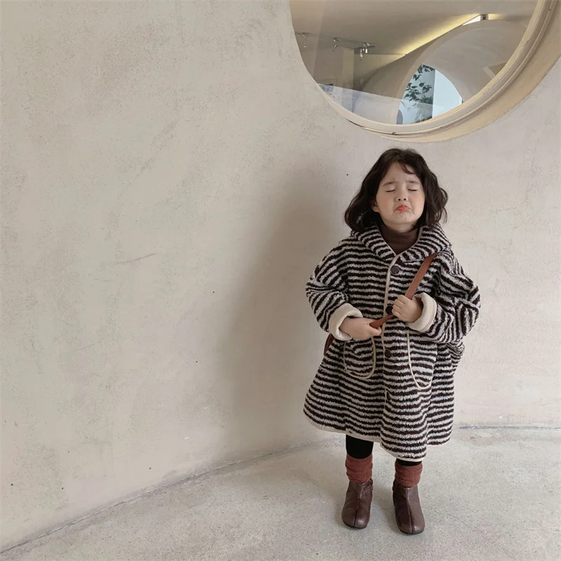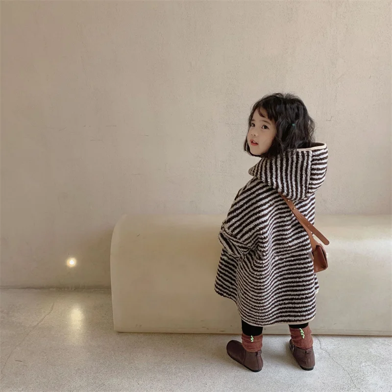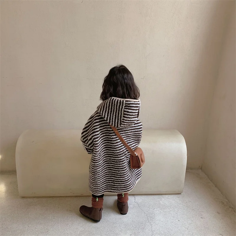 MQTIME - Baby Girls Plush Coats Autumn Winter Striped Woolen Jackets Children Hooded Outerwear Kids Warm Zipper Casual Clothing
