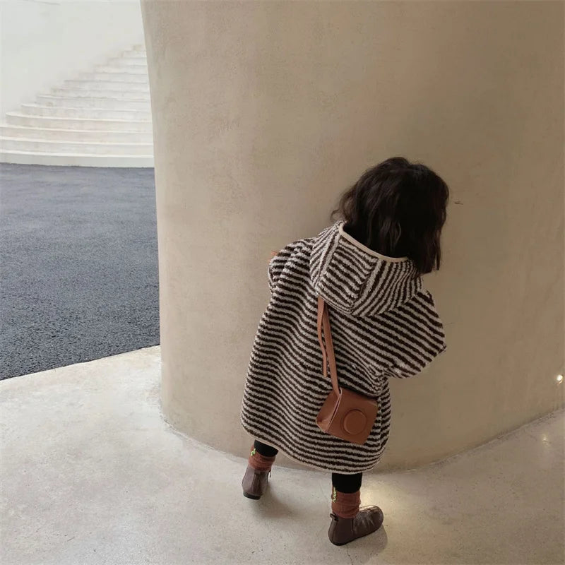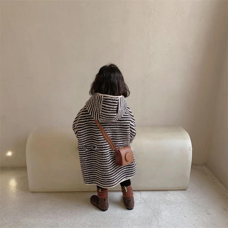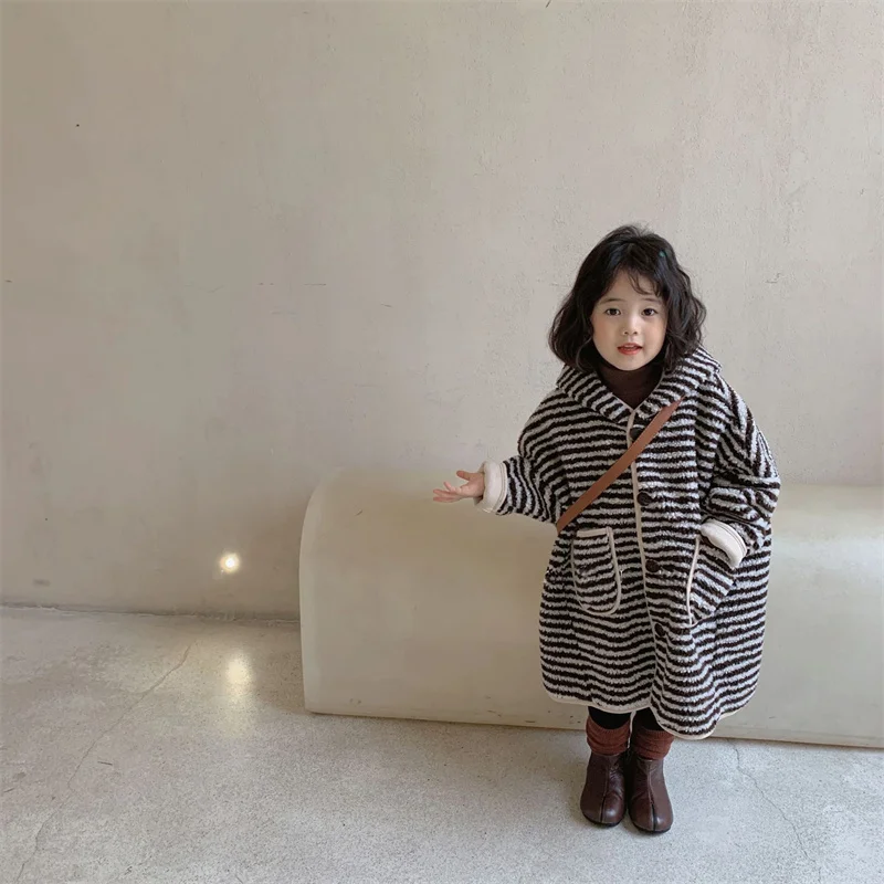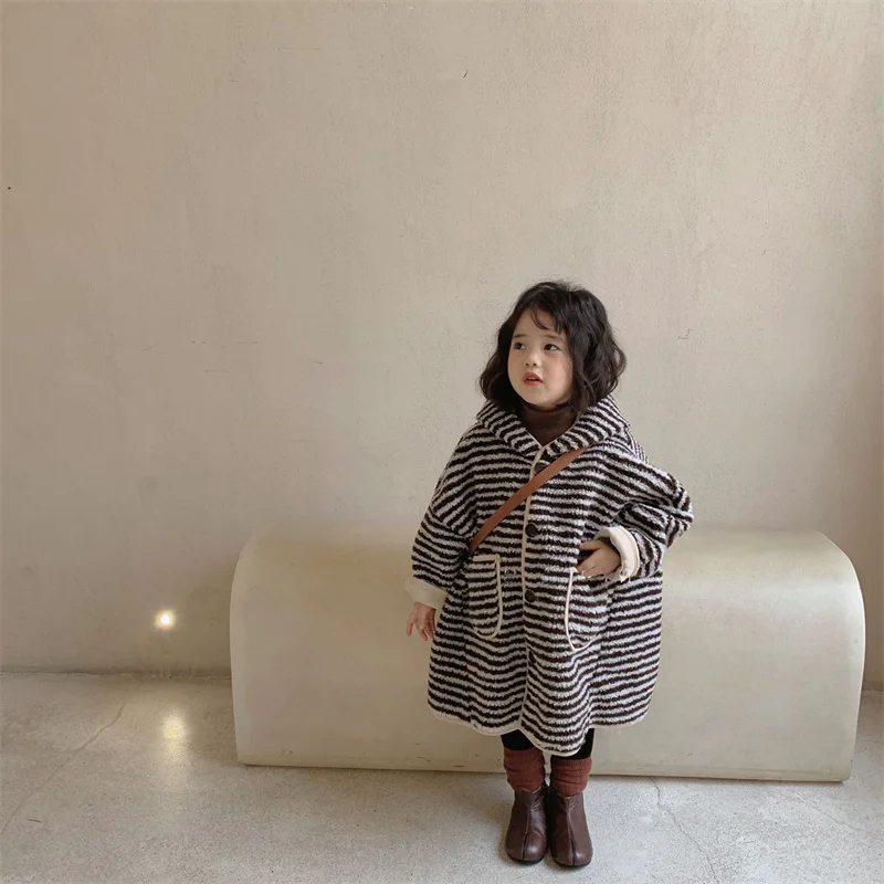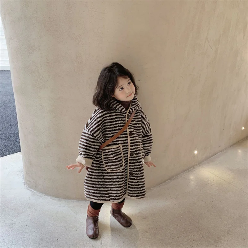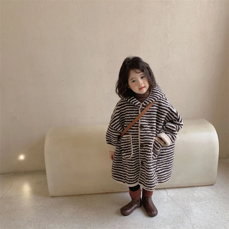 MQTIME - Baby Girls Plush Coats Autumn Winter Striped Woolen Jackets Children Hooded Outerwear Kids Warm Zipper Casual Clothing