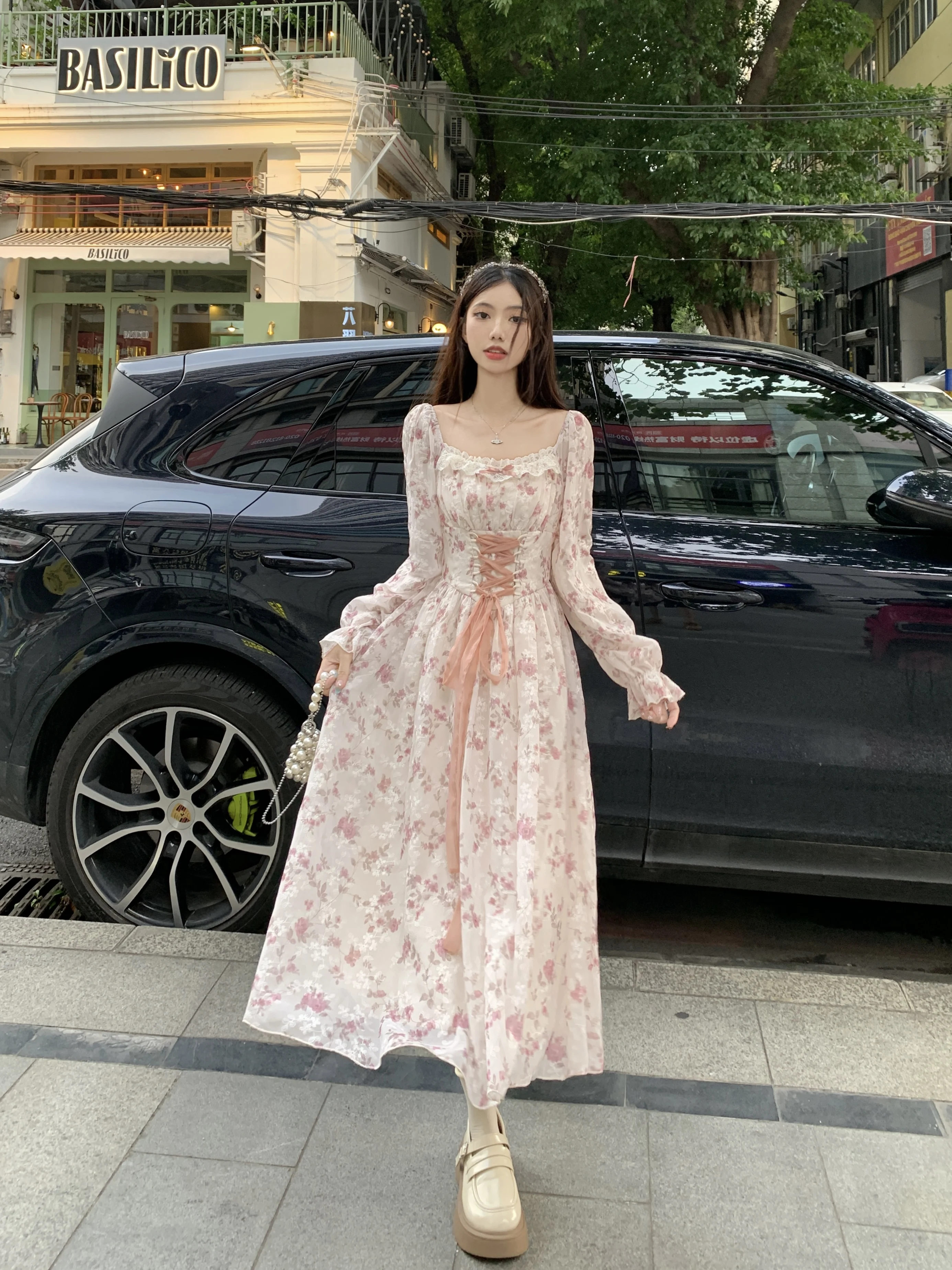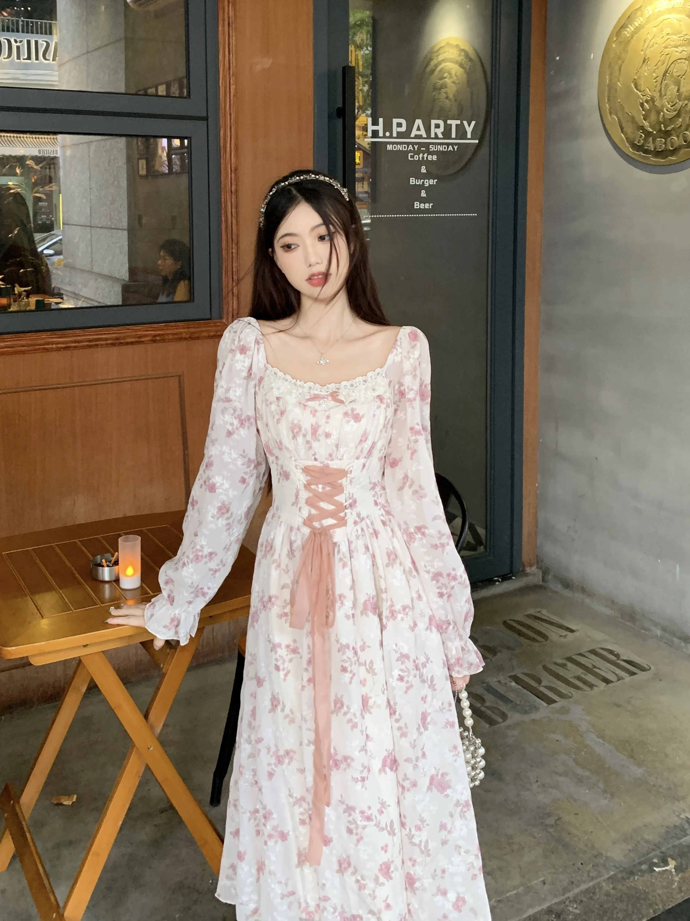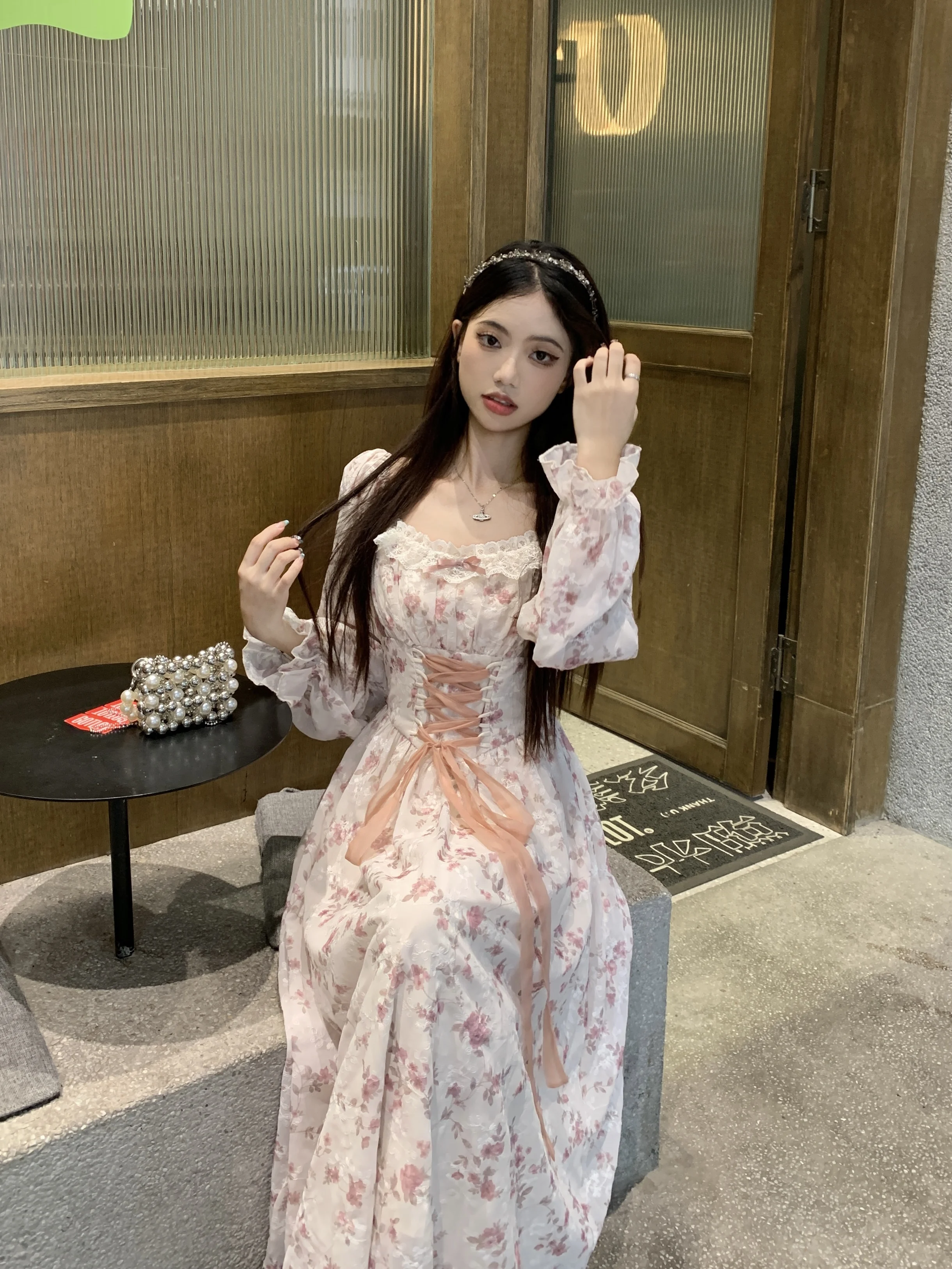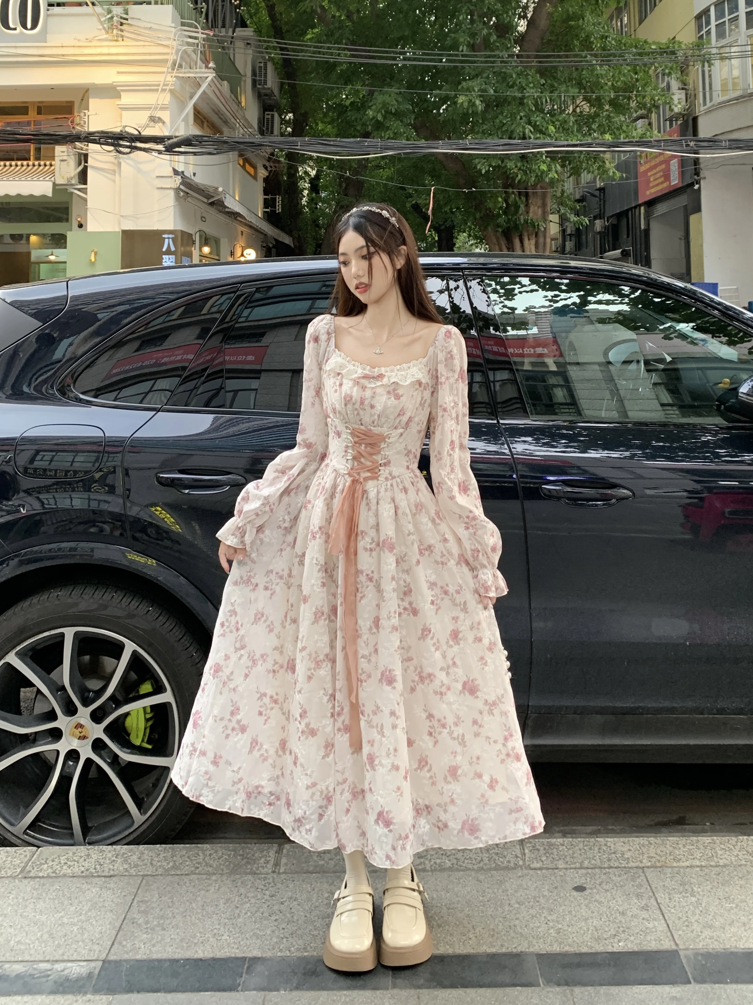 MQTIME - 2024 Large Spring French Vintage Sweet Fragmented Flowers High Waist Slimming Chiffon Embroidered Dress Long sleeved Long Skirt