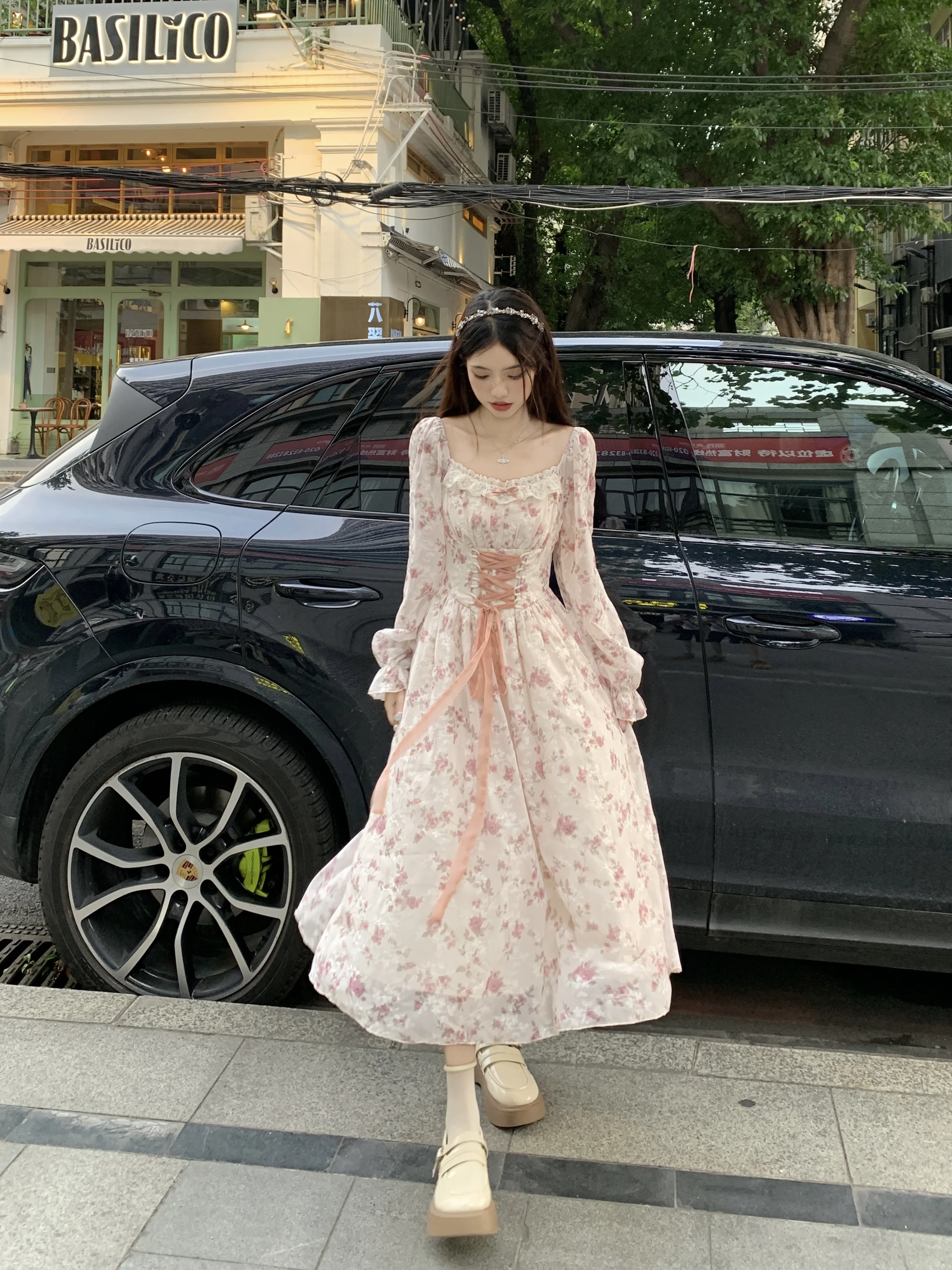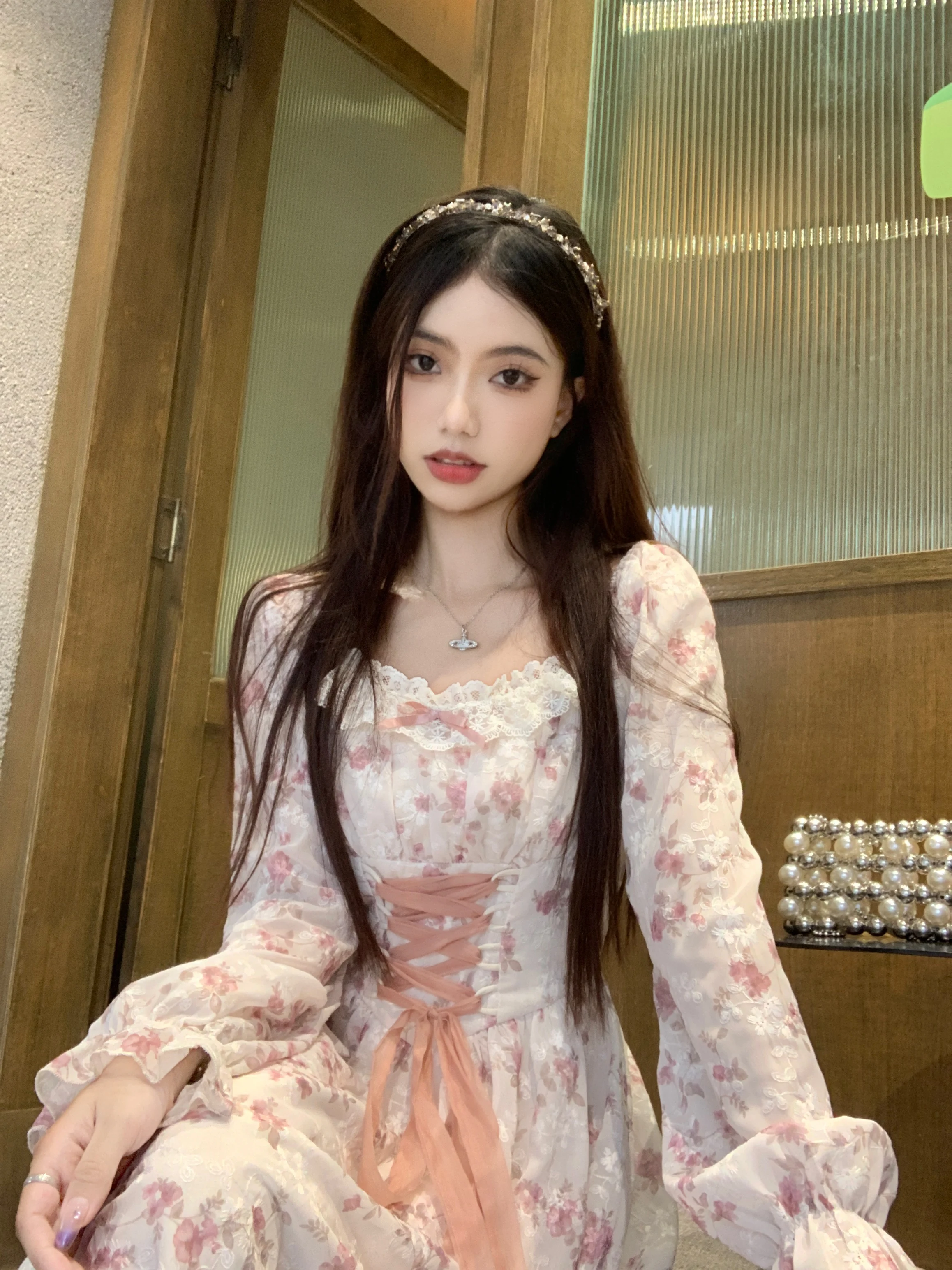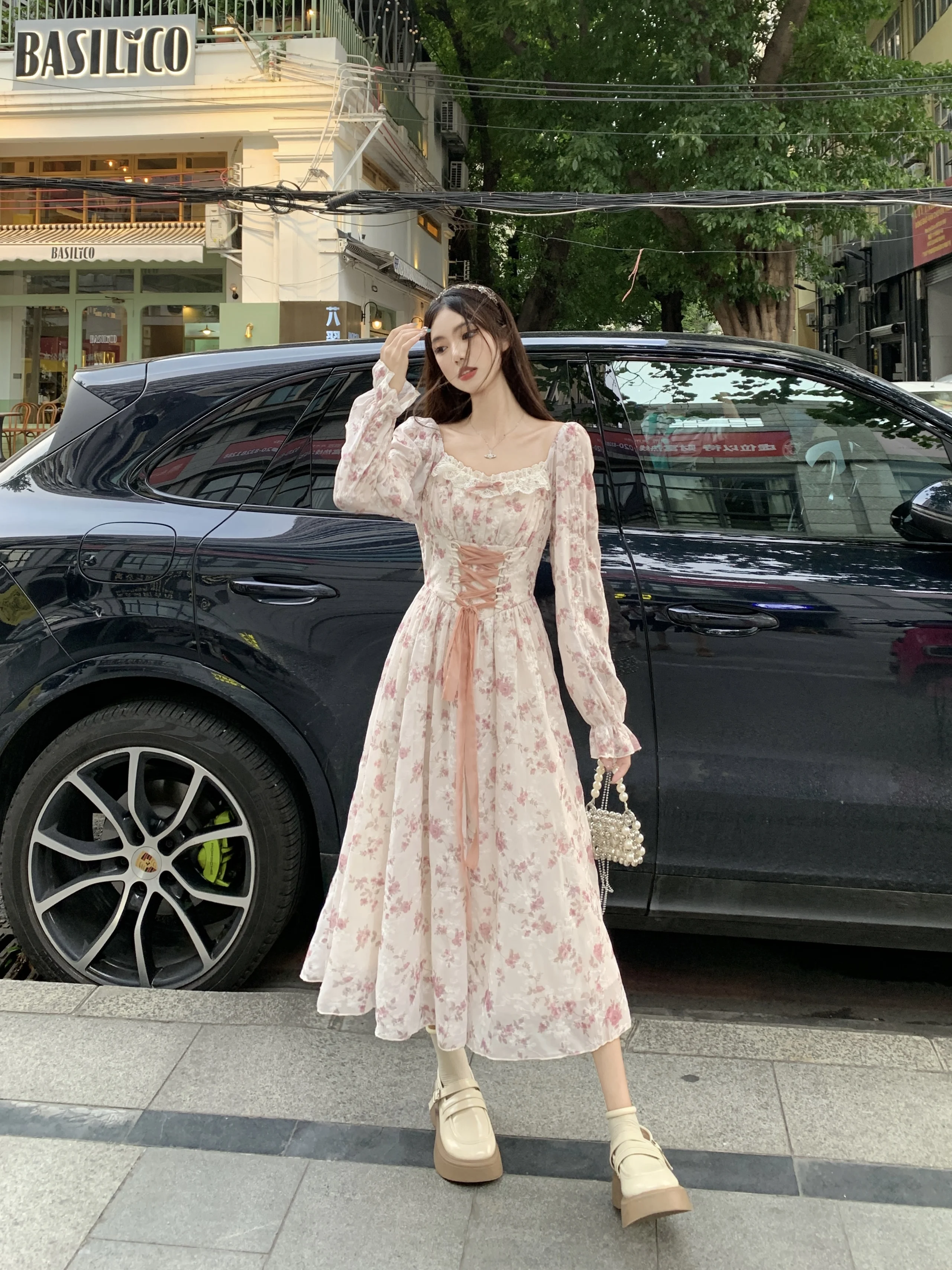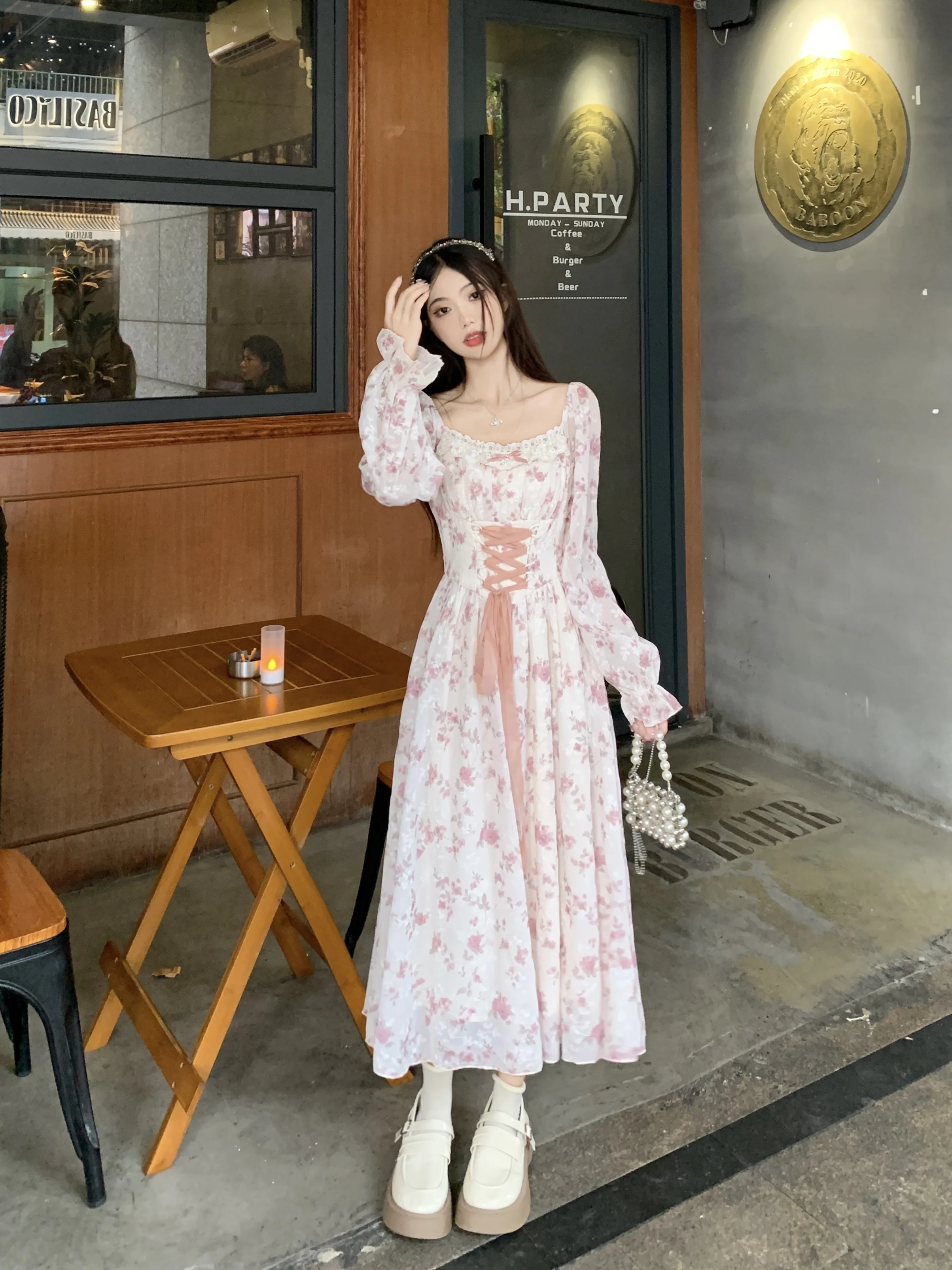 MQTIME - 2024 Large Spring French Vintage Sweet Fragmented Flowers High Waist Slimming Chiffon Embroidered Dress Long sleeved Long Skirt
