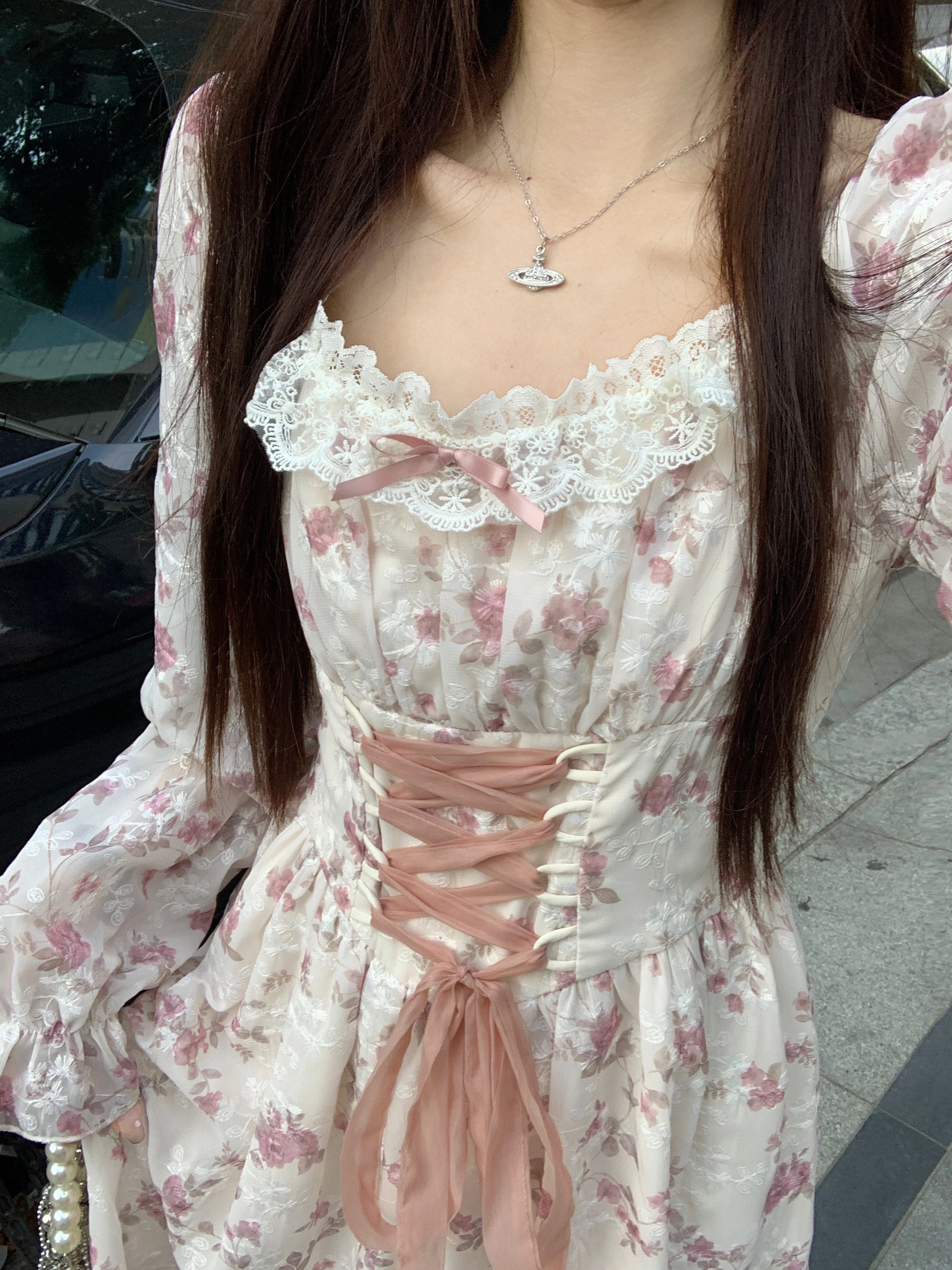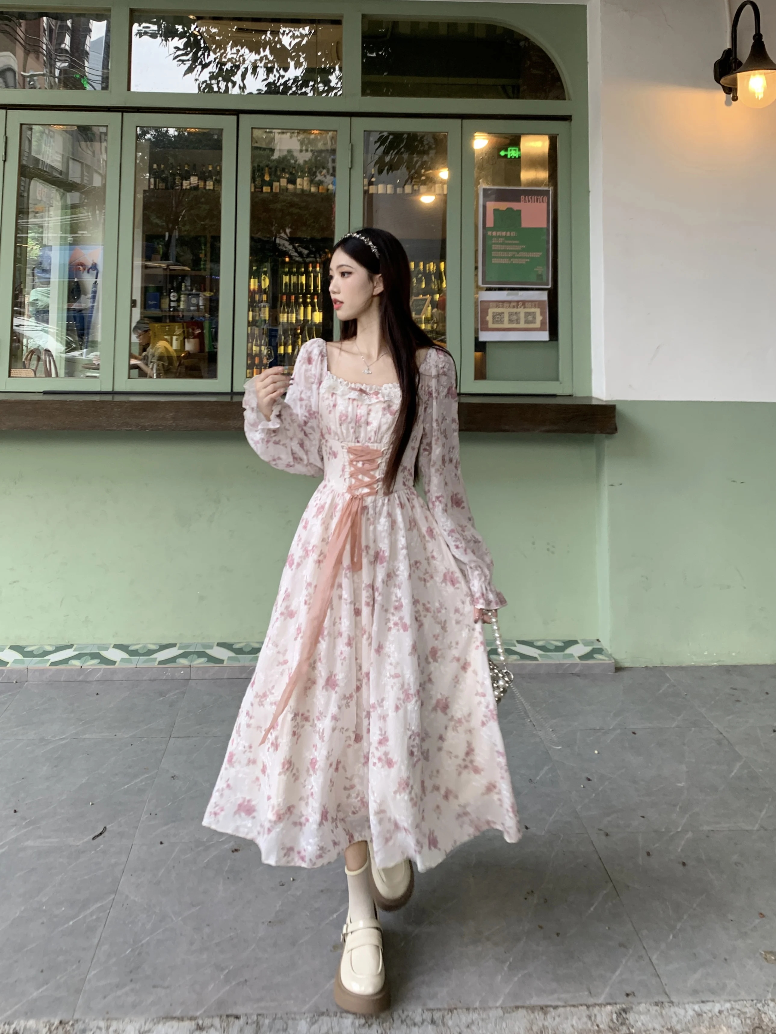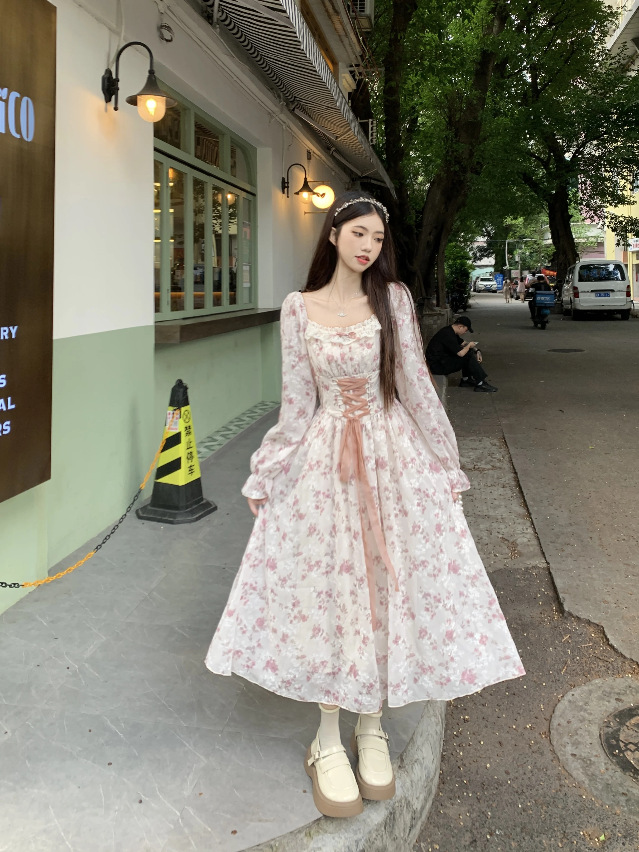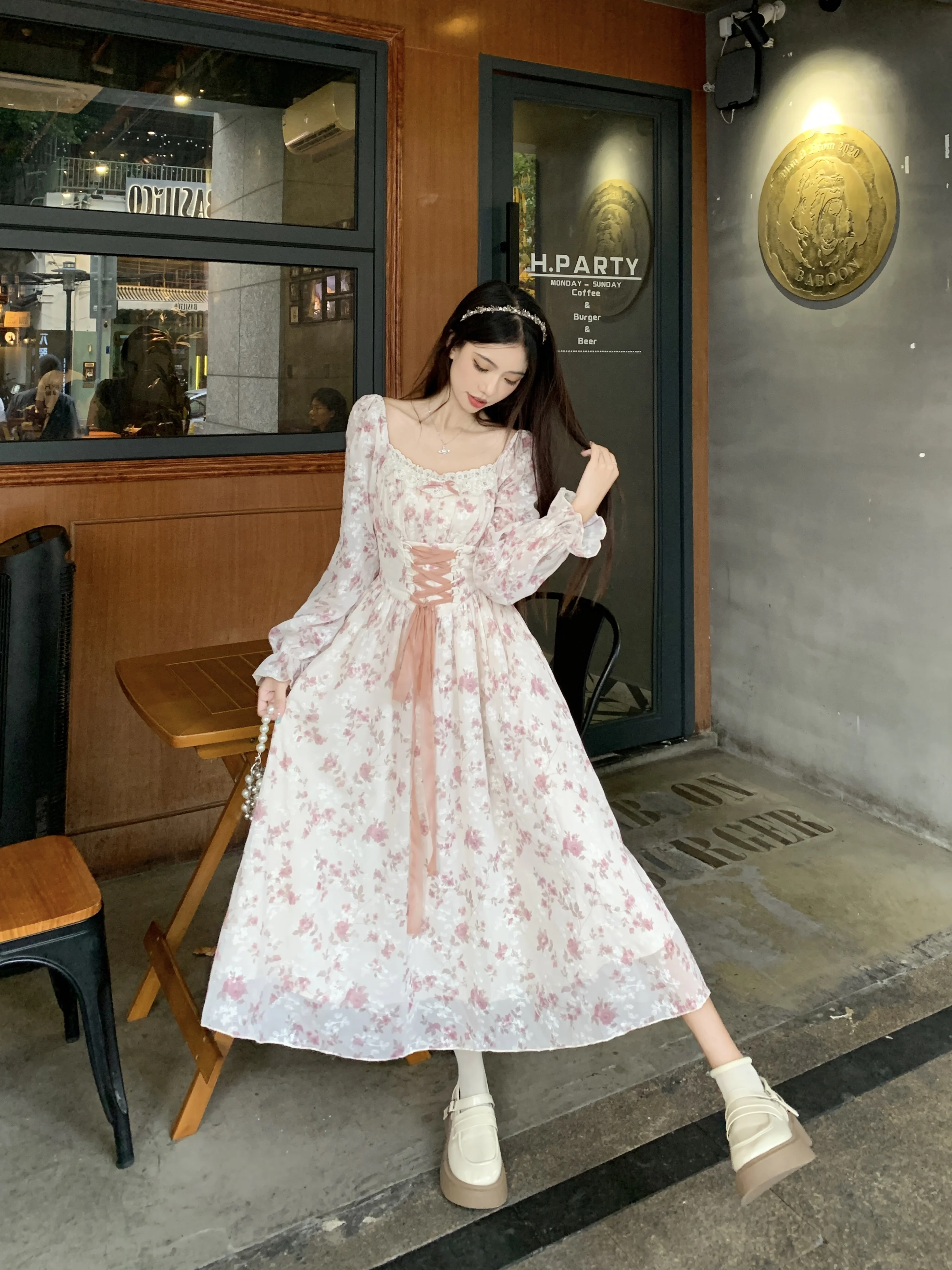 MQTIME - 2024 Large Spring French Vintage Sweet Fragmented Flowers High Waist Slimming Chiffon Embroidered Dress Long sleeved Long Skirt