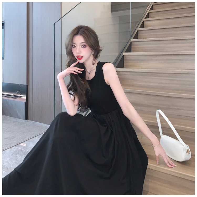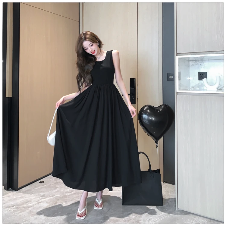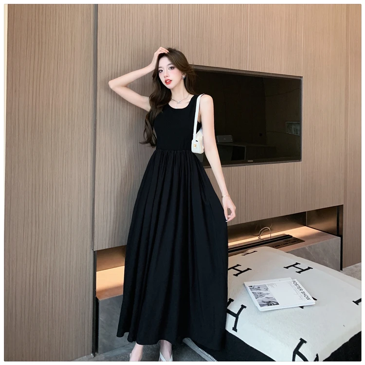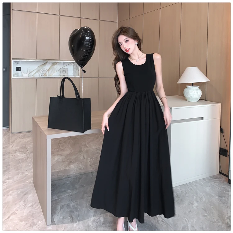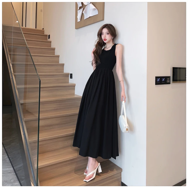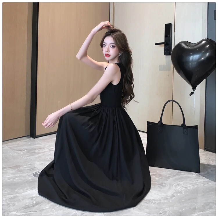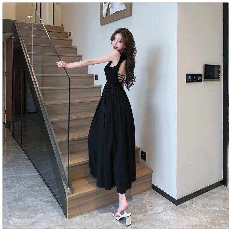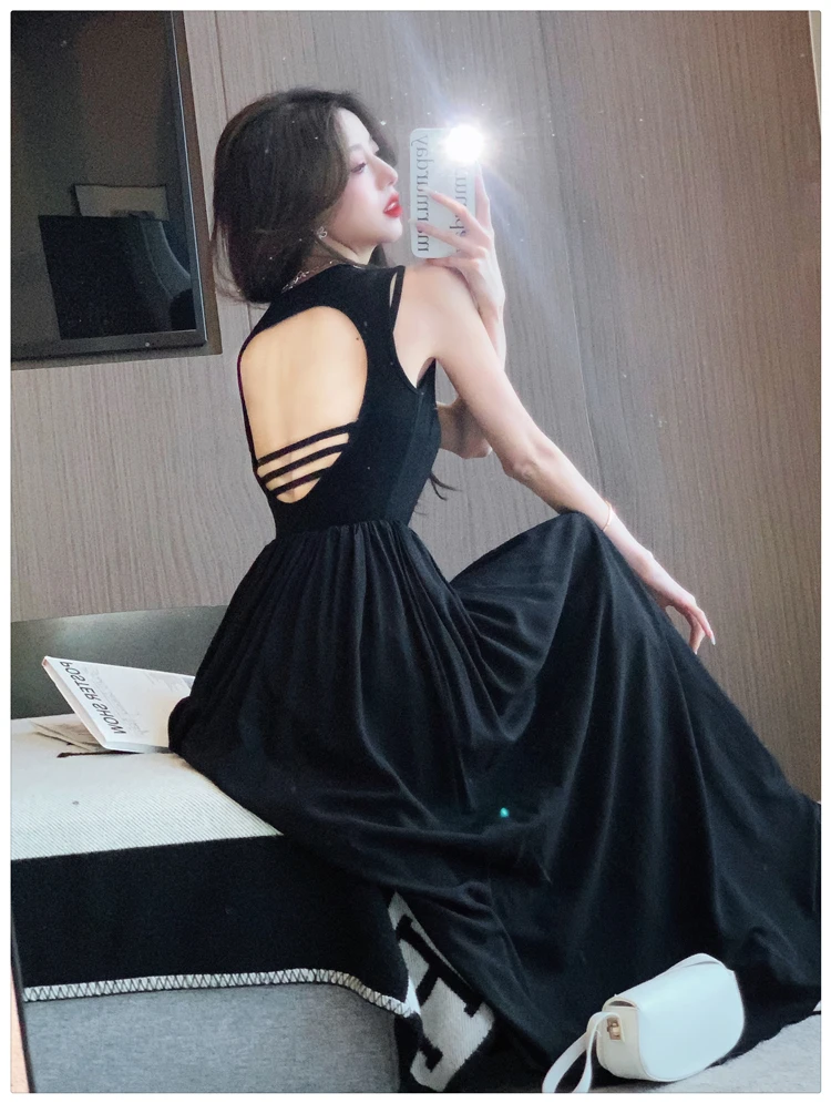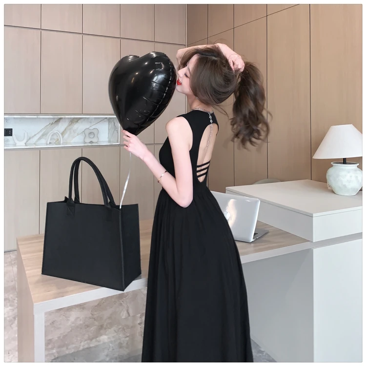 MQTIME - 2024 Summer Style Open Back Dress with Black Hepburn Style, High end, Slim Fit, Beach Vacation Solid Color Long Dress for Women