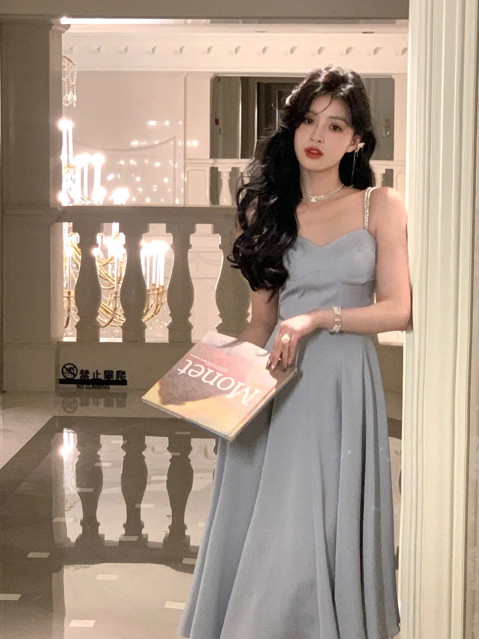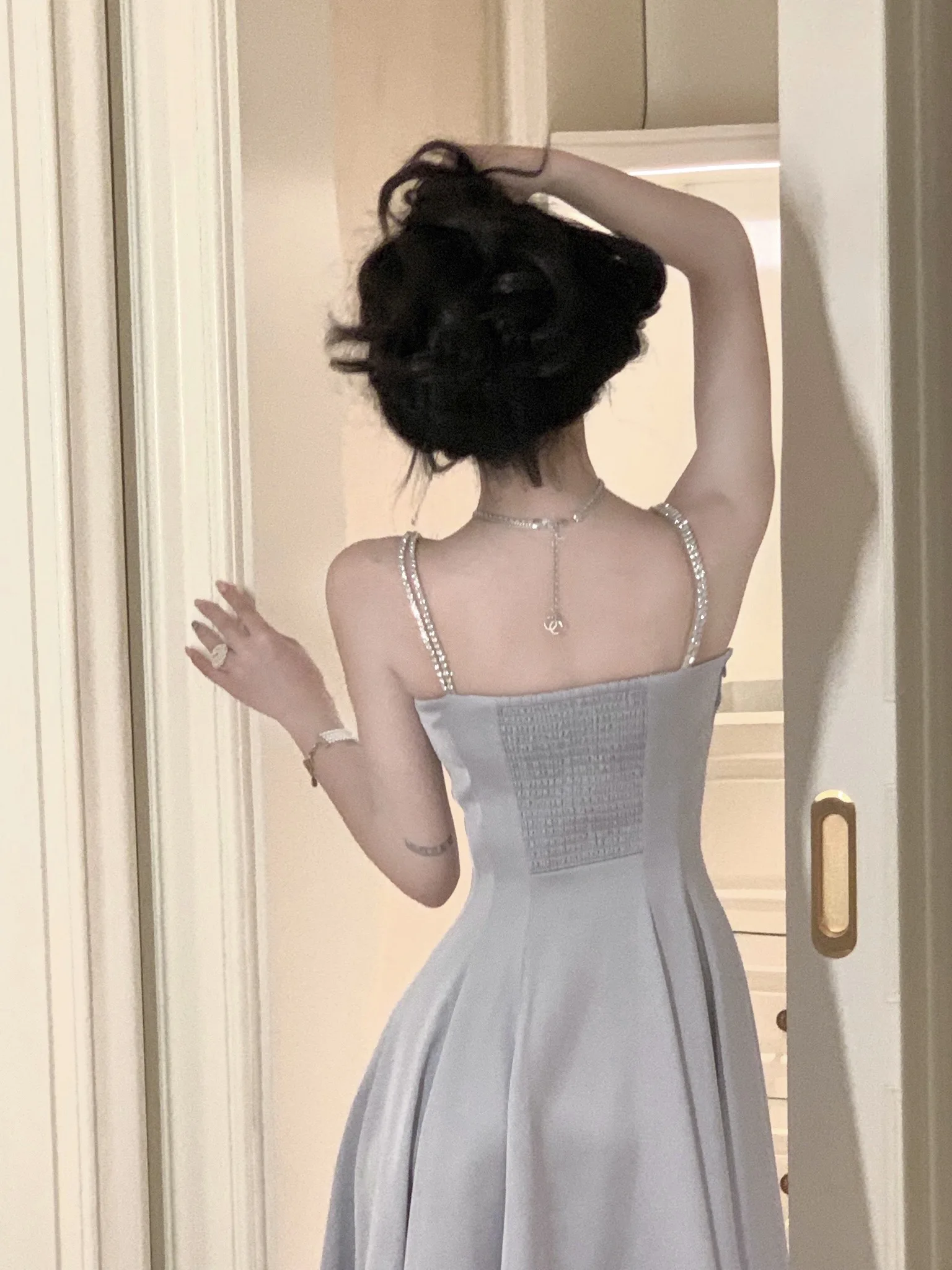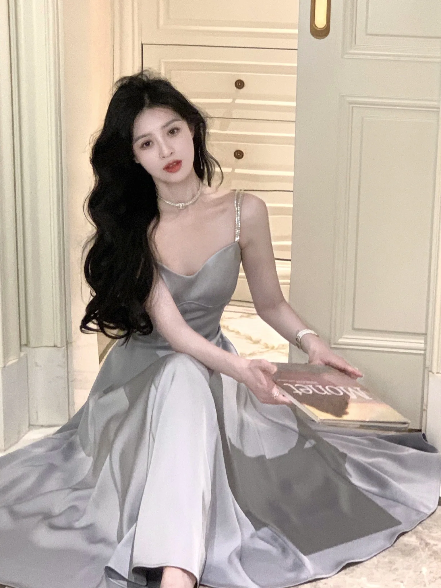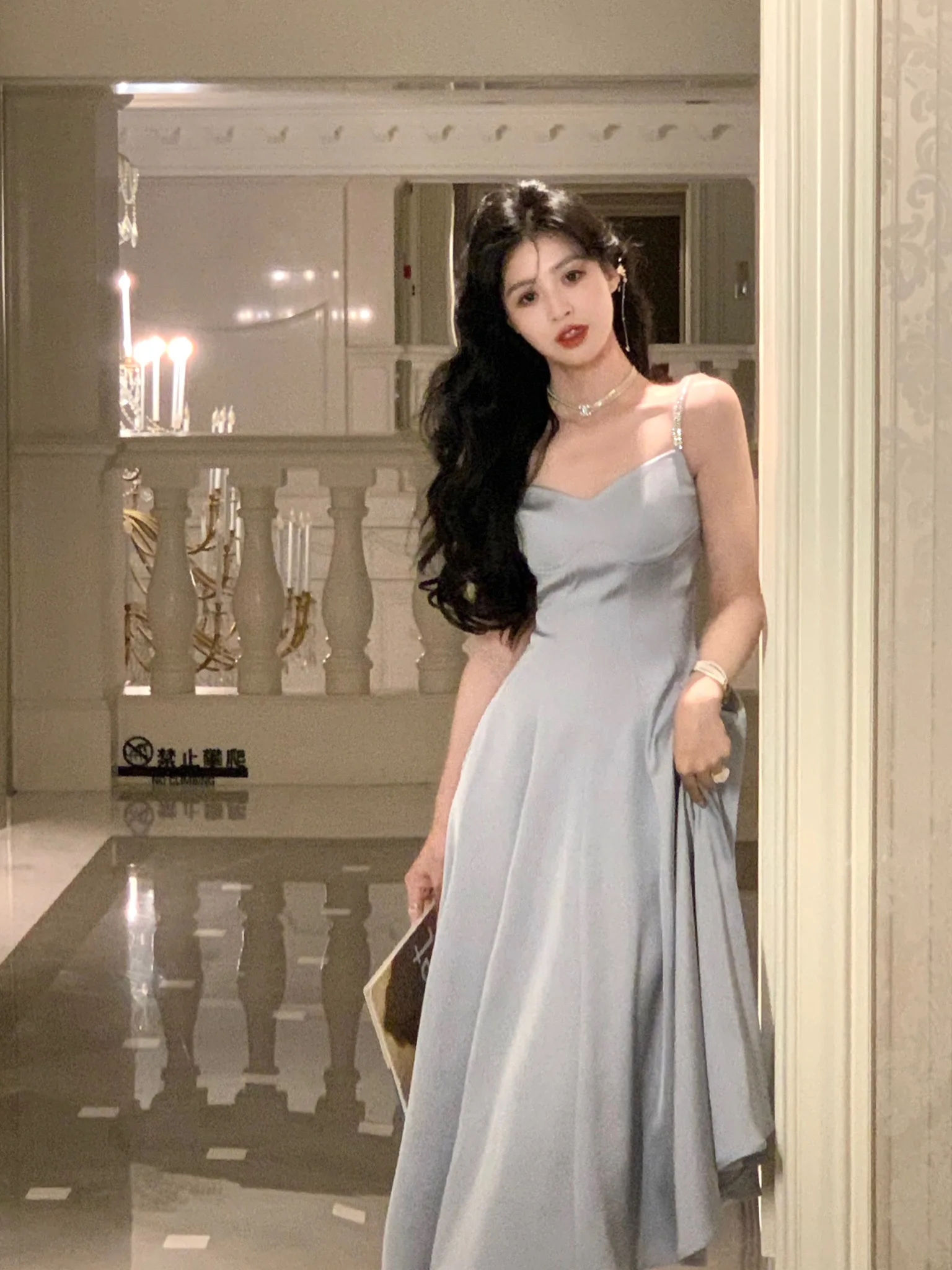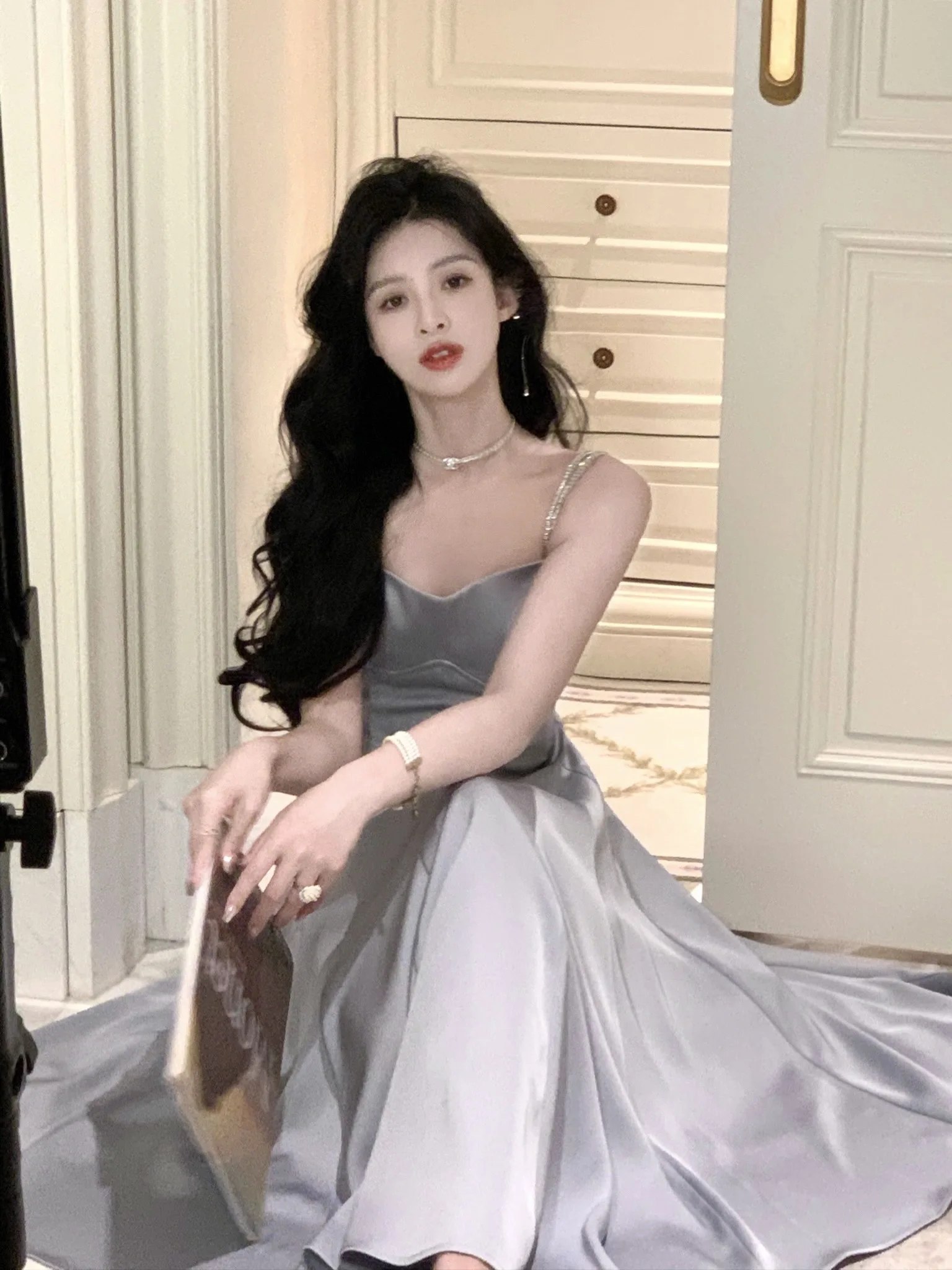MQTIME - Elegant Diamond Chain Satin Dress Women Slim A-line Vintage Evening Party Dresses Ladies Summer Beach Long Robe