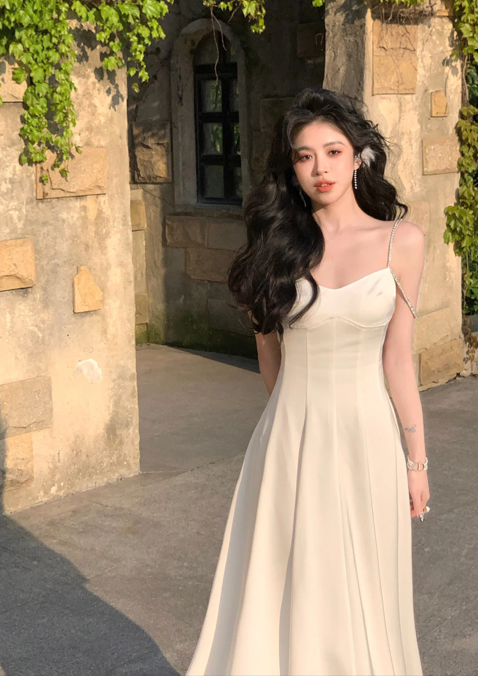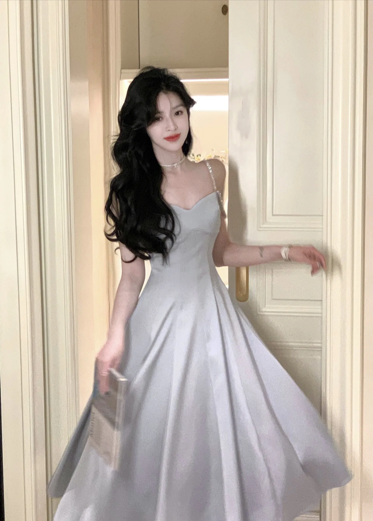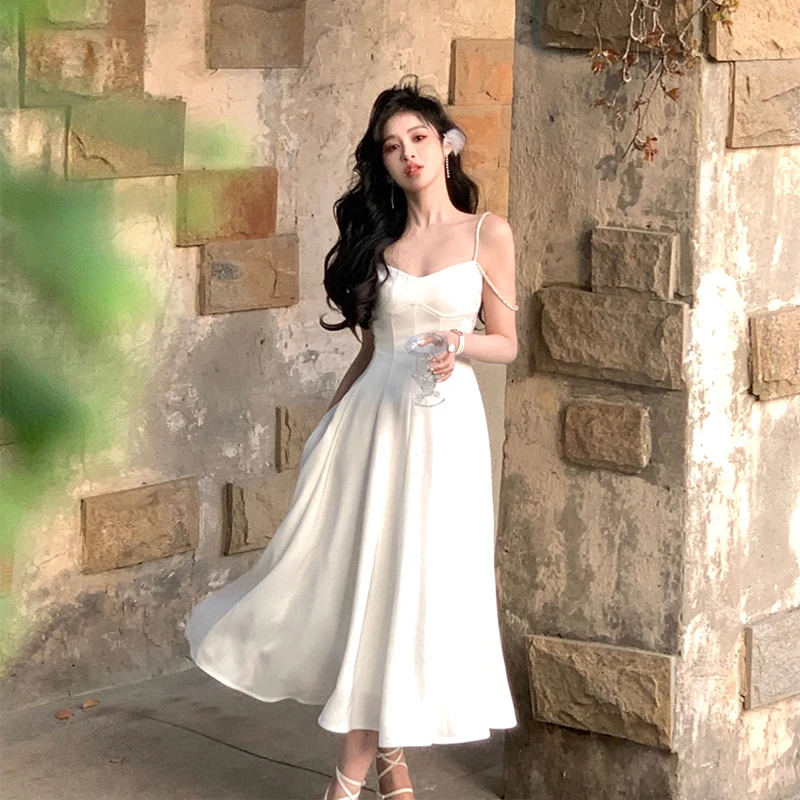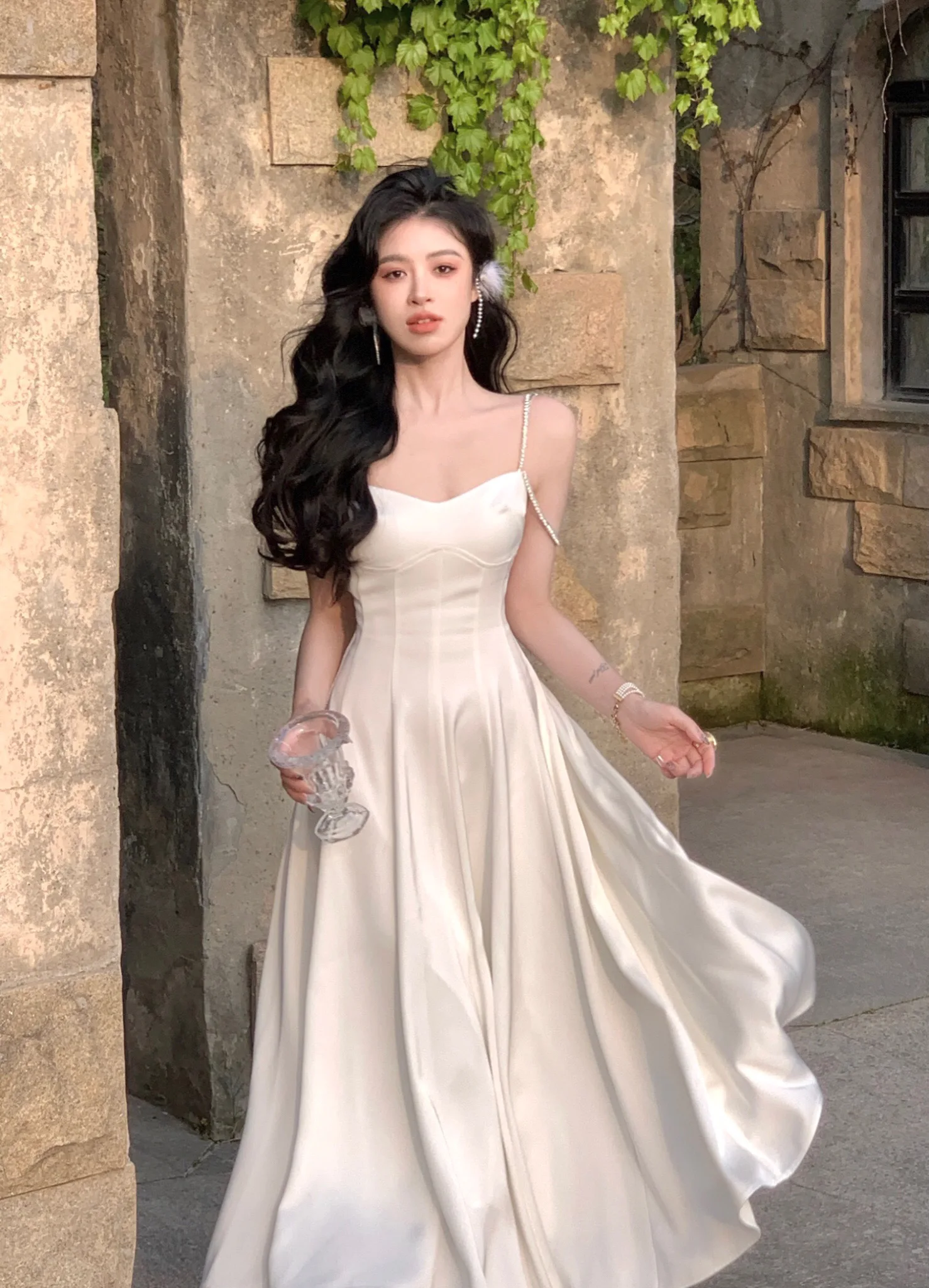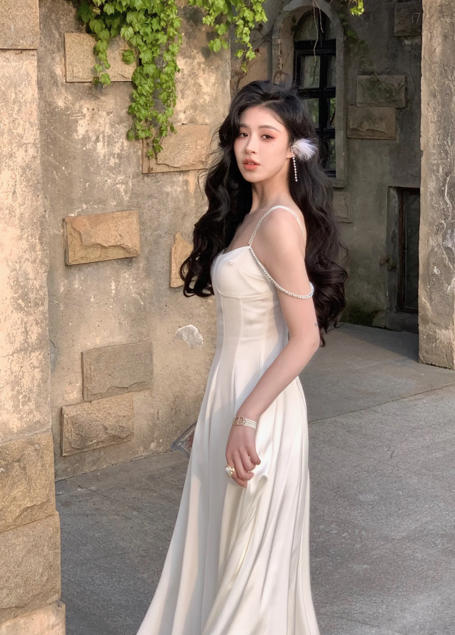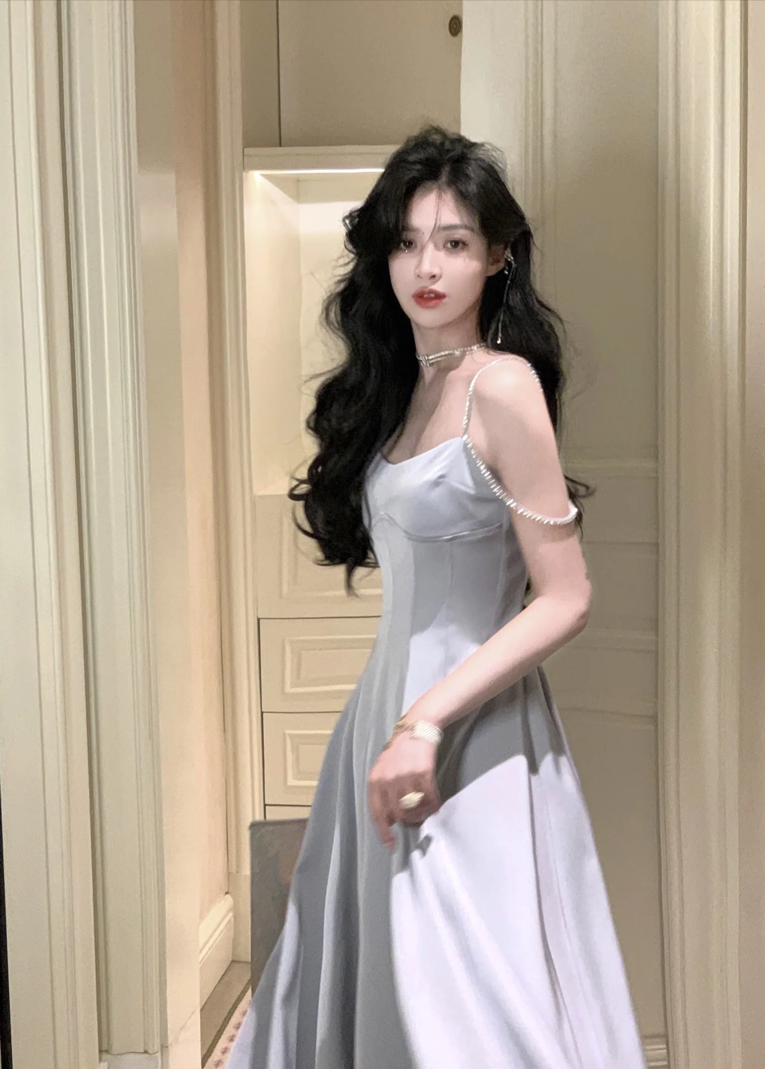 MQTIME - Elegant Diamond Chain Satin Dress Women Slim A-line Vintage Evening Party Dresses Ladies Summer Beach Long Robe