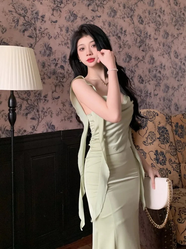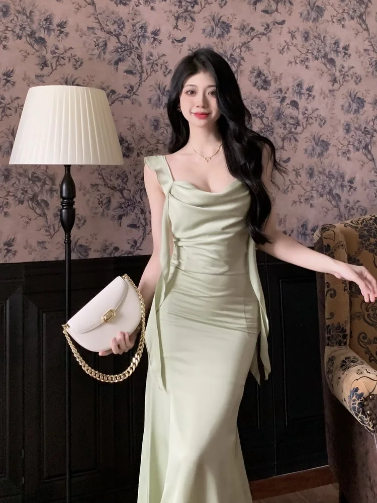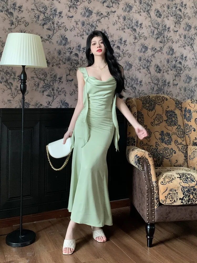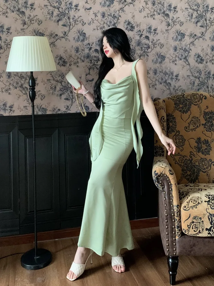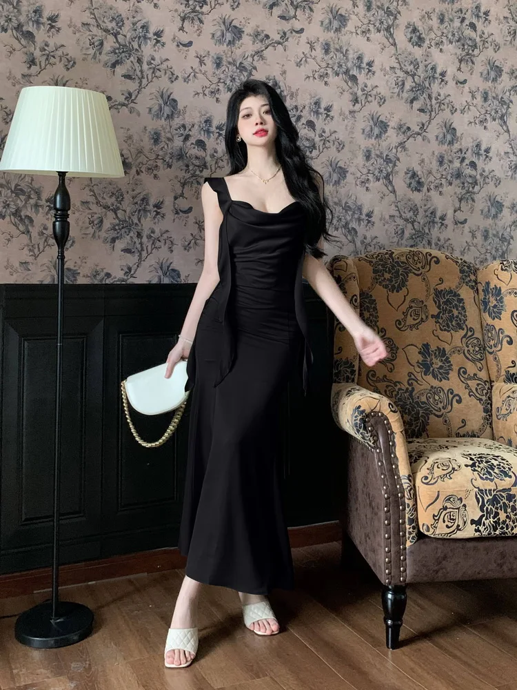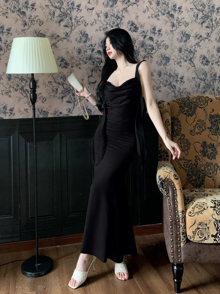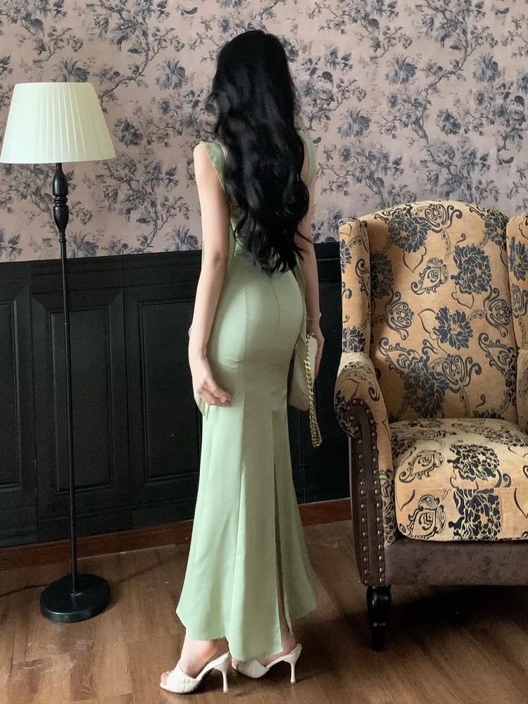 MQTIME - Large size temperament French waist with ruffle edge shoulder strap fishtail dress sleeveless swing collar long skirt for women