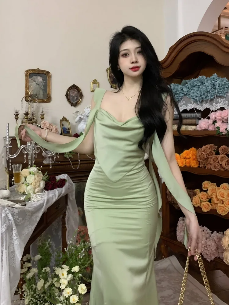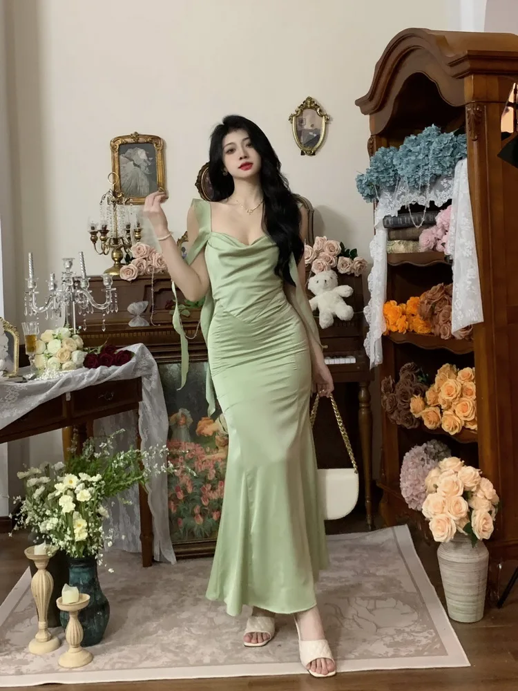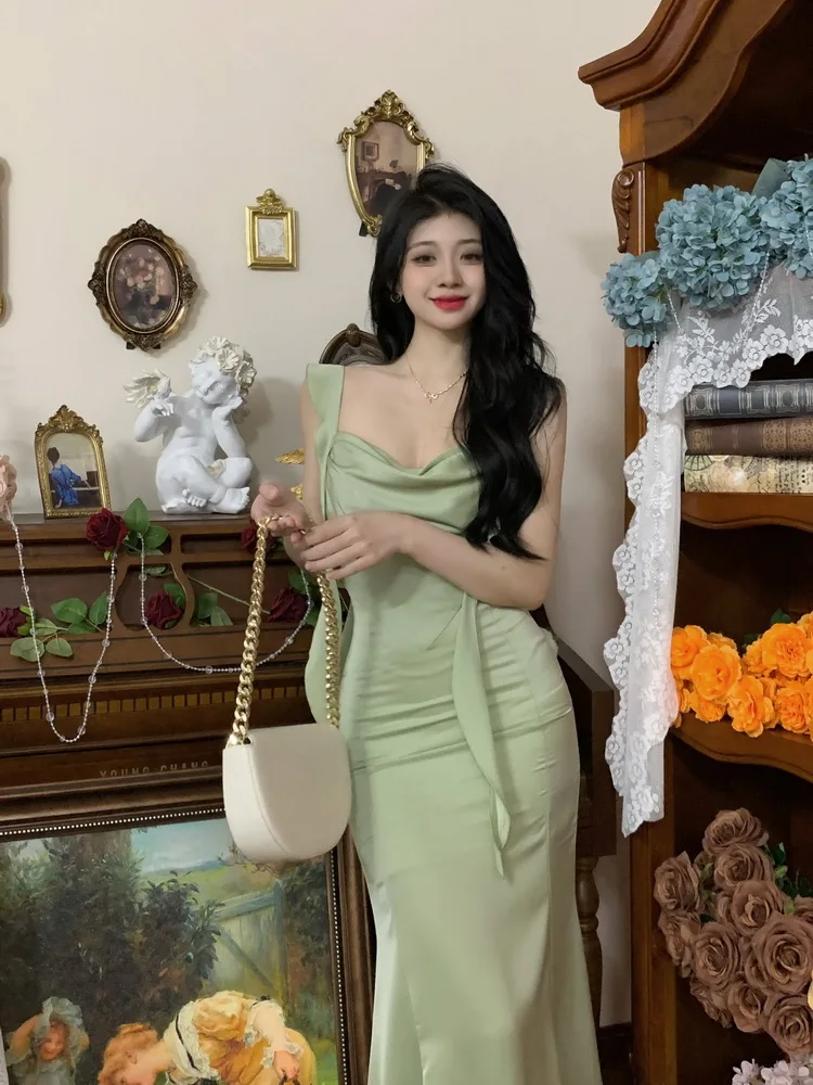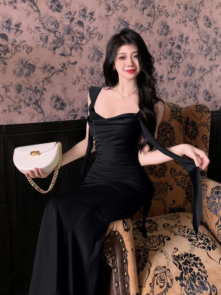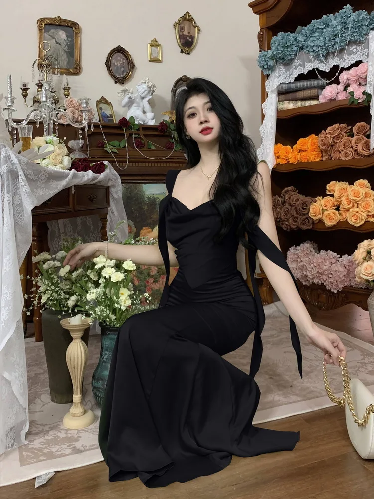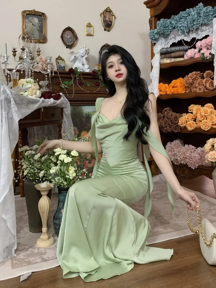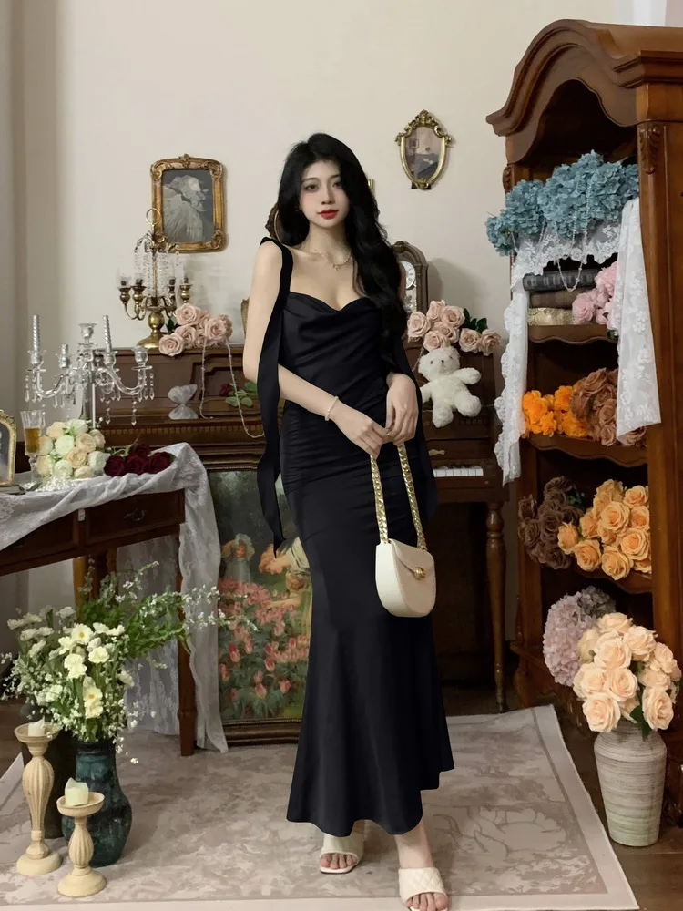 MQTIME - Large size temperament French waist with ruffle edge shoulder strap fishtail dress sleeveless swing collar long skirt for women