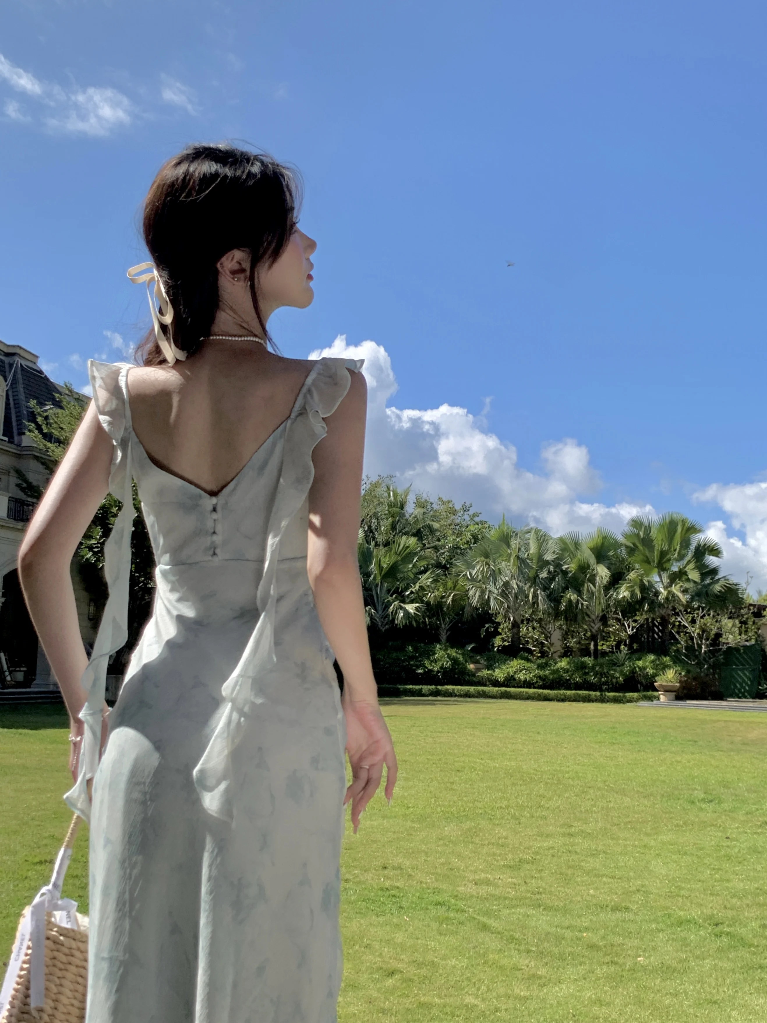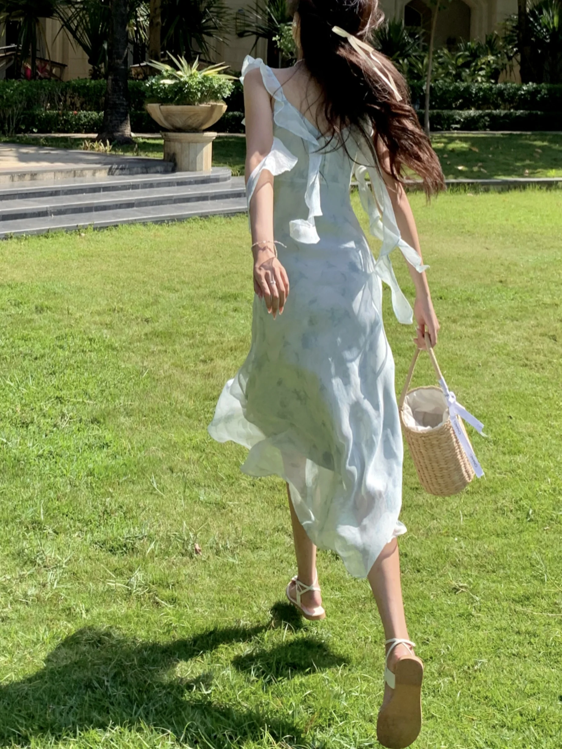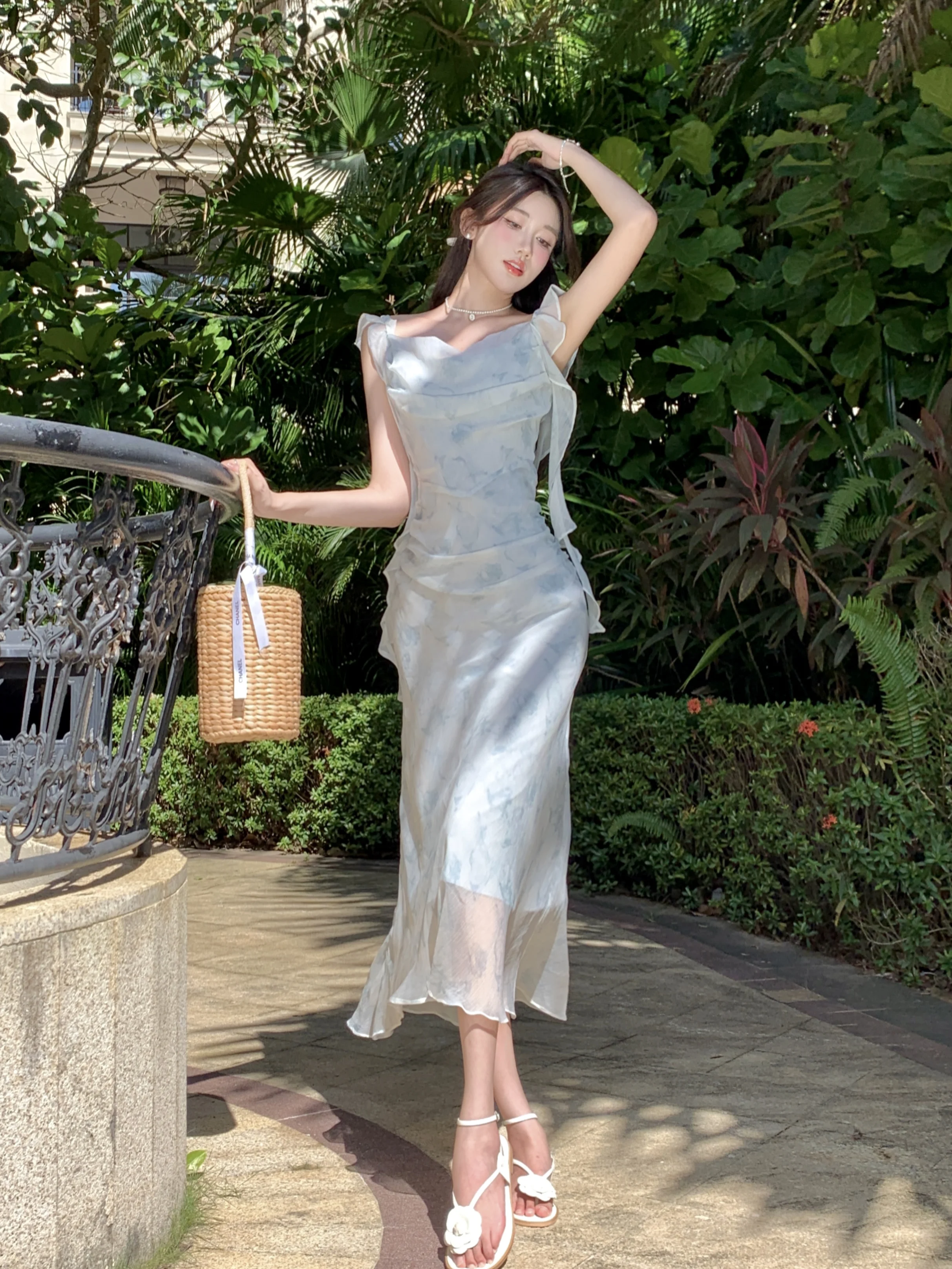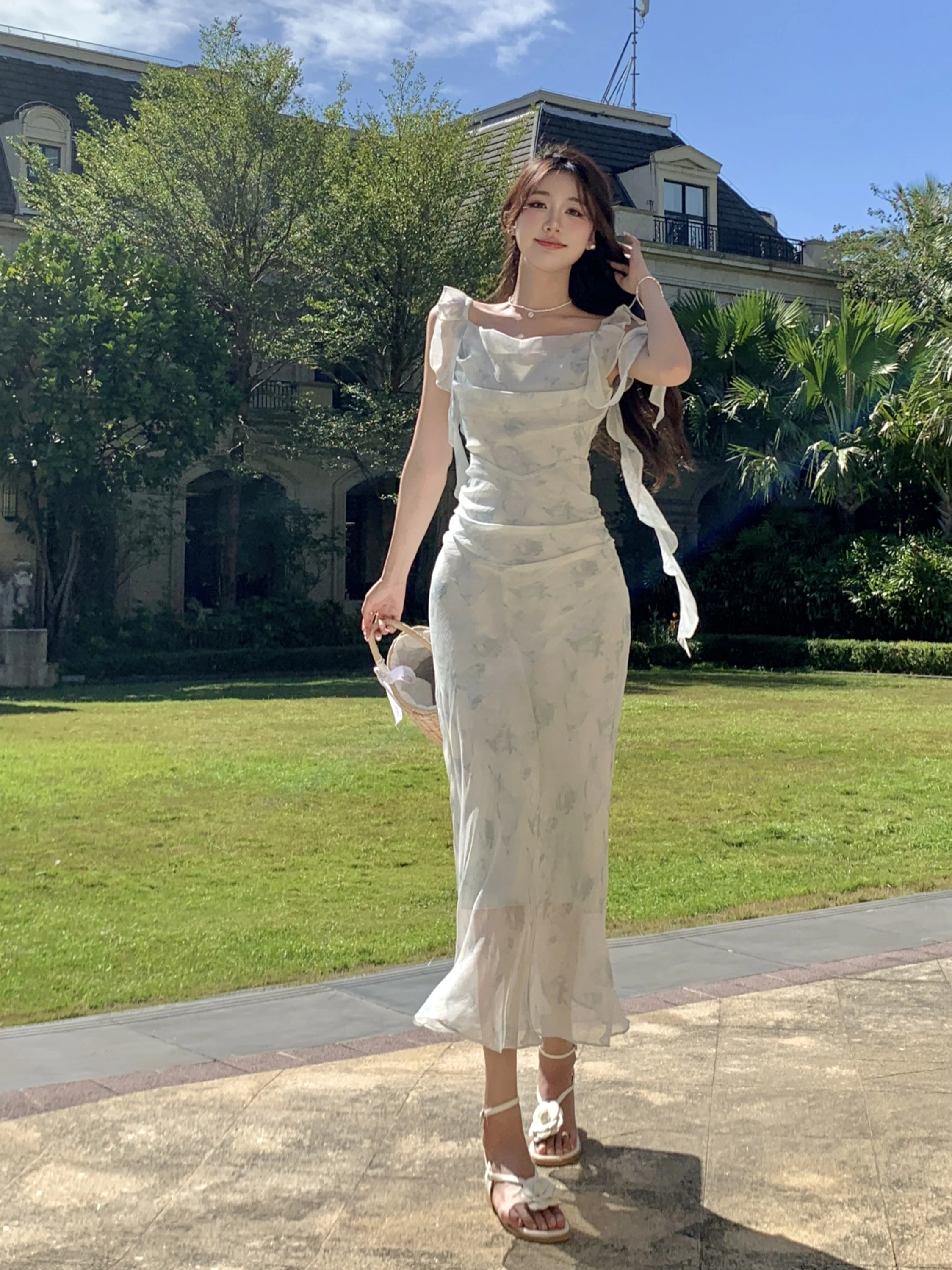 MQTIME - Summer Fringe Blue Halo Dyed Fragmented Flower Chiffon Suspended Dress Medium Long Waist Sleeveless Beach Style Sweet Fish Tail