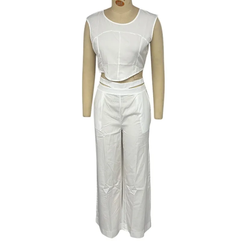 MQTIME - 2 Piece Set Women Clothing Casual Elegant Solid Sleeveless Square Neck Slim Top Loose Wide Legs Hollow Out Pants Sets