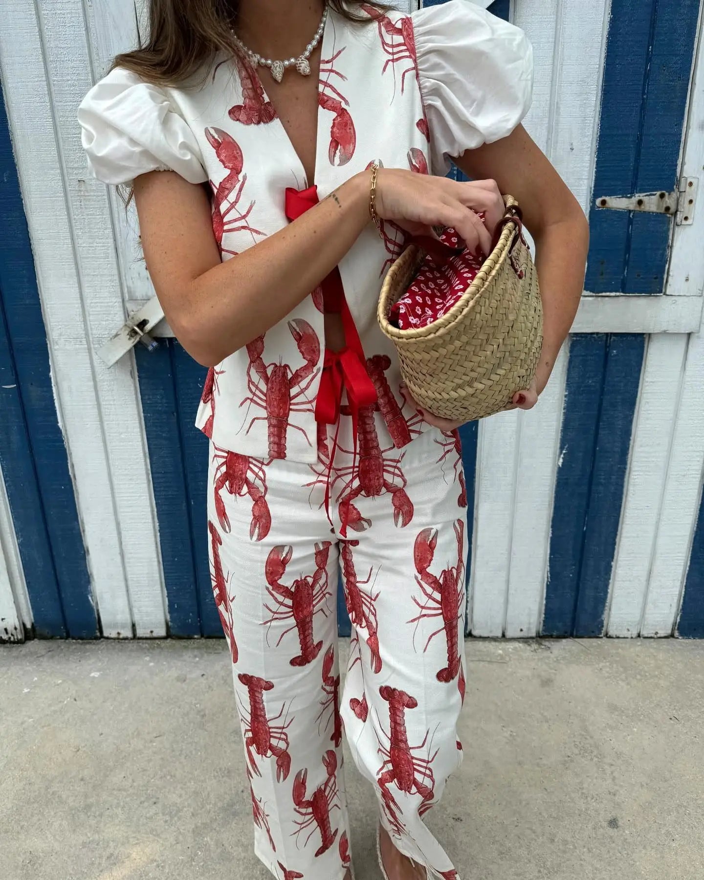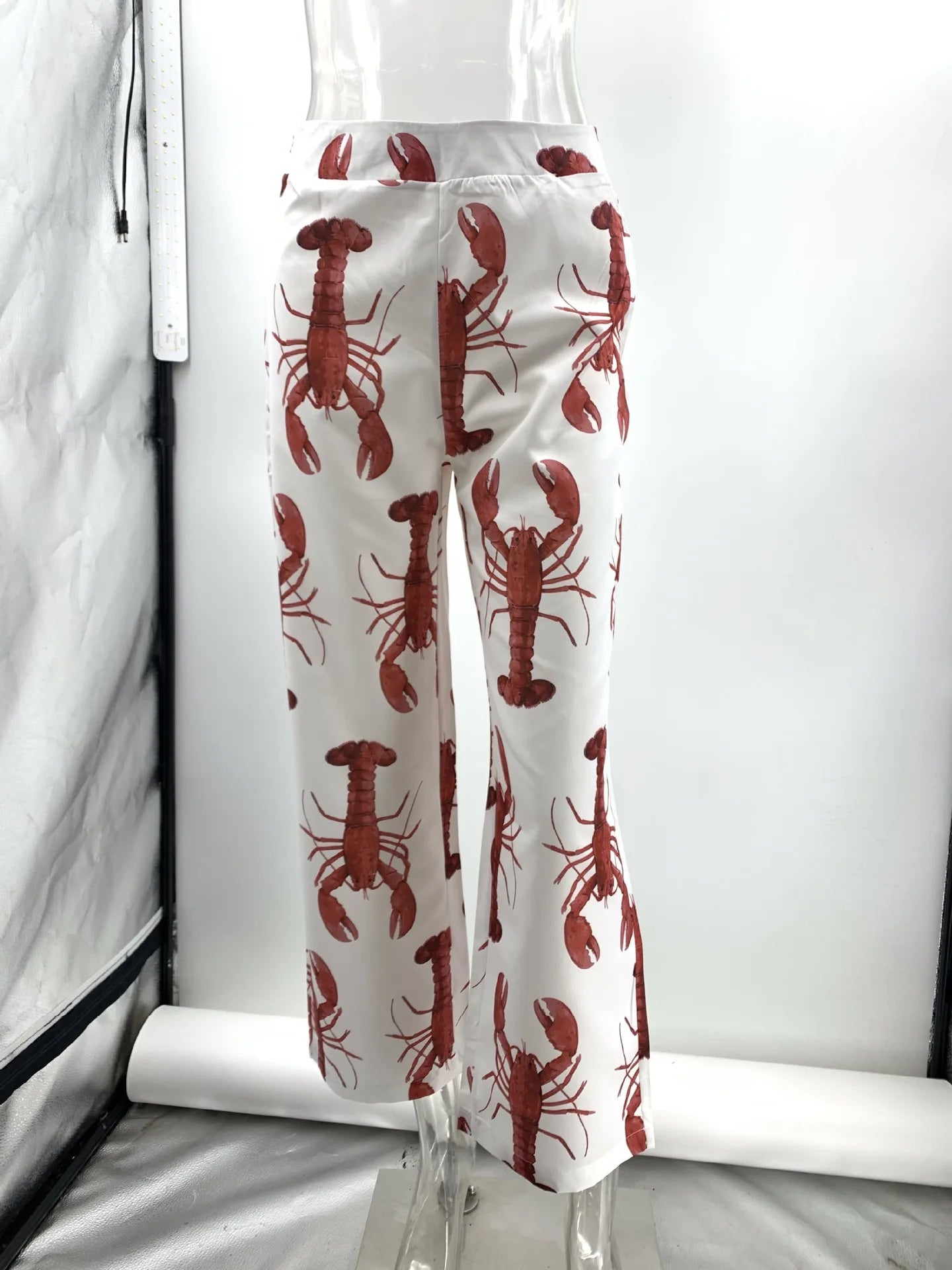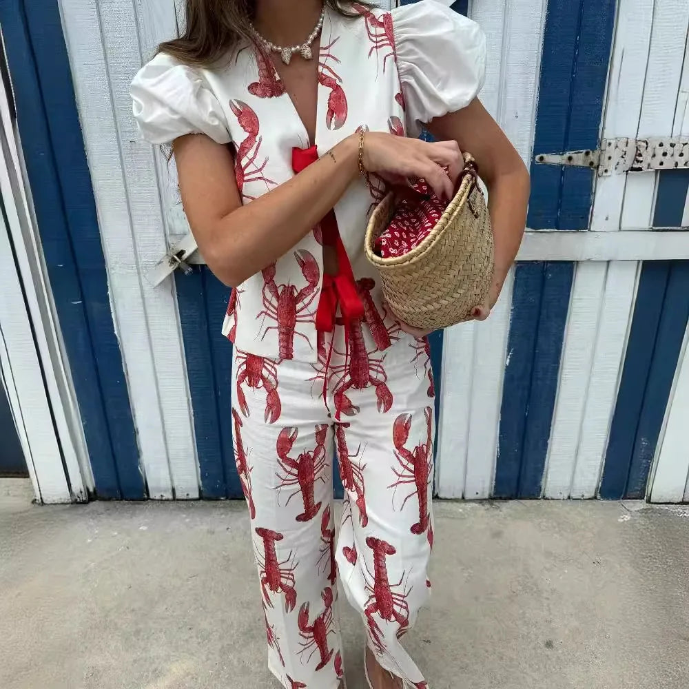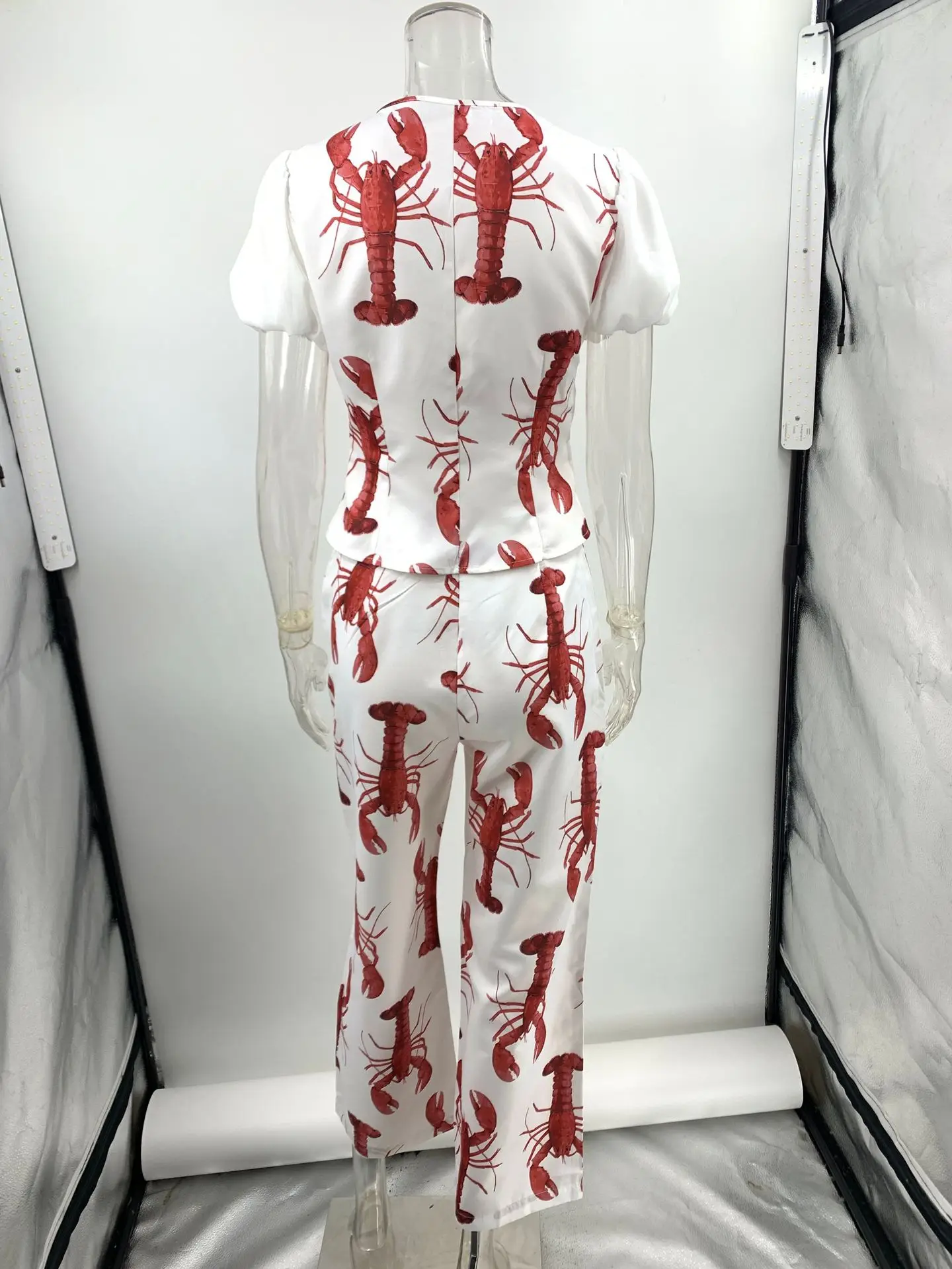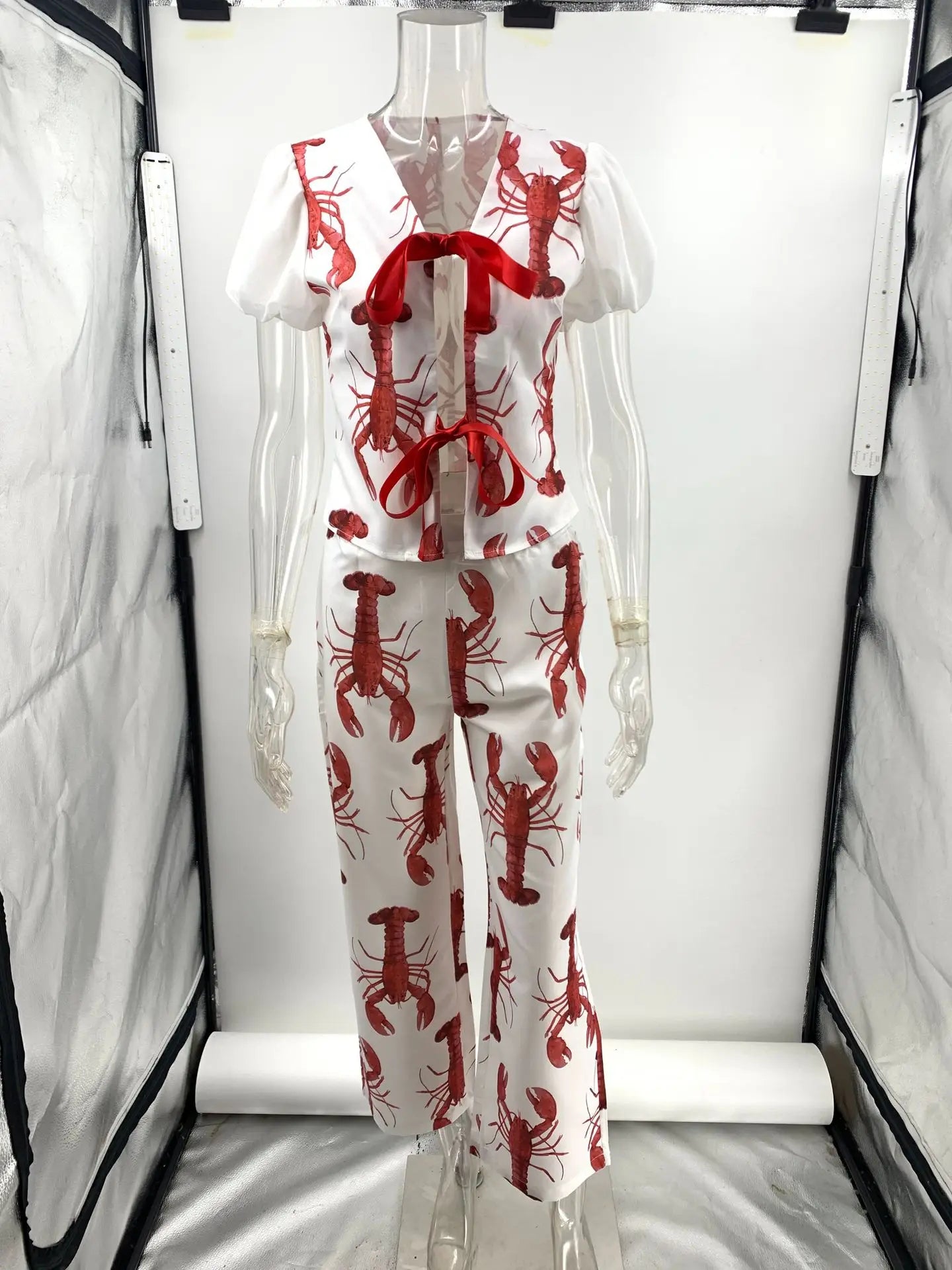 MQTIME - Cartoon Cray Printing Long Pants Set For Women 2024 Summer Short Sleeve Shirt High Waist Wide Leg Pant 2 Piece Sets Lady Outfits