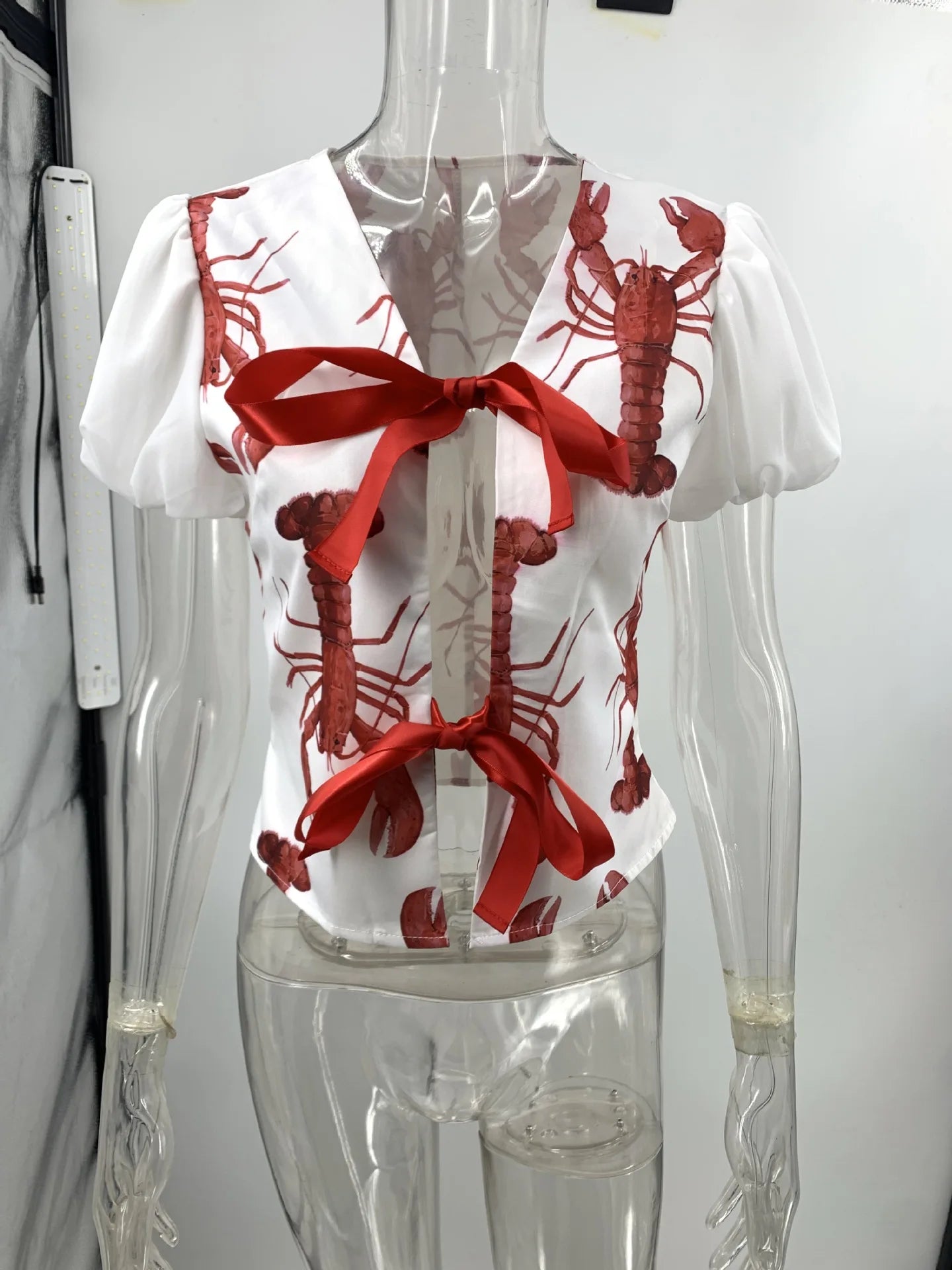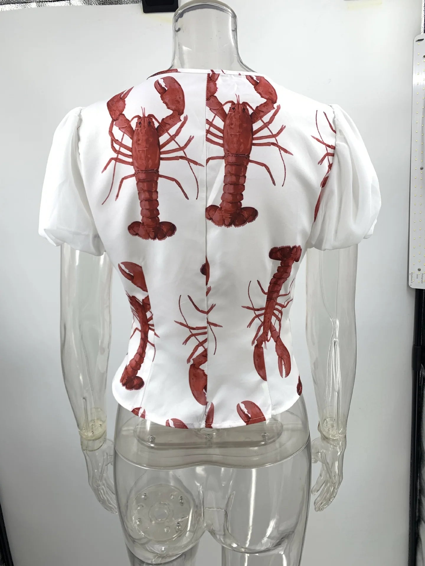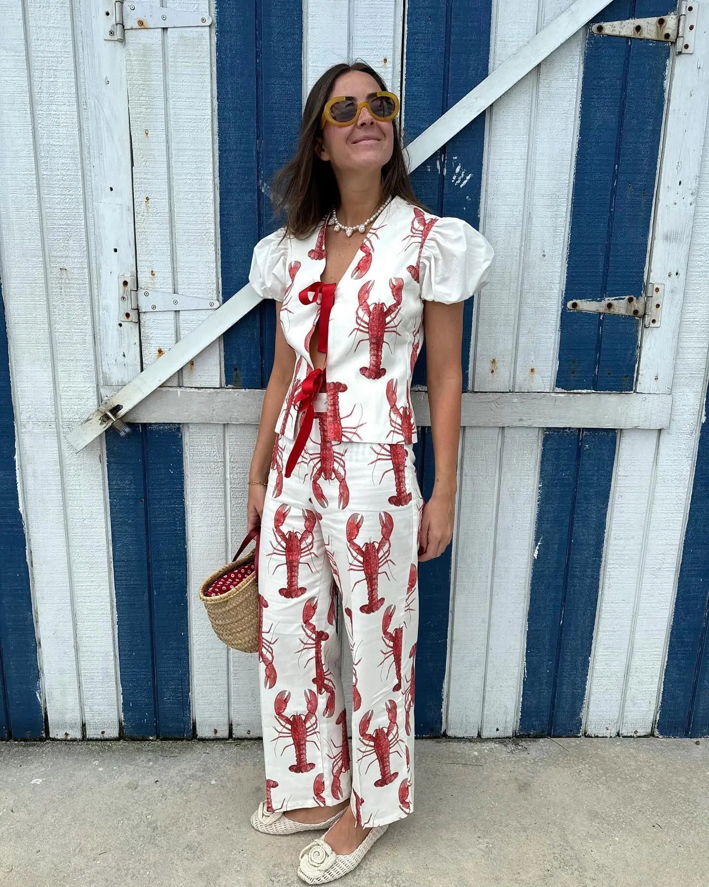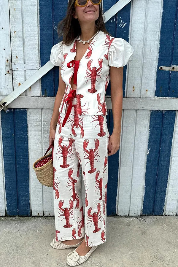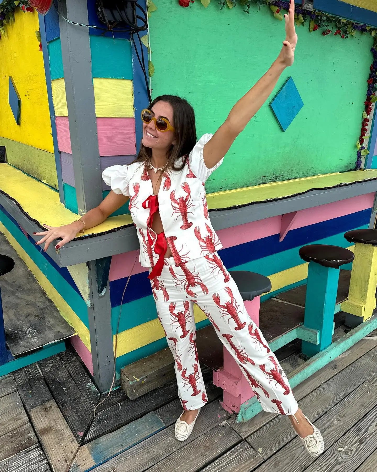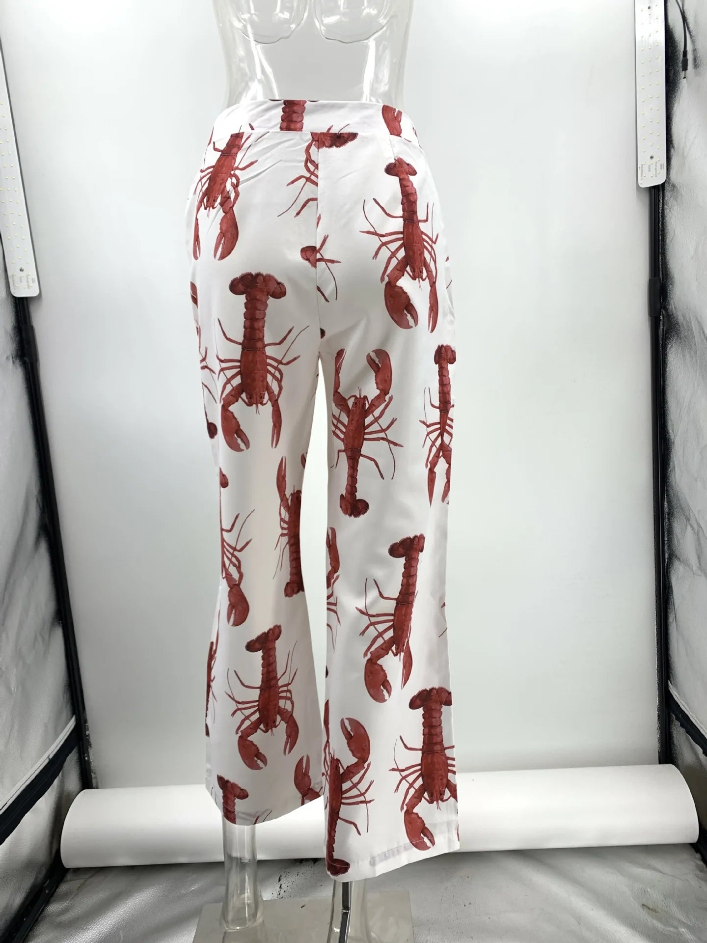 MQTIME - Cartoon Cray Printing Long Pants Set For Women 2024 Summer Short Sleeve Shirt High Waist Wide Leg Pant 2 Piece Sets Lady Outfits