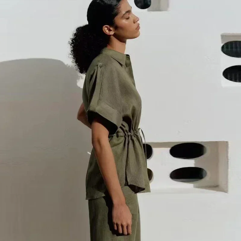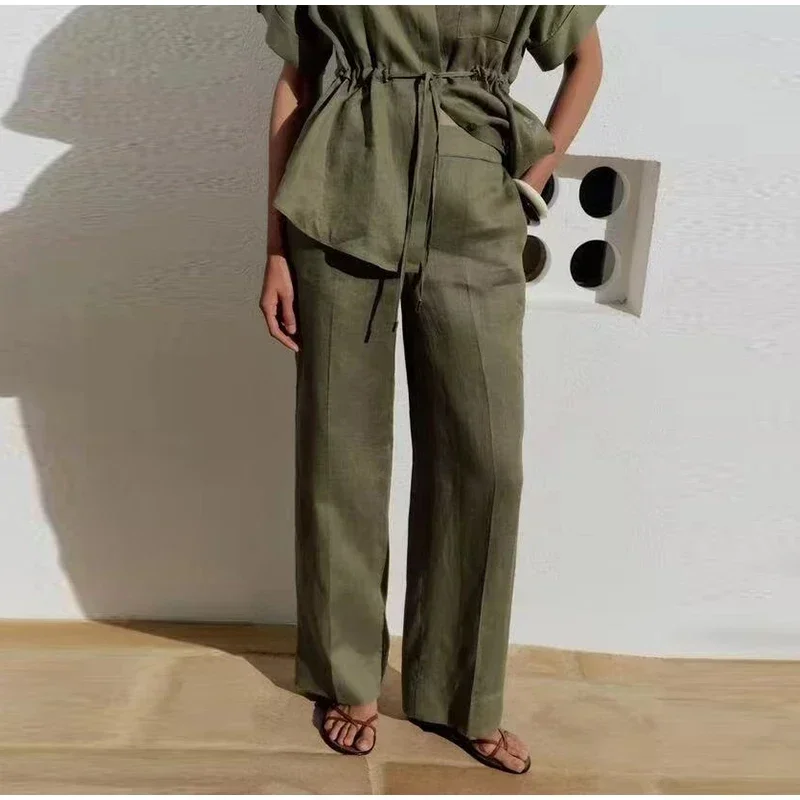 MQTIME - Casual Pants Sets For Women 2 Pieces Lace-up Lapel Shirts Top Elastic Waist Pants Women's Suit Two Piece Set 2024 Summer Outfits