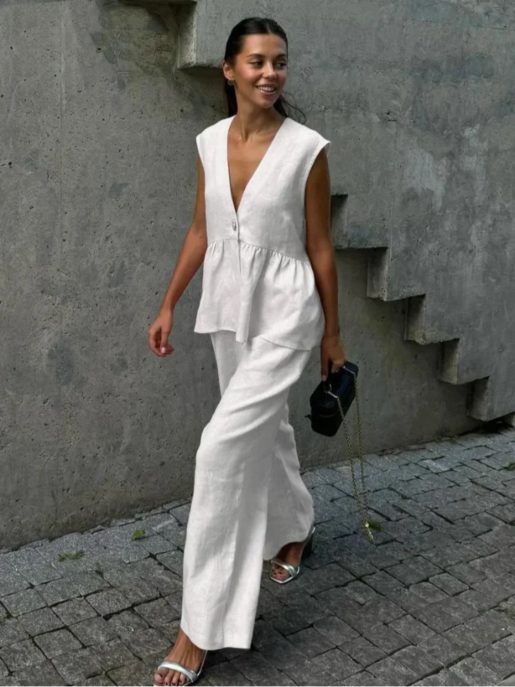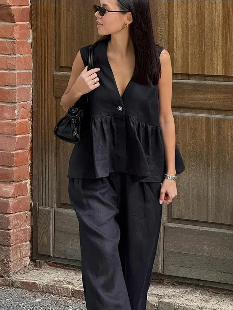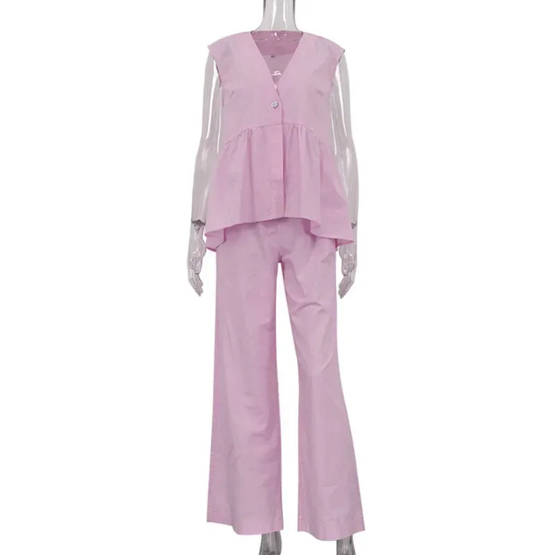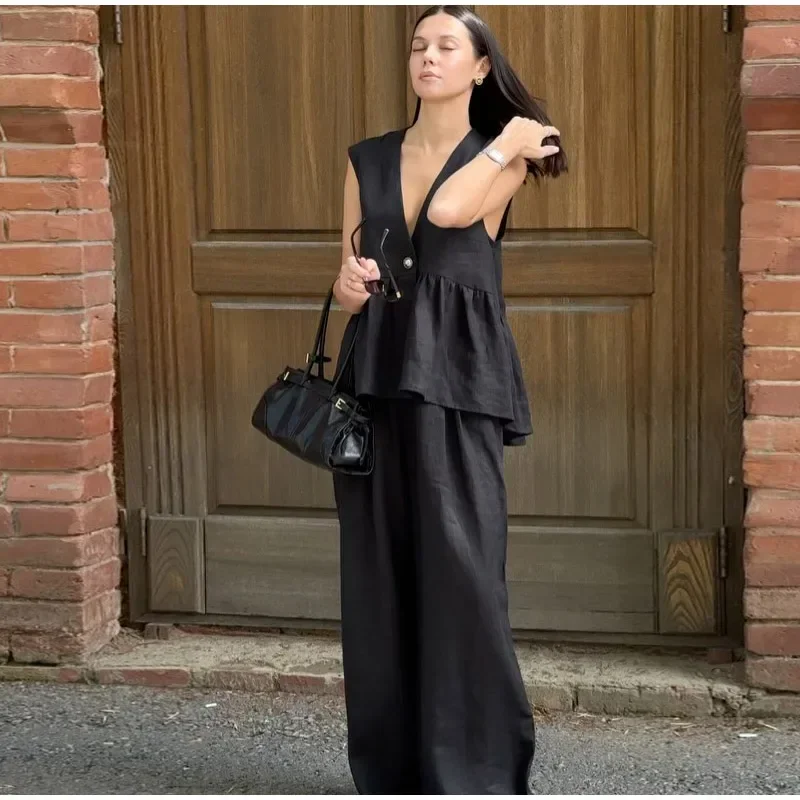 MQTIME  -  Fashion Solid Elastic Waist Wide Leg Loose Pants Suit Women Sleeveless Off Shoulder Ruffles Deep V-neck Top Sets New Street Wear