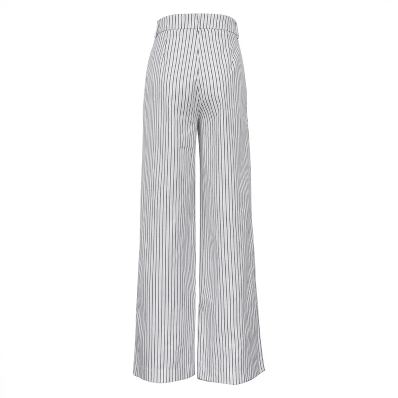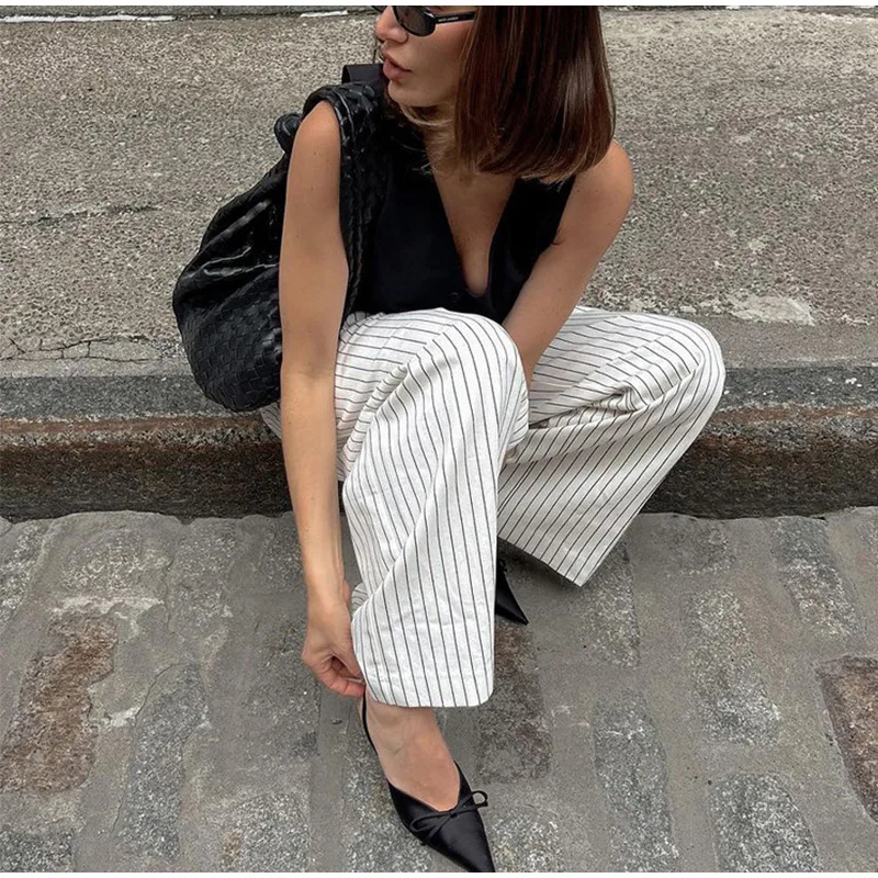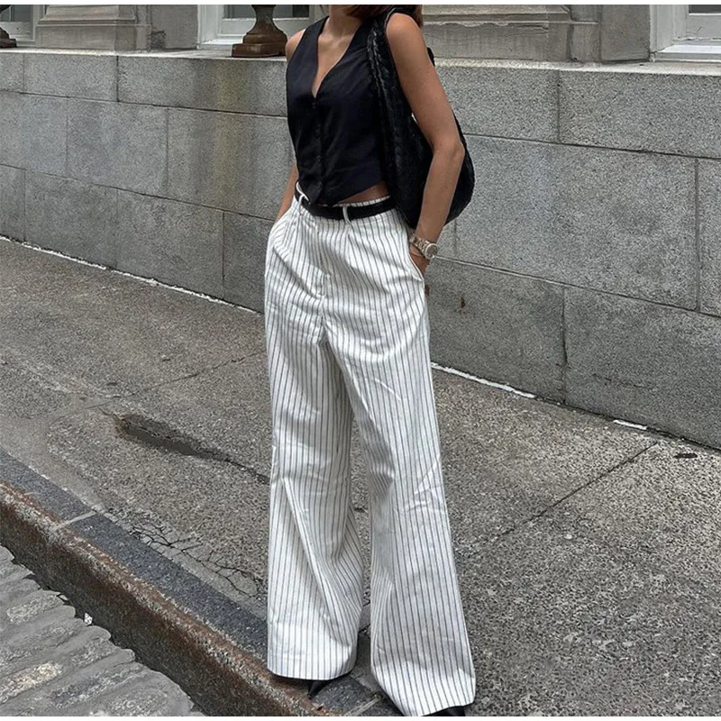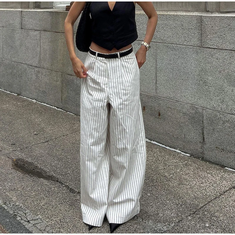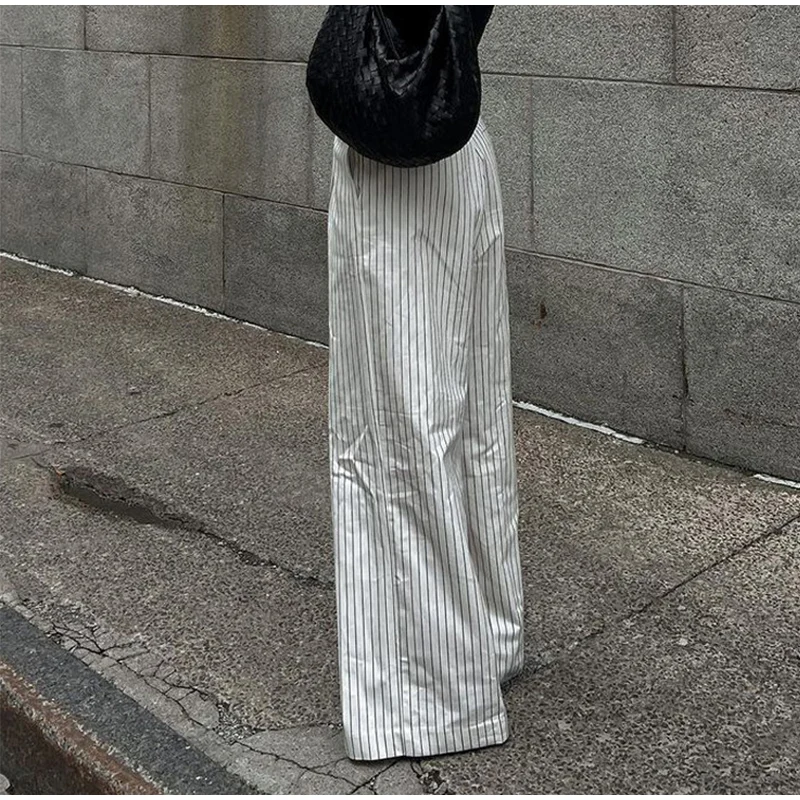 MQTIME - Loose Stripe Print Women's Pants Elegant Office High Waist Long Trousers Female 2025 Autumn Spring Classic Lady Straight Pants