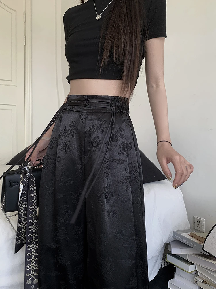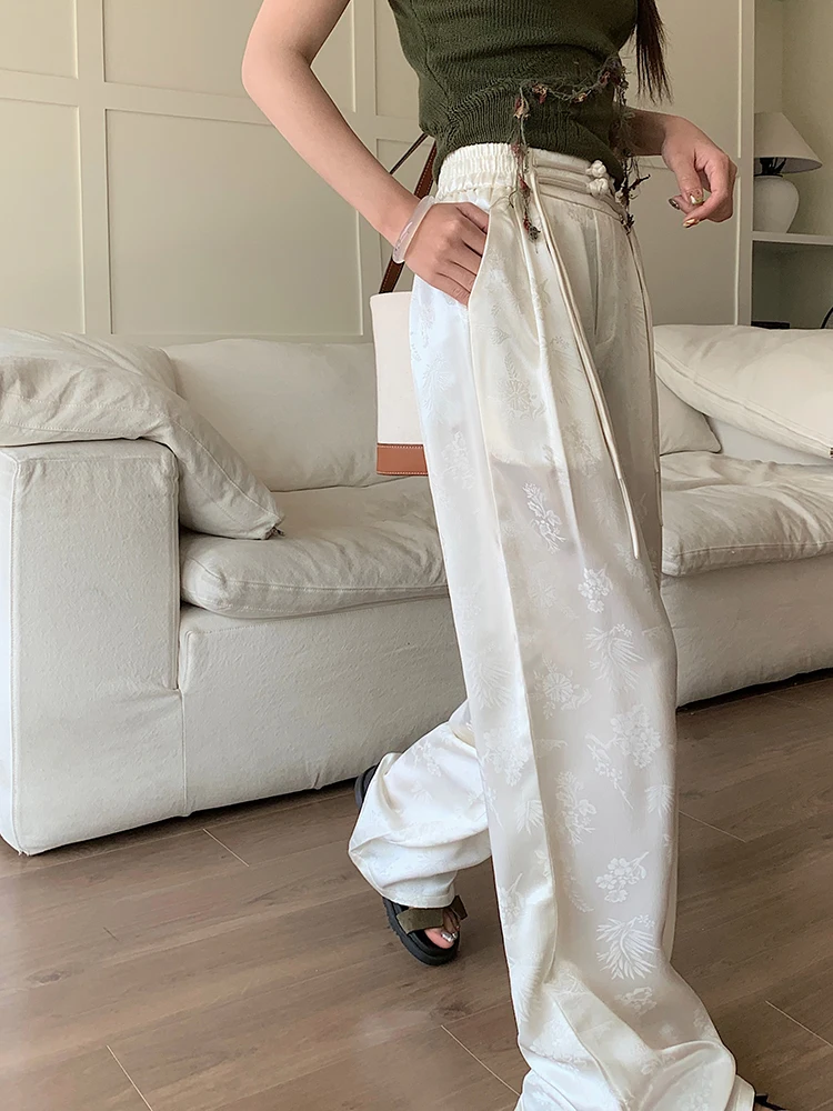MQTIME - Satin Flower Graphic Long Pants Women Elastic High Waisted Wide Leg Pants Chinese Style Fashion Summer Loose Trousers