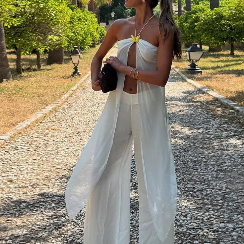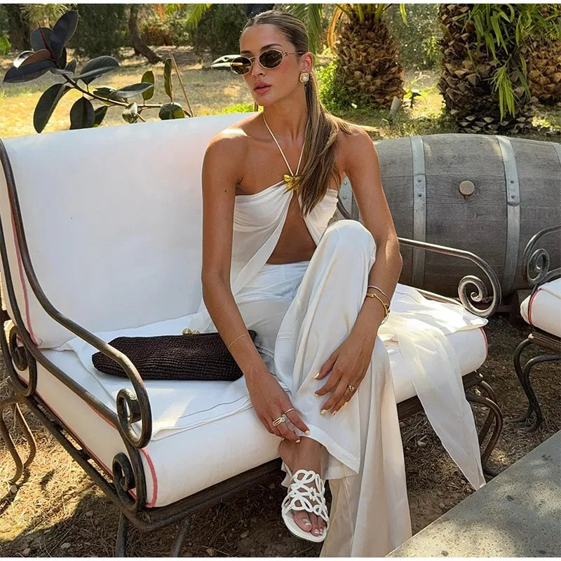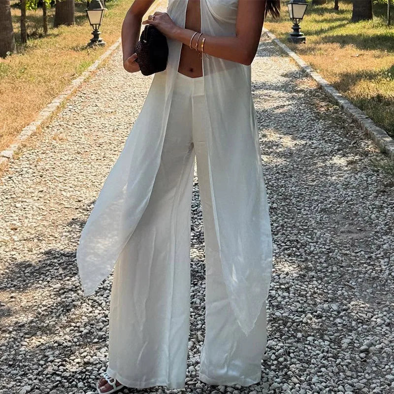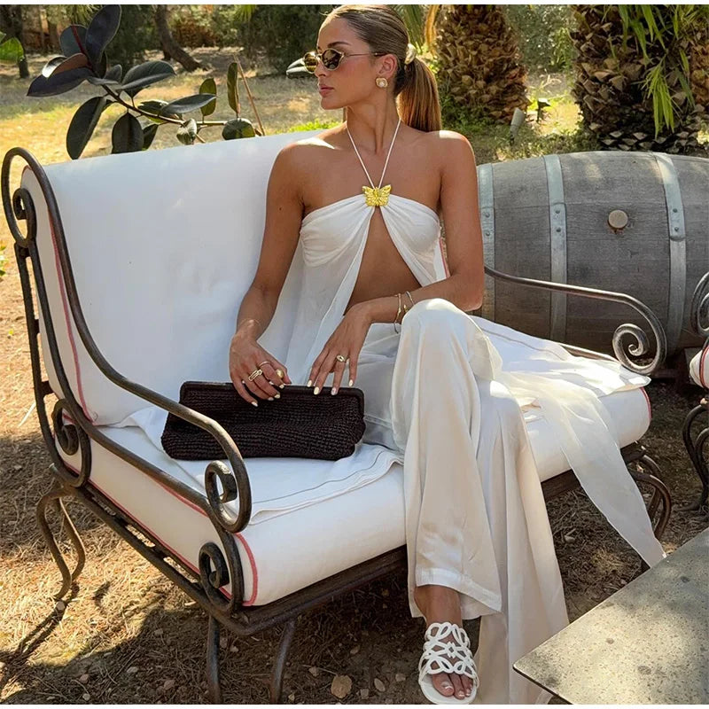 MQTIME - Sexy 3D Flower Halter Tops Pants Set Women See Through Sleeveless Backless Vest Wide Leg Pant 2025 Summer Lady Beach Outfits
