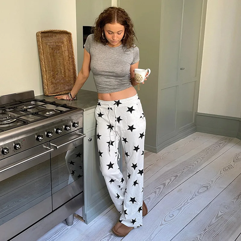 MQTIME - Stars Printed Loose Micro Flare Pants Women American Casual Contrasting Trousers Fashion Leisure Clothing For Female