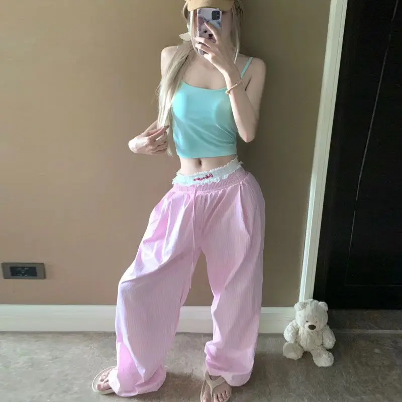 MQTIME - Summer Lazy Style Retro Vertical Stripe Loose Casual Wide Leg Pants Women Clothing Homewear Thin Floor Dragging Long Pants