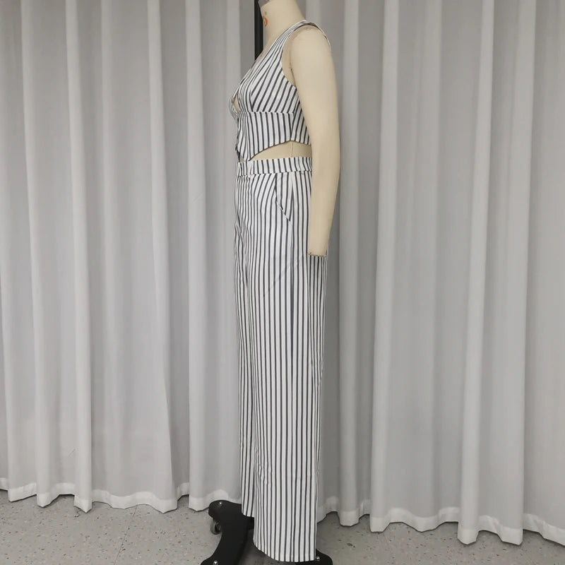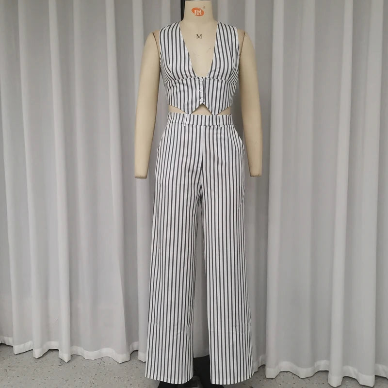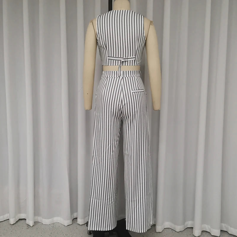 MQTIME - Women 2 Piece Set Summer Office Striped Print Sleeveless V Neck Single Breasted Button Vest Top Loose Wide Legs Pants Set