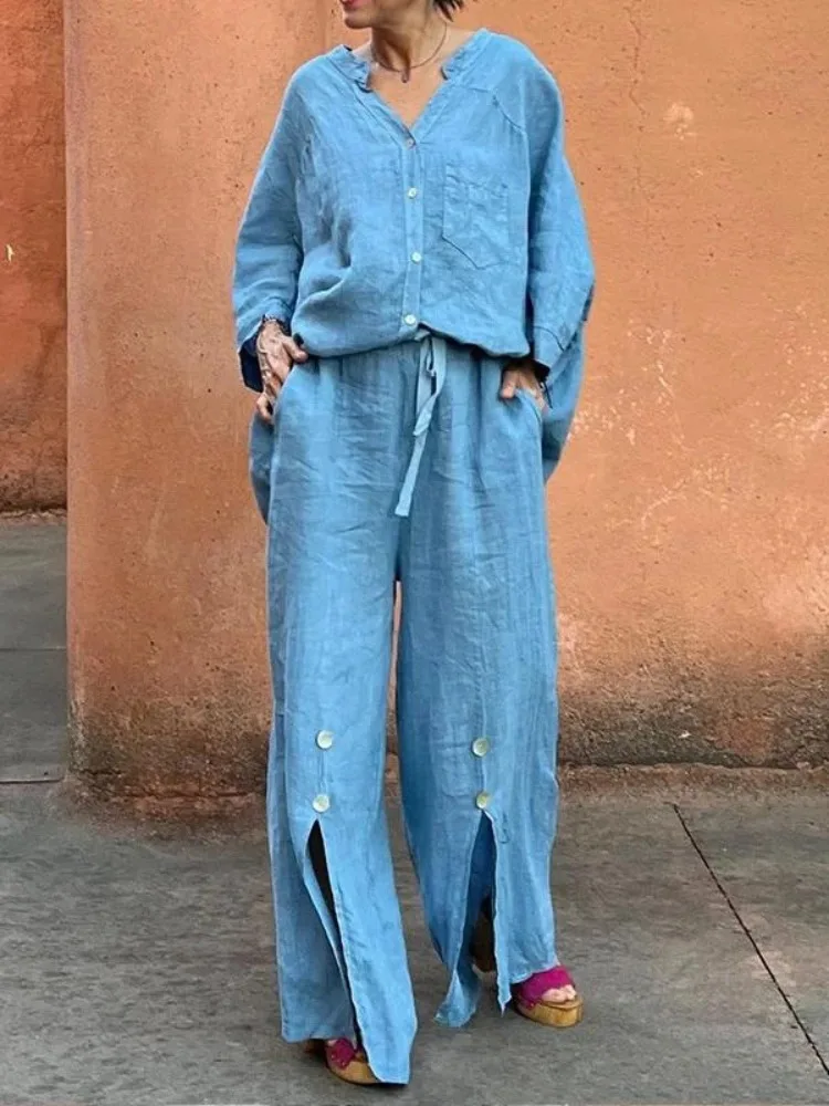 MQTIME - Women's Blue Flowy Wide Leg Pants Drawstring Elastic Waist Split-front Wide Leg Trousers Summer Casual Bottoms